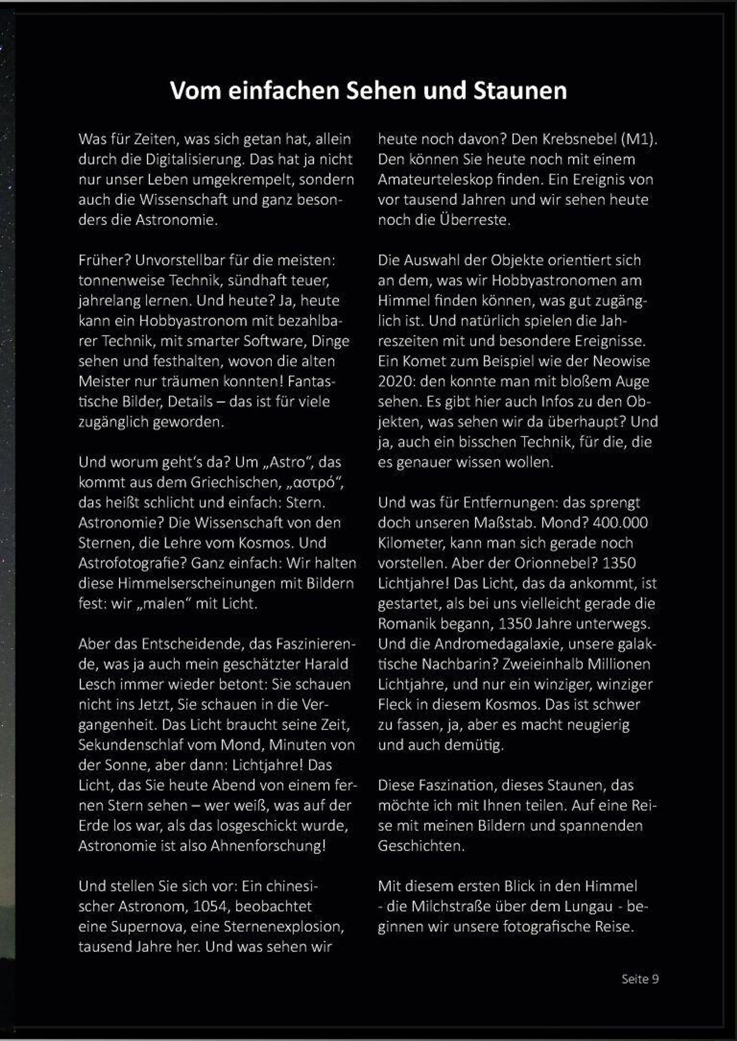Begleiten Sie den Autor, er nimmt Sie mit auf eine fotografische Reise durch dieses unfassbare Universum! Mit eigenen Bildern, die zeigen, was da draußen los ist! Ein bisschen ein Blick hinter die Kulissen der Astrofotografie. Und das Wichtigste: leicht verständliche Erklärungen astronomischer und historischer Zusammenhänge; wir reden auch über die großen Fragen. Ein Erlebnis für Sterngucker und alle, die sich vom Kosmos einfach nur verzaubern lassen wollen.