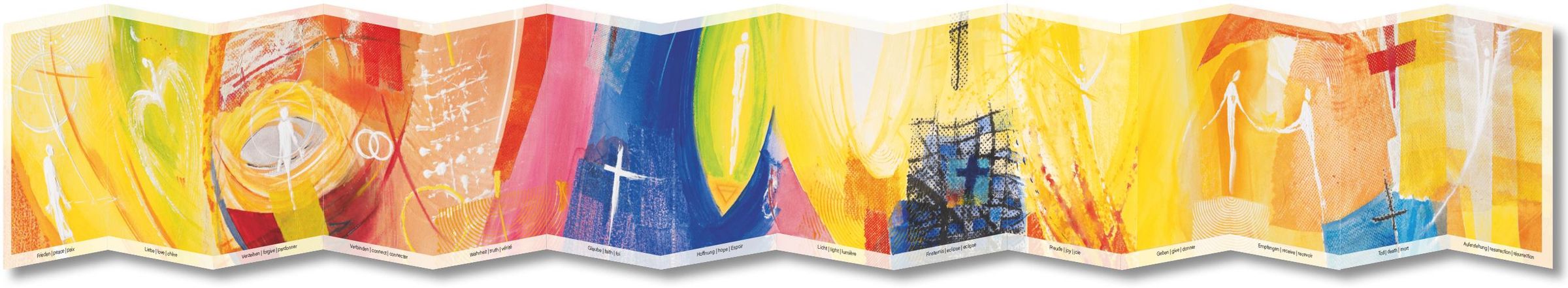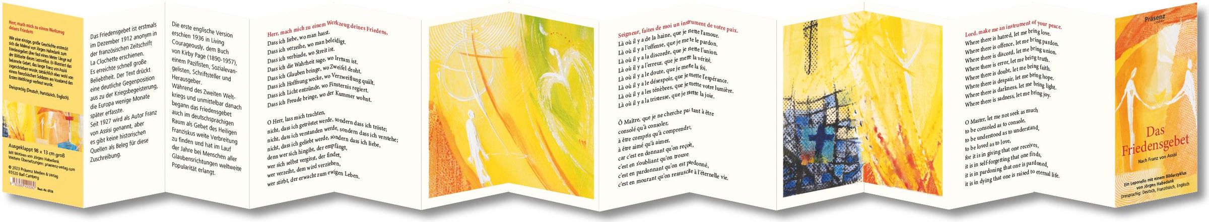 Wie eine einzige, große Geschichte erstreckt sich die Malerei von Jörgen Habedank über fast einen Meter Länge auf der Bildseite dieses Leporellos. Es illustriert das bekannte Gebet, das lange Franz von Assisi zugeschrieben wurde, tatsächlich aber wohl von einem französischen Soldaten am Vorabend des Ersten Weltkriegs verfasst wurde.