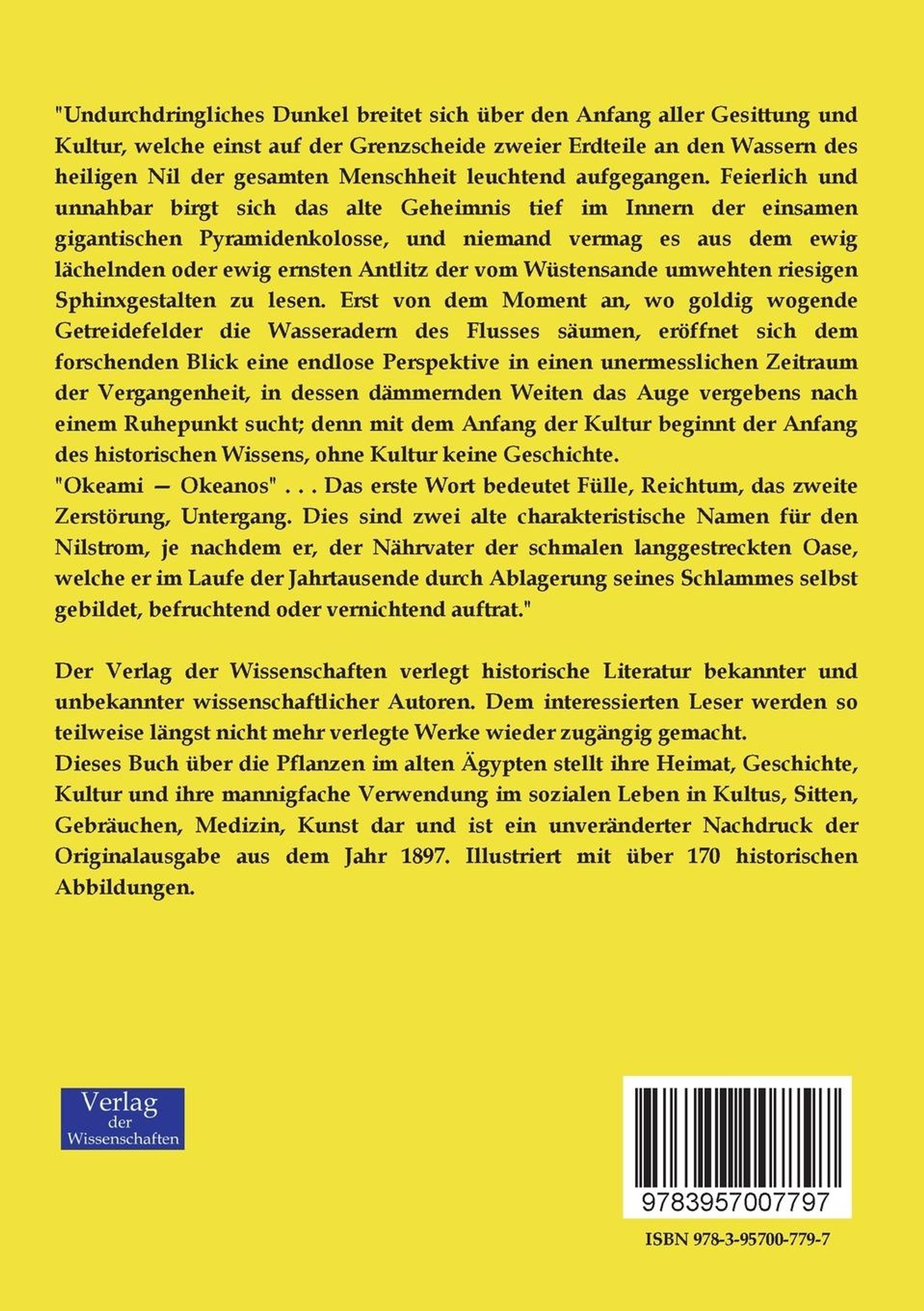 Der Verlag der Wissenschaften verlegt historische Literatur bekannter und unbekannter wissenschaftlicher Autoren. Dem interessierten Leser werden so teilweise längst nicht mehr verlegte Werke wieder zugängig gemacht. Dieses Buch über die Pflanzen im alten Ägypten stellt ihre Heimat, Geschichte, Kultur und ihre mannigfache Verwendung im sozialen Leben in Kultus, Sitten, Gebräuchen, Medizin, Kunst dar und ist ein unveränderter Nachdruck der Originalausgabe aus dem Jahr 1897. Illustriert mit über 170 historischen Abbildungen.