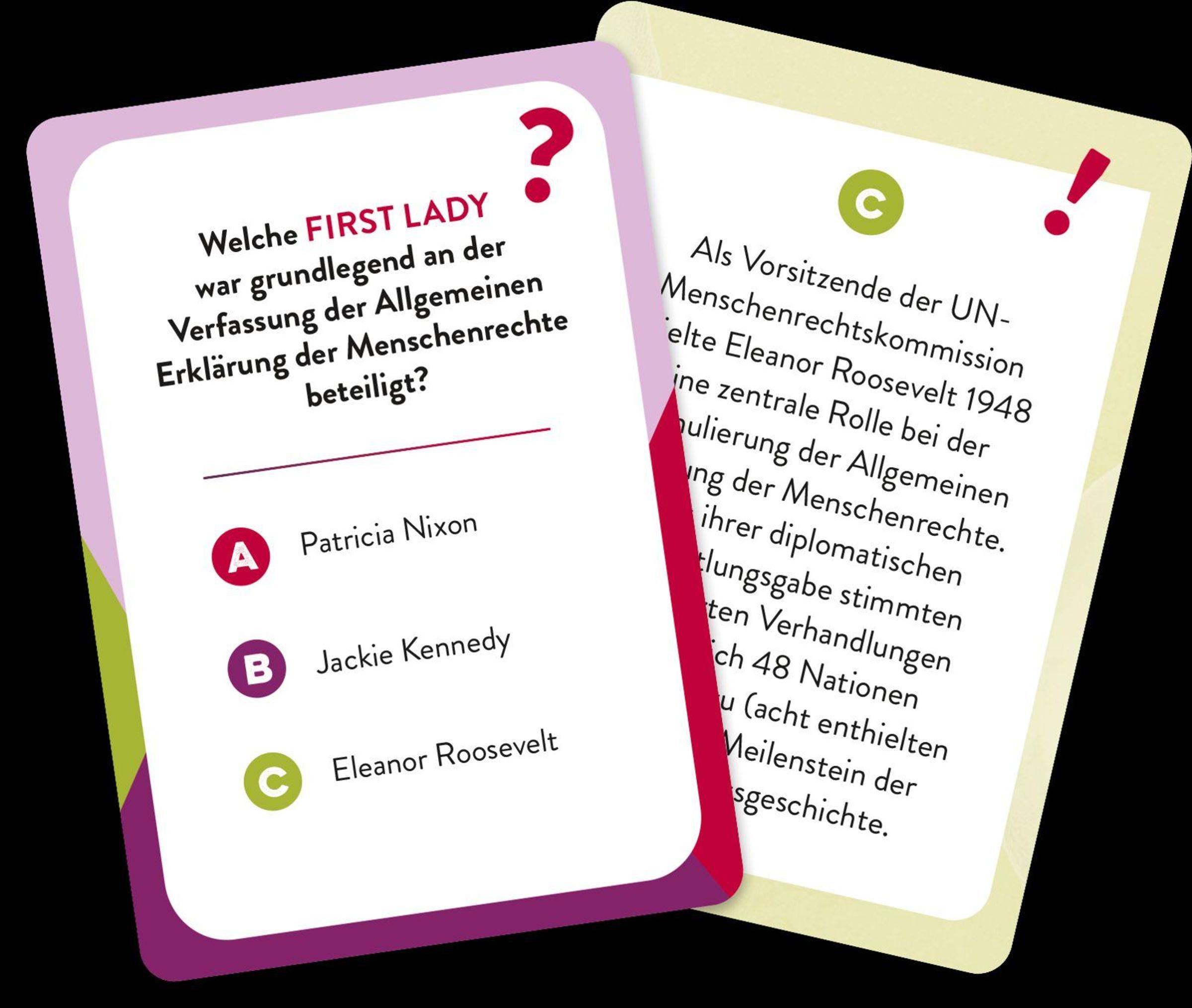 Mische die Karten, ziehe eine und stelle dein Wissen unter Beweis, indem du eine von 50 Fragen beantwortest! Wer am Ende die meisten Karten besitzt, gewinnt. Eine spaßige und lehrreiche Erfahrung, die zeigt, dass Frauen die Welt regieren - oder sie zumindest maßgeblich prägen.