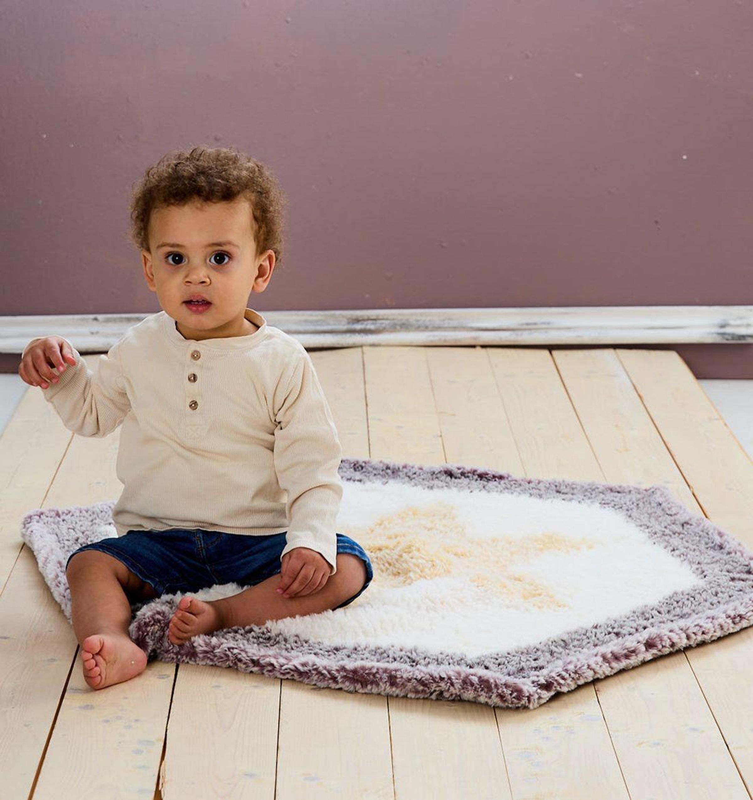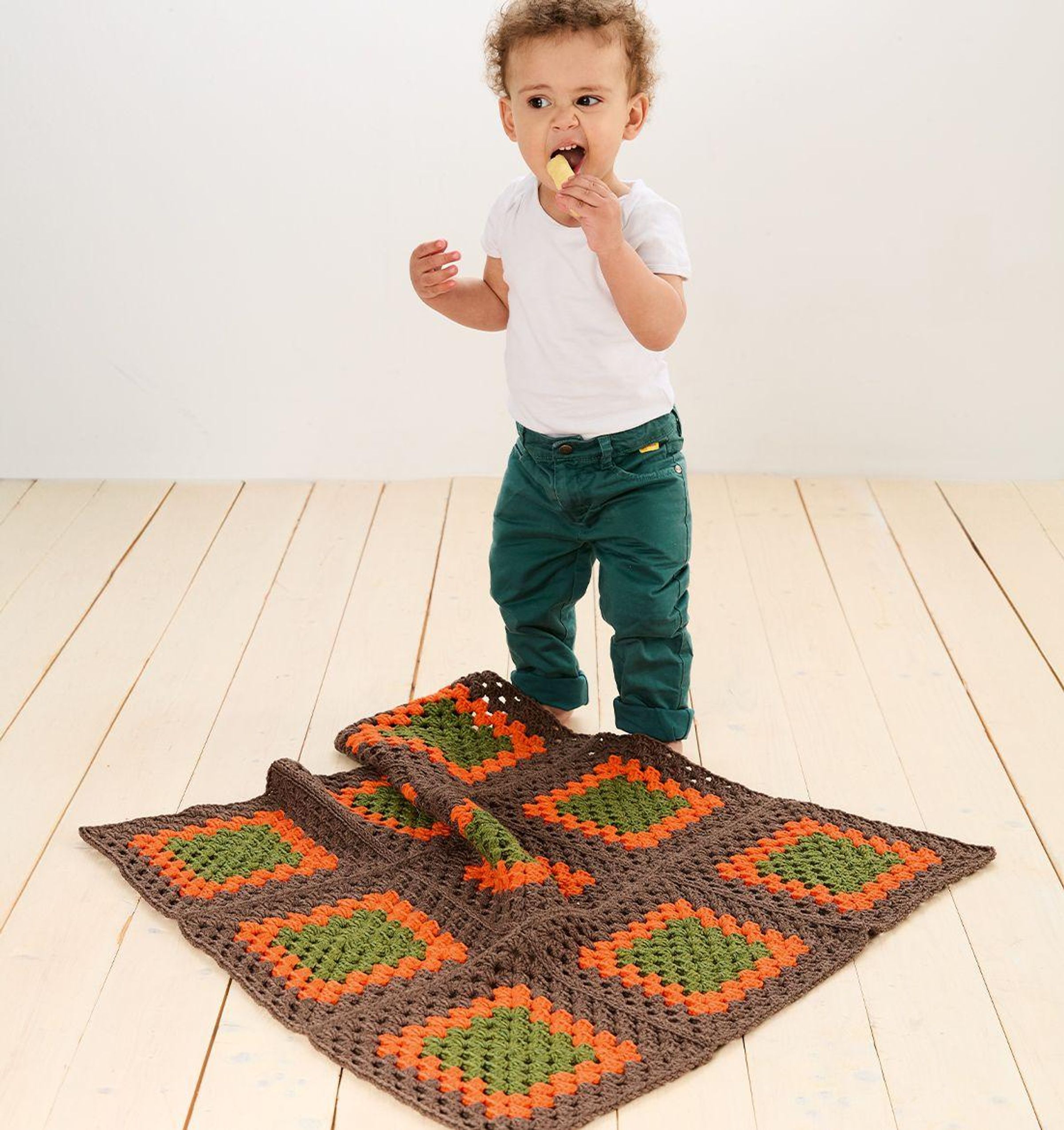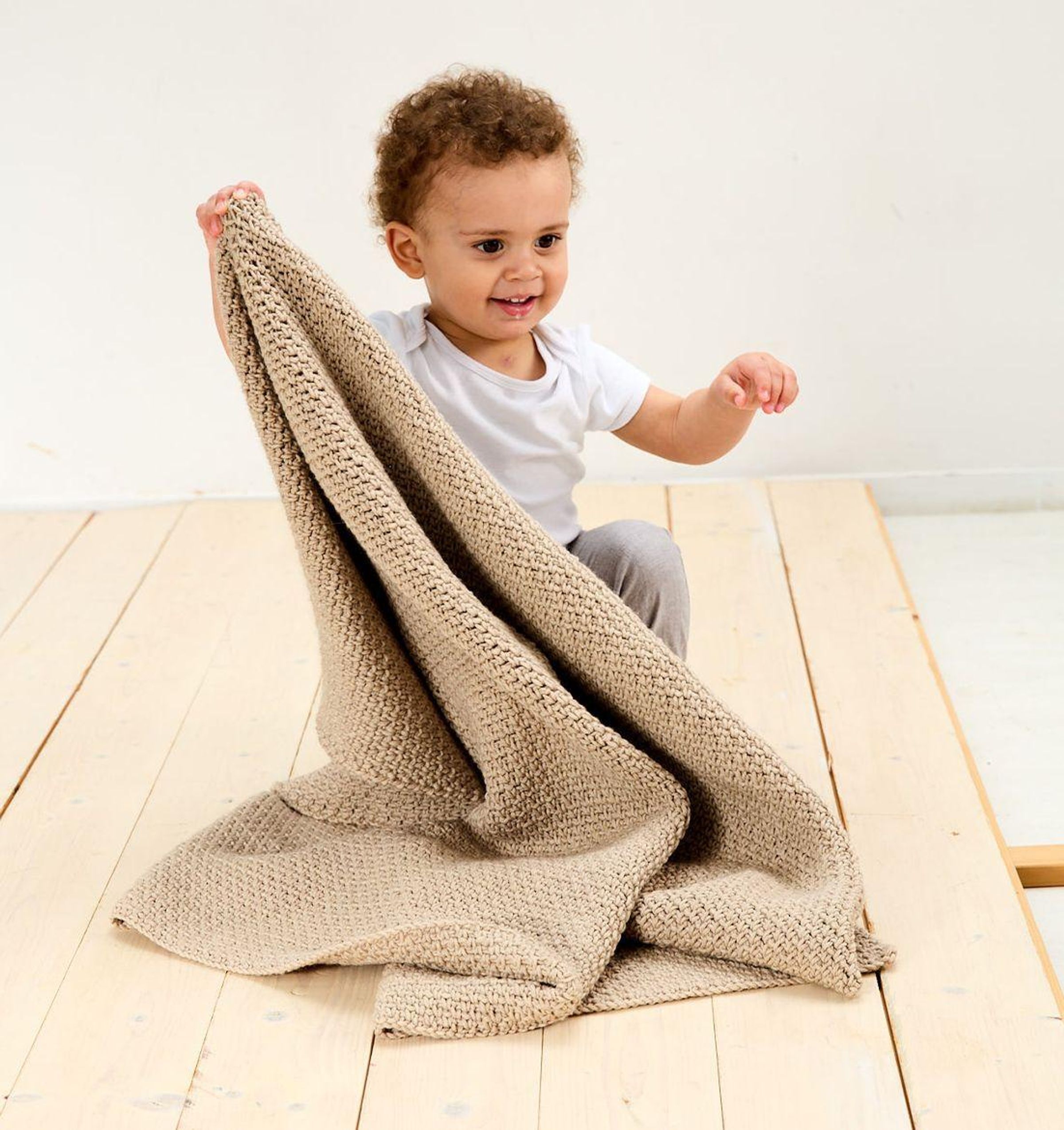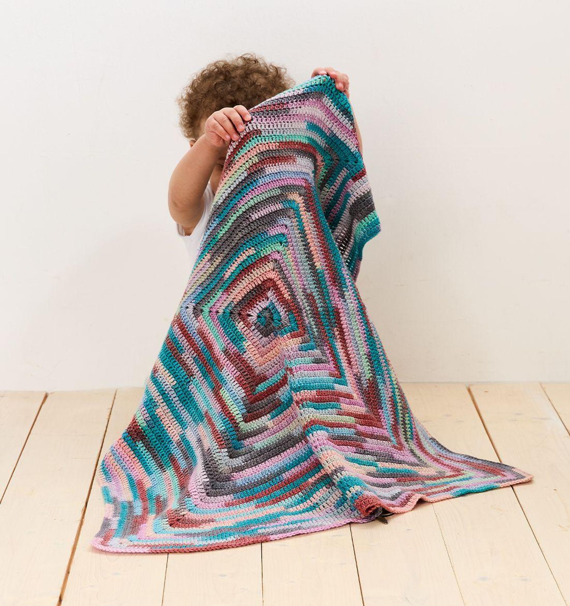 „BABYDECKEN HÄKELN, Passend für jede Jahreszeit“. Ein Kind hält eine bunte, gehäkelte Decke. Links oben ein Logo., Buch