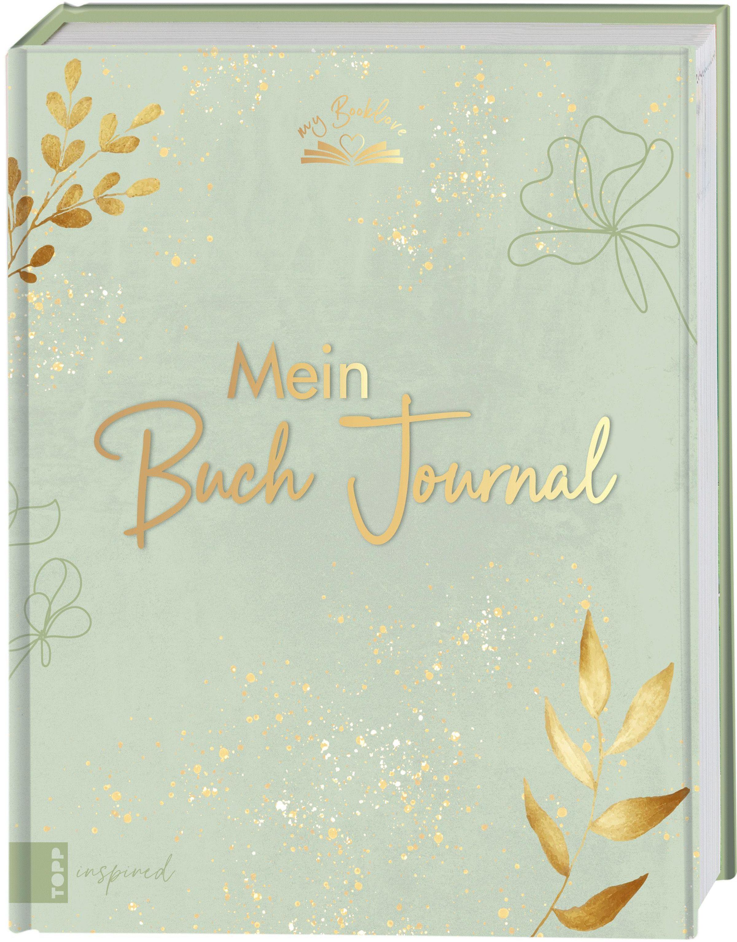 „Mein Buch Journal“ steht in großer Schrift. Das Cover ist grün mit goldenen Blättern und schimmernden Punkten., Buch
