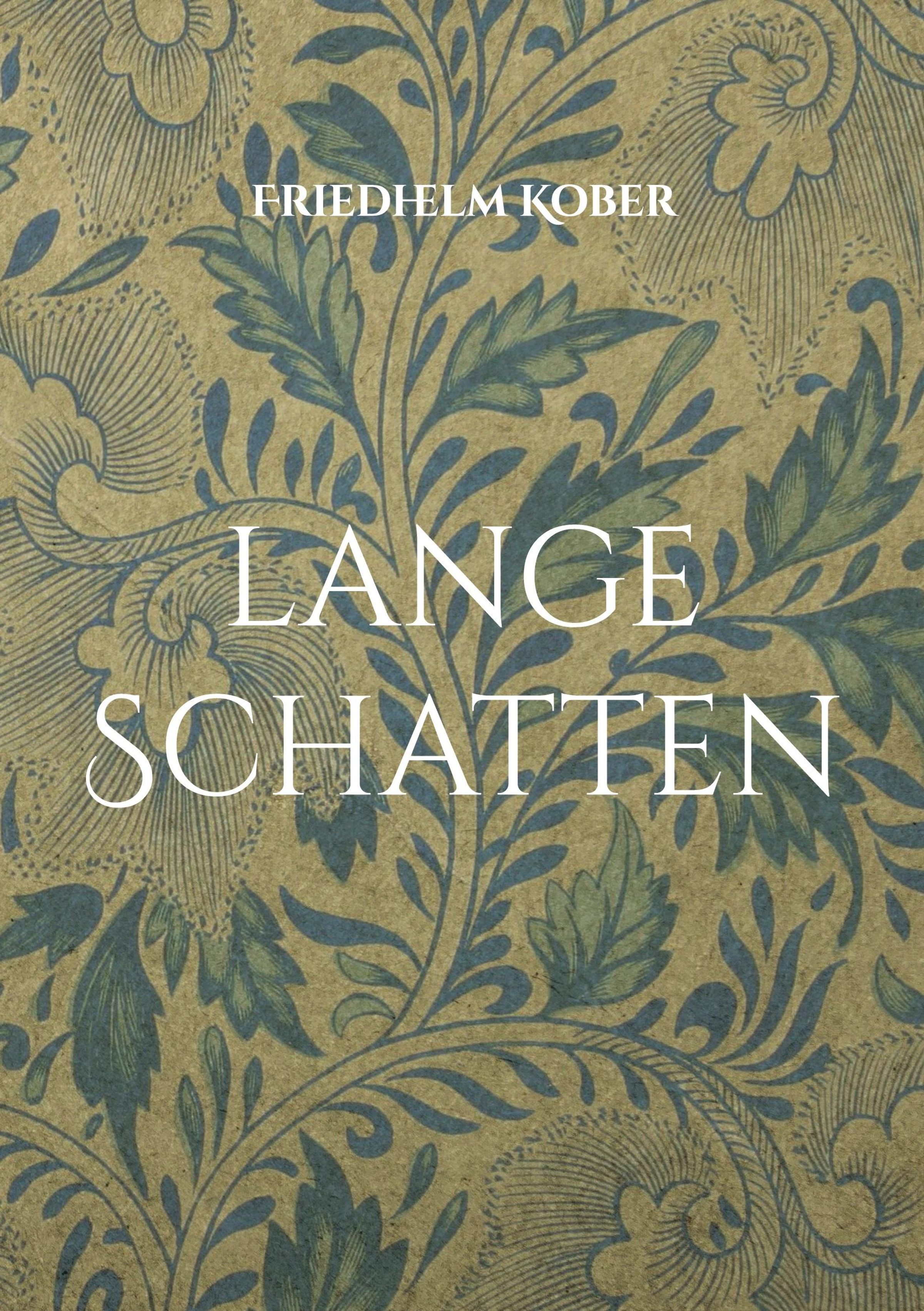 Text: "FRIEDHELM KOBER" und "LANGE SCHATTEN". Hintergrund: florales Muster in Blau- und Grüntönen., Buch