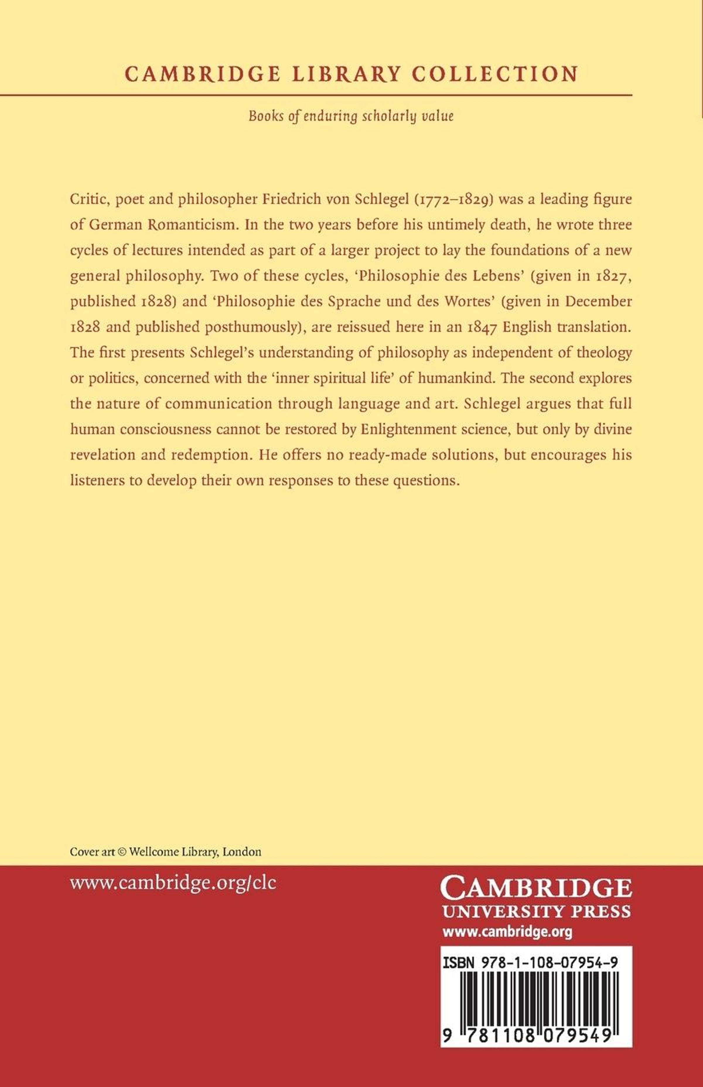 Critic, poet and philosopher Friedrich von Schlegel (1772-1829) was a leading figure of German Romanticism. In the two years before his untimely death, he wrote three cycles of lectures intended as part of a larger project to lay the foundations of a new general philosophy. Two of these cycles, 'Philosophie des Lebens' (given in 1827, published 1828) and 'Philosophie des Sprache und des Wortes' (given in December 1828 and published posthumously), are reissued here in an 1847 English translation. The first presents Schlegel's understanding of philosophy as independent of theology or politics, concerned with the 'inner spiritual life' of humankind. The second explores the nature of communication through language and art. Schlegel argues that full human consciousness cannot be restored by Enlightenment science, but only by divine revelation and redemption. He offers no ready-made solutions, but encourages his listeners to develop their own responses to these questions.