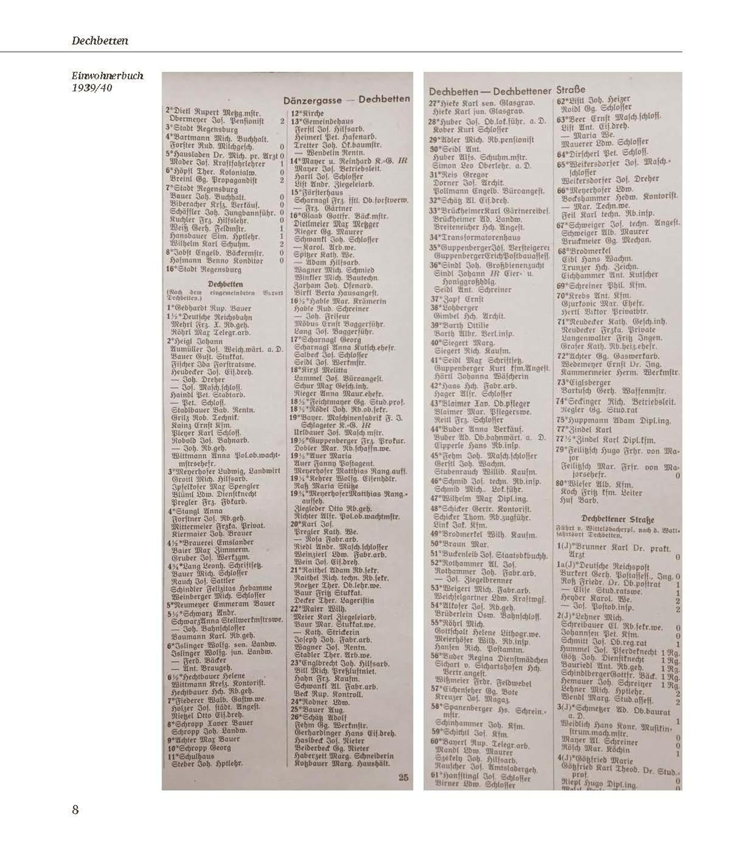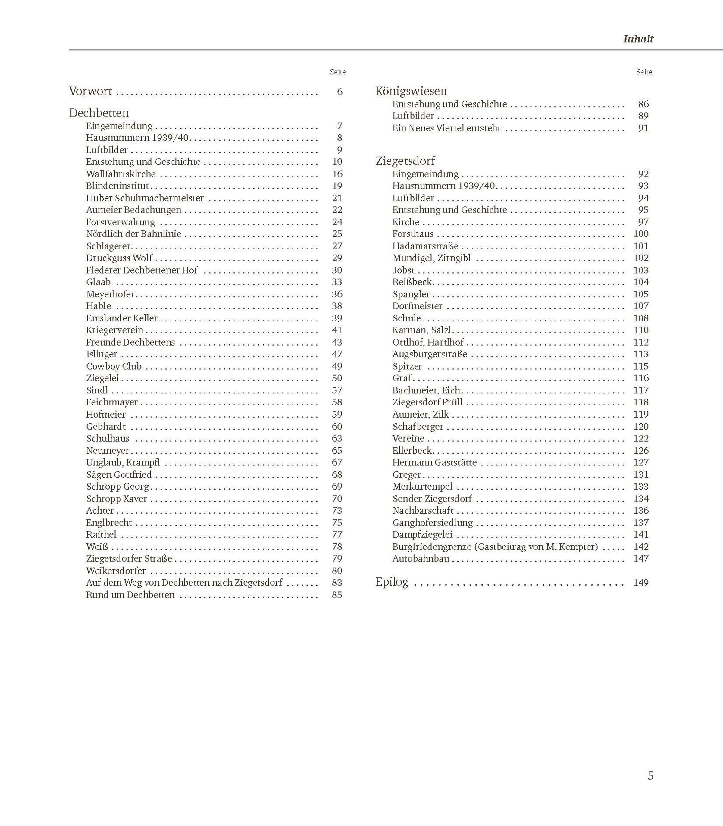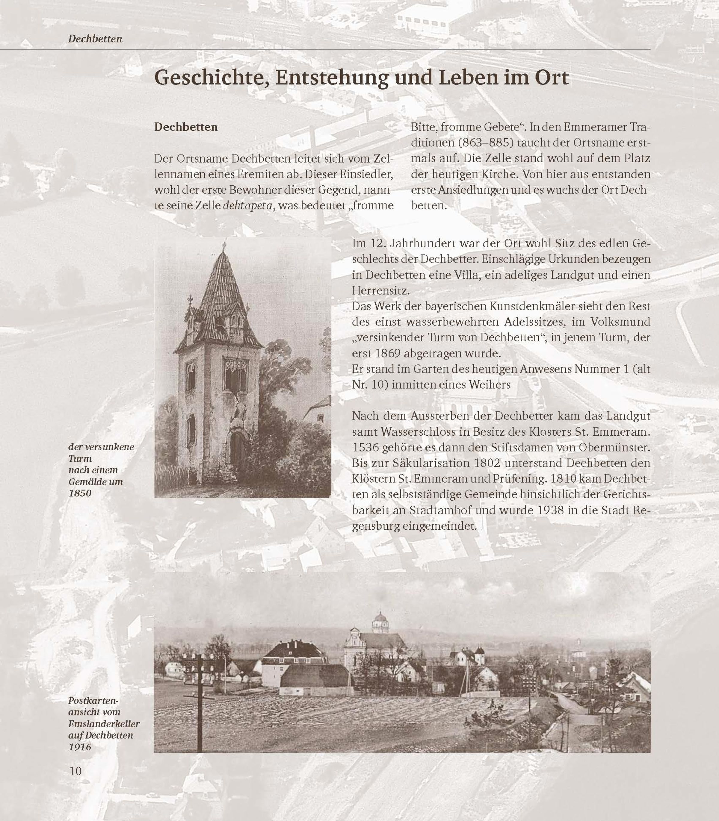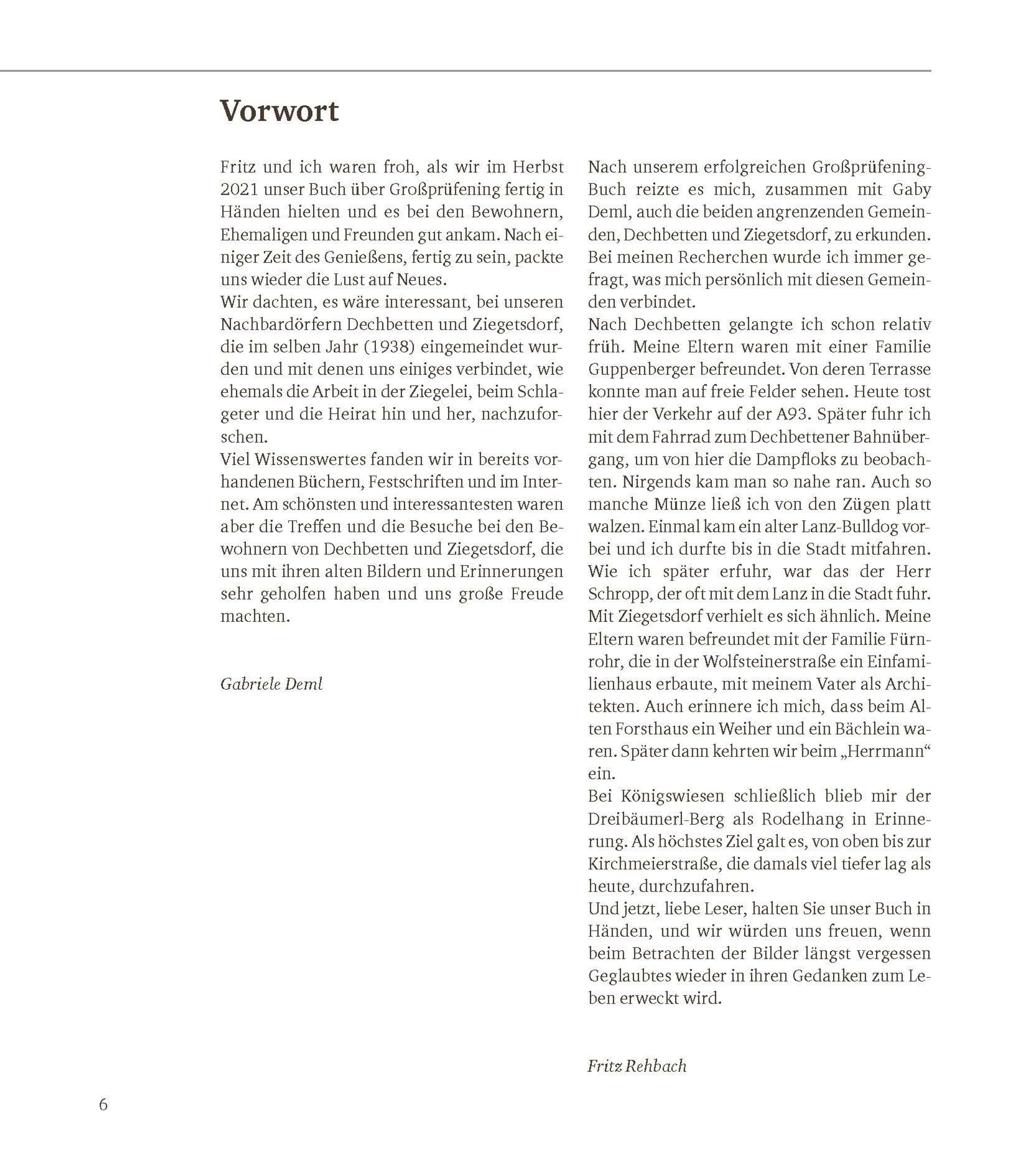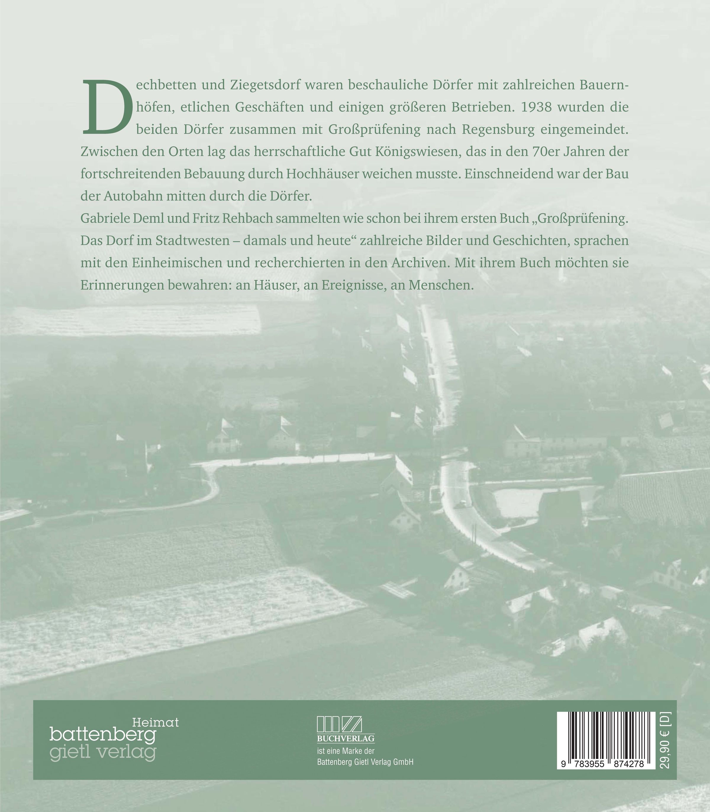 Dechbetten und Ziegetsdorf waren beschauliche Dörfer mit zahlreichen Bauernhöfen, etlichen Geschäften und einigen größeren Betrieben. 1938 wurden die beiden Dörfer zusammen mit Großprüfening nach Regensburg eingemeindet. Zwischen den Orten lag das herrschaftliche Gut Königswiesen, das in den 70er Jahren der fortschreitenden Bebauung durch Hochhäuser weichen musste. Einschneidend war der Bau der Autobahn mitten durch die Dörfer. Gabriele Deml und Fritz Rehbach sammelten wie schon bei ihrem ersten Buch "Großprüfening. Das Dorf im Stadtwesten - damals und heute" zahlreiche Bilder und Geschichten, sprachen mit den Einheimischen und recherchierten in den Archiven. Mit ihrem Buch möchten sie Erinnerungen bewahren: an Häuser, an Ereignisse, an Menschen.