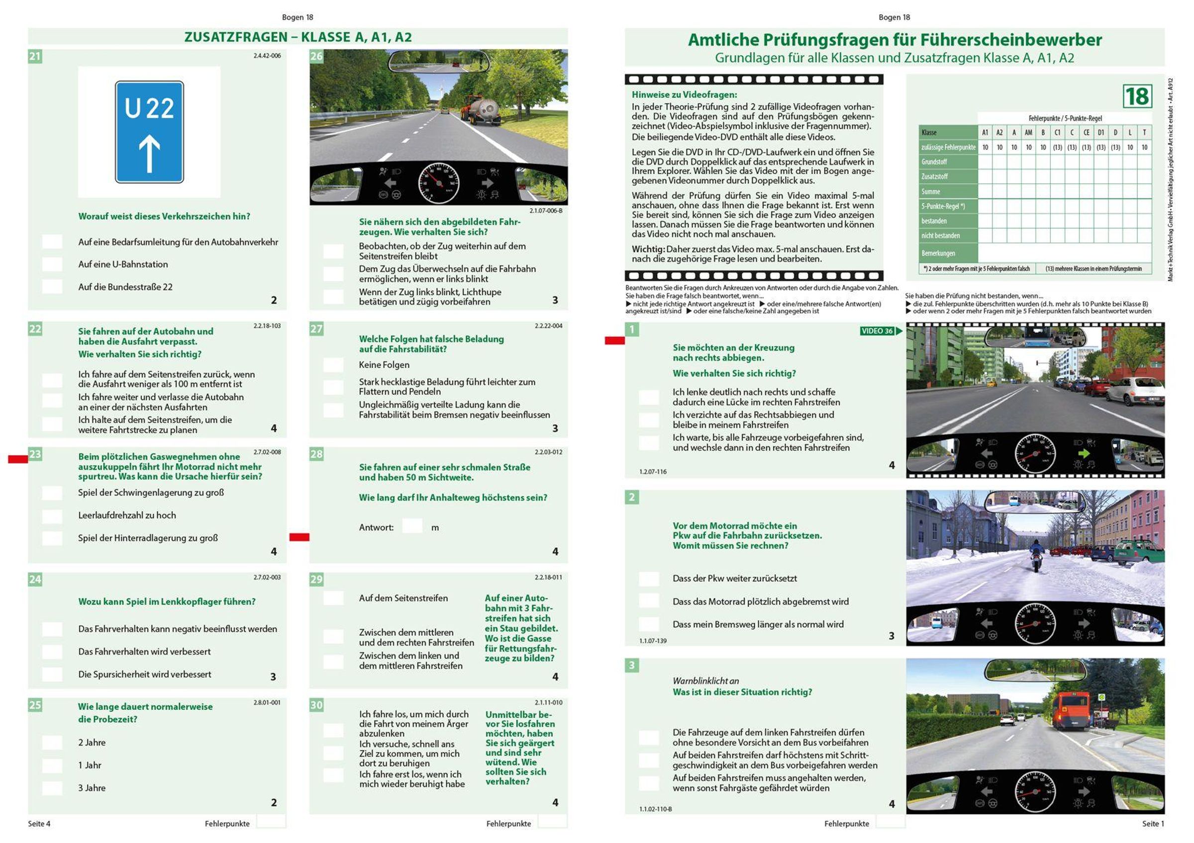 Führerschein Fragebogen Klasse A, A1, A2 - Motorrad Theorieprüfung original amtlicher Fragenkatalog auf 71 Bögen