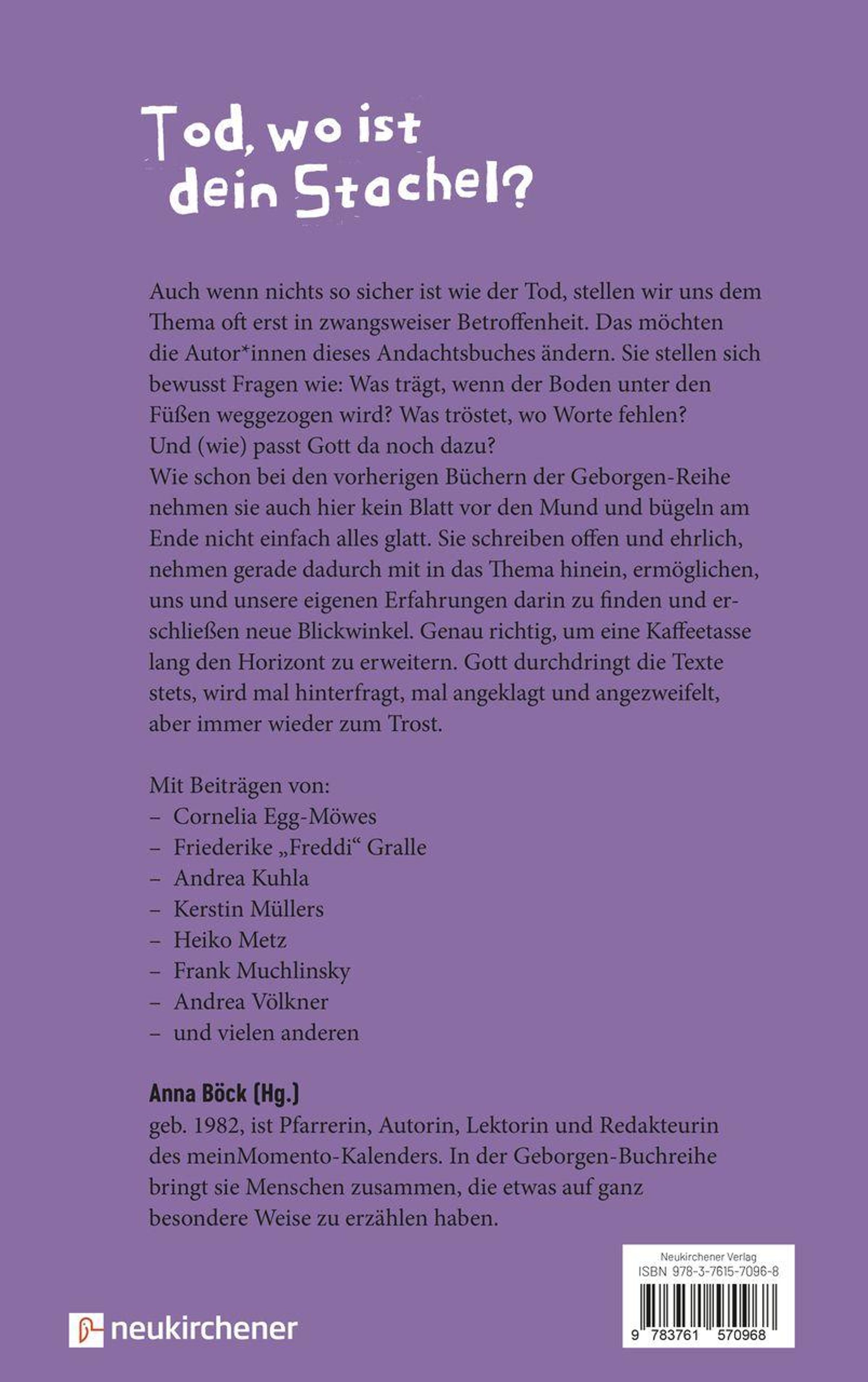 Nichts ist so sicher wie der Tod und doch stellen wir uns dem Thema oft nur in zwangsweiser Betroffenheit. Das möchten die Autor*innen dieses Andachtsbuchprojekts ändern. Wie schon bei den vorherigen Büchern der Geborgen-Reihe nehmen sie auch bei diesem Thema kein Blatt vor den Mund, reden nicht um den heißen Brei und bügeln am Ende nicht einfach alles glatt.