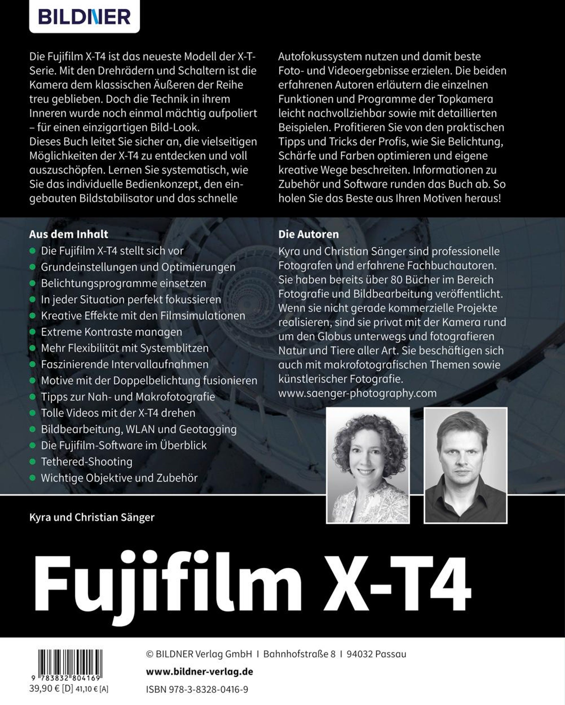 Dieses Buch leitet Sie sicher an, die vielseitigen Möglichkeiten der X-T4 zu entdecken und voll auszuschöpfen. Lernen Sie systematisch , wie Sie das individuelle Bedienkonzept, den eingebauten Bildstabilisator und das schnelle Autofokussystem nutzen und damit beste Foto- und Videoergebnisse erzielen. Die beiden erfahrenen Autoren erläutern die einzelnen Funktionen und Programme der Topkamera leicht nachvollziehbar sowie mit detaillierten Beispielen . Profitieren Sie von den praktischen Tipps und Tricks der Profis, wie Sie Belichtung, Schärfe und Farben optimieren und eigene kreative Wege beschreiten. Informationen zu Zubehör und Software runden das Buch ab. So holen Sie das Beste aus Ihren Motiven heraus!
