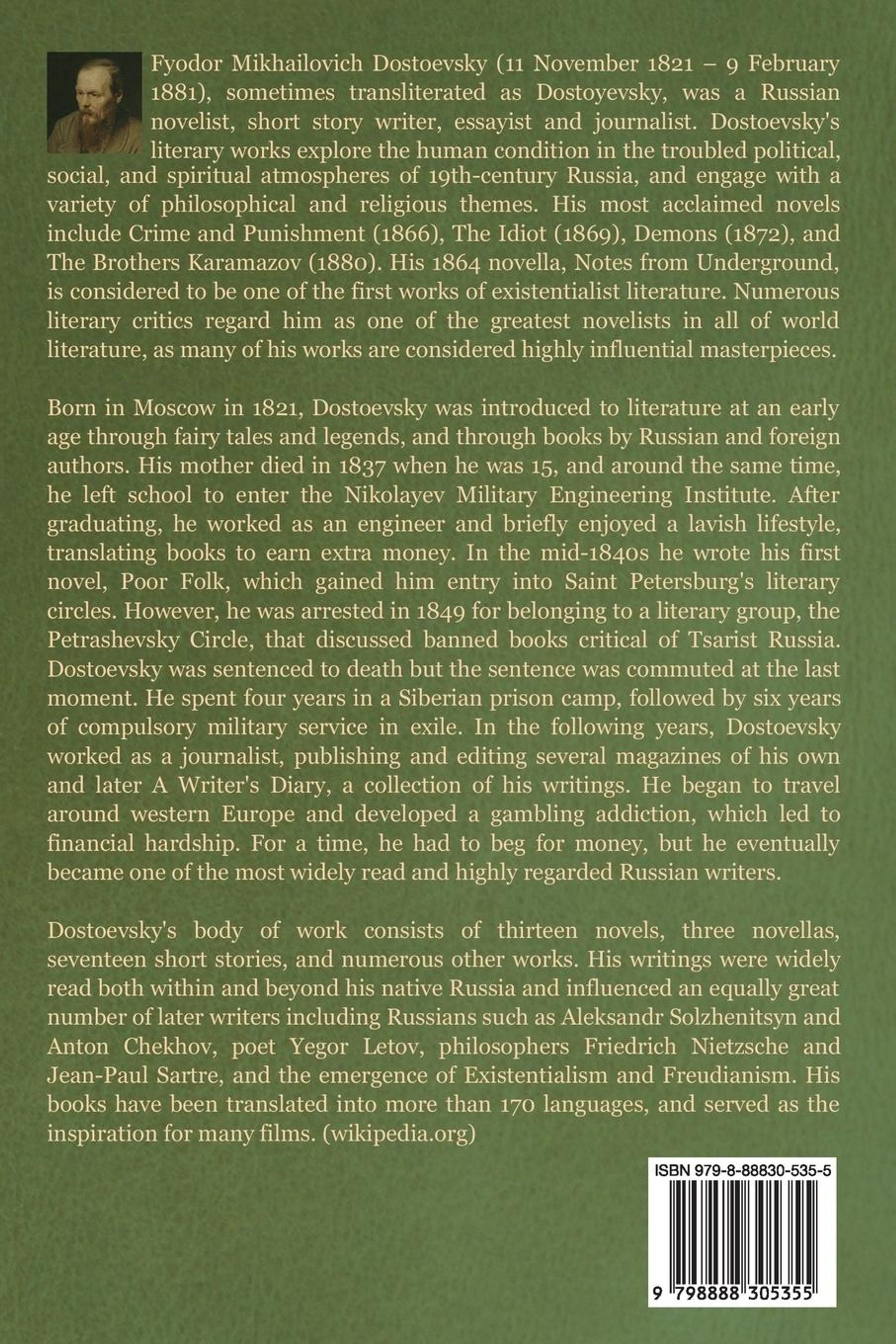 About the author: Fyodor Mikhailovich Dostoevsky (11 November 1821 - 9 February 1881), sometimes transliterated as Dostoyevsky, was a Russian novelist, short story writer, essayist and journalist. Dostoevsky's literary works explore the human condition in the troubled political, social, and spiritual atmospheres of 19th-century Russia, and engage with a variety of philosophical and religious themes. His most acclaimed novels include Crime and Punishment (1866), The Idiot (1869), Demons (1872), and The Brothers Karamazov (1880). His 1864 novella, Notes from Underground, is considered to be one of the first works of existentialist literature. Numerous literary critics regard him as one of the greatest novelists in all of world literature, as many of his works are considered highly influential masterpieces.