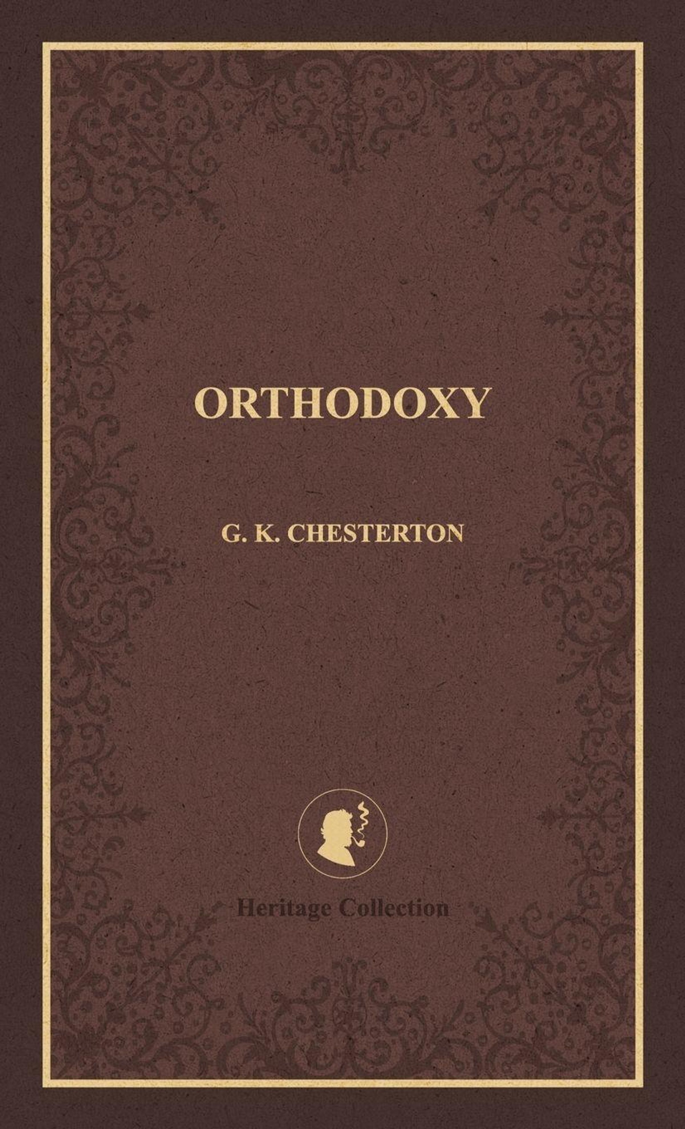 „ORTHODOXY“ von G. K. Chesterton. Braunes Muster, „Heritage Collection“-Logo: Silhouette mit Pfeife., Buch
