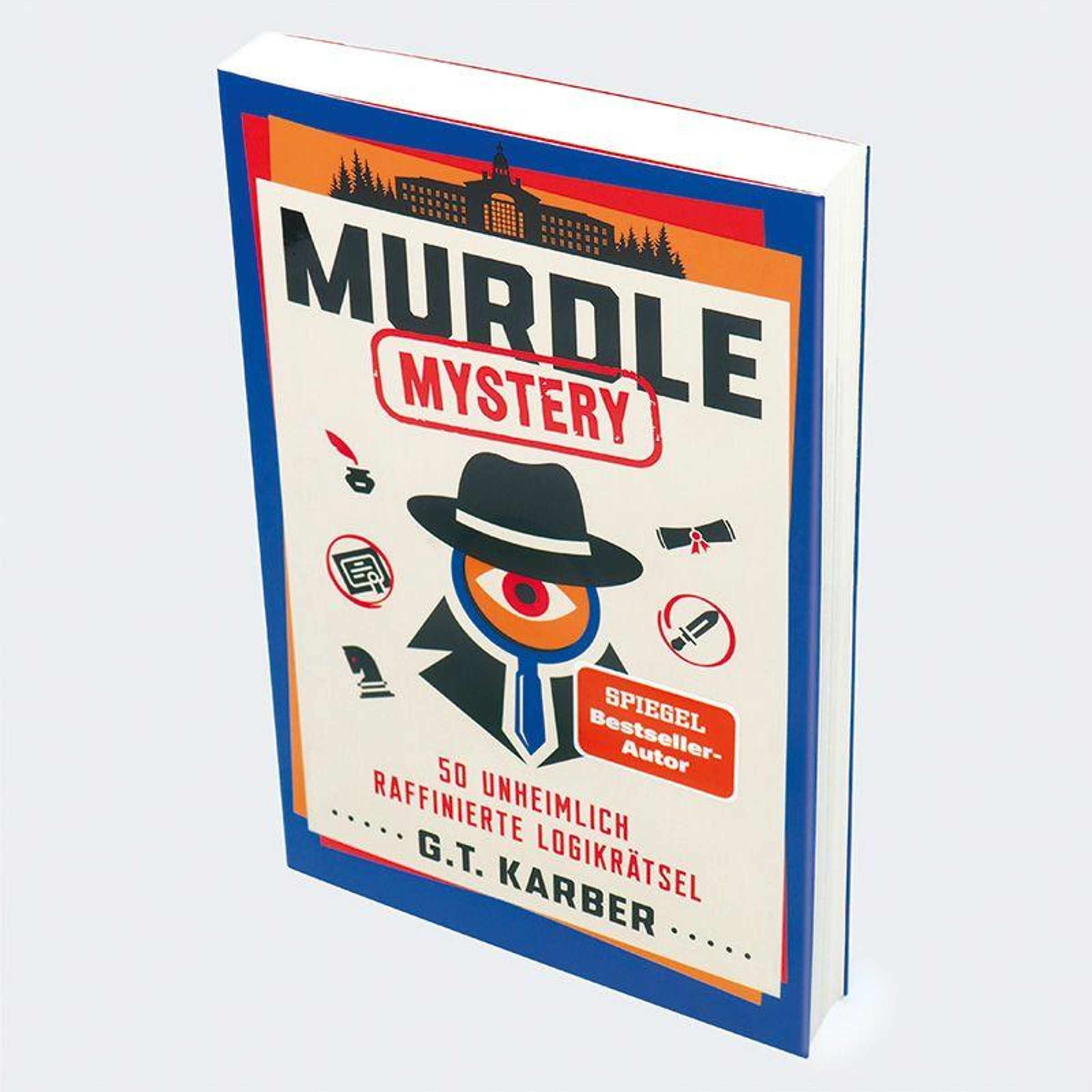 „MURDLE MYSTERY: 50 Unheimlich Raffinierte Logikrätsel“ von G.T. Karber. Detektivillustration mit Hut und Lupe., Buch