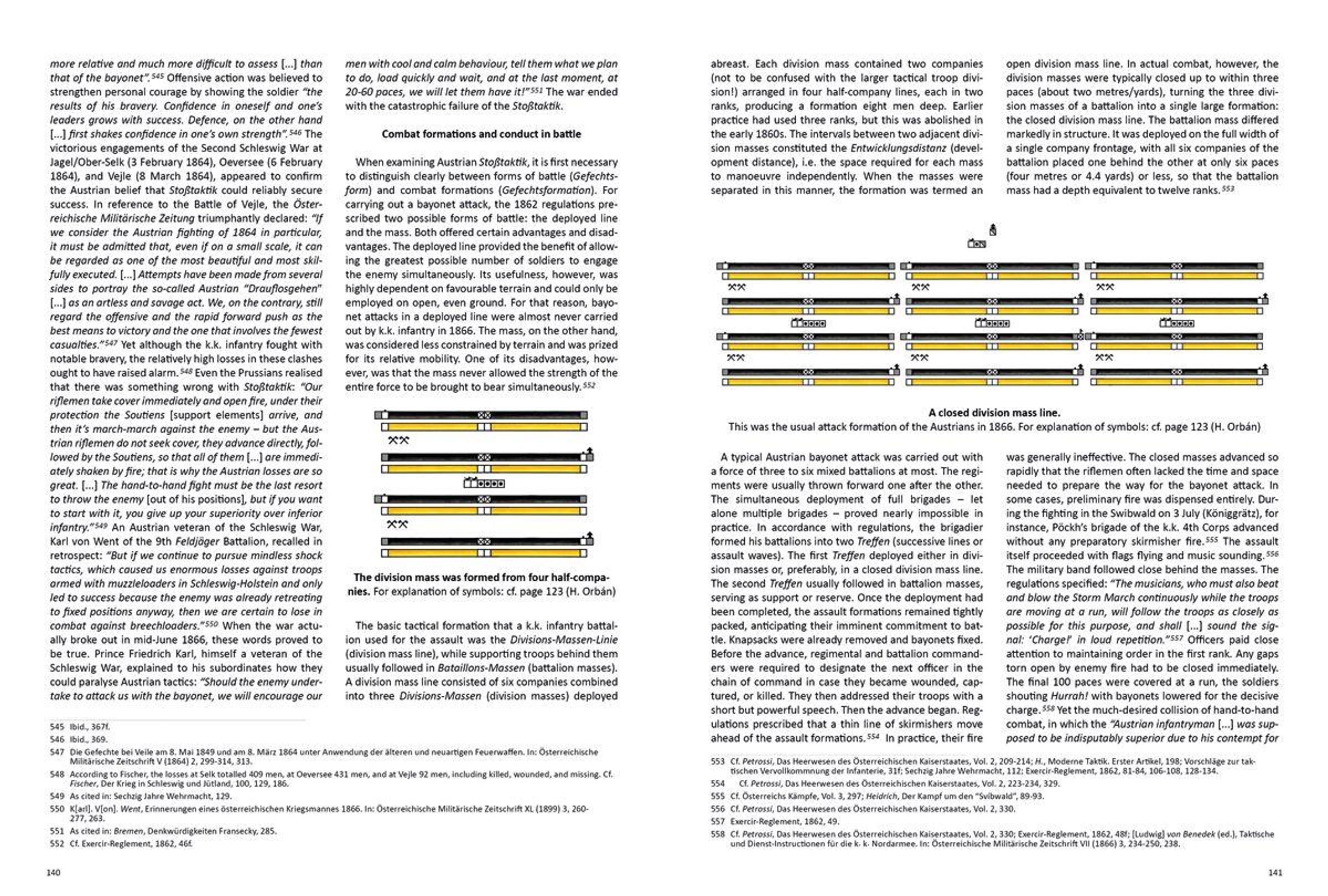 The scholarly inquiry of the 'causes' of Austria's defeat in 1866 is almost as old as the war against rising Prussia itself. Already in the immediate aftermath of the conflict, considerable energy was devoted to identifying the sources of failure. At the time, responsibility was attributed to the misjudgements of the high command, and above all to the commander-in-chief of the k. k. North Army, Feldzeugmeister Ludwig von Benedek. This one-sided interpretation, together with the broader debate surrounding the so-called 'question of guilt' (Schuldfrage), was later treated with increasing nuance. During the twentieth century, historians sought the origins of the defeat at both political and military levels. From a military perspective, research has primarily examined developments in armaments technology, the (strategic-) operational miscalculations of the campaign, and the structural deficiencies of the k. k. Army, which stemmed in large part from severe budgetary restrictions. By contrast, comparatively little attention has been devoted to battle tactics. In 1866, Austria entered the war against Prussia with a tactical doctrine nearly sixty years old, based on an overestimation of the historical tradition of military values. This volume examines precisely this neglected aspect. Within the broader context of armed conflicts since the Revolutionary and Napoleonic Wars against France, it introduces and systematically analyses Austrian military doctrine, with particular emphasis on tactics. The study critically examines the outdated systems of recruitment and training, while also considering the related fields of uniforms and equipment, soldiers' daily life, and military communication. The investigation, however, focuses primarily on two main themes: first, the Austrians' disdain for the employment of firearms; and second, their unshakeable belief in the invincibility of their own close-order battle formations. The bayonet charge, in particular, was accorded a special and almost emblematic status. The volume further explores the interaction between the various arms in wartime and highlights the complex interrelationship between strategic and tactical concepts. It becomes clear that the k. k.. Austrian Army was among the very last of the truly 'Napoleonic' forces; an army whose admirable courage could no longer compensate for hopelessly outdated infantry tactics in the age of industrialised warfare.