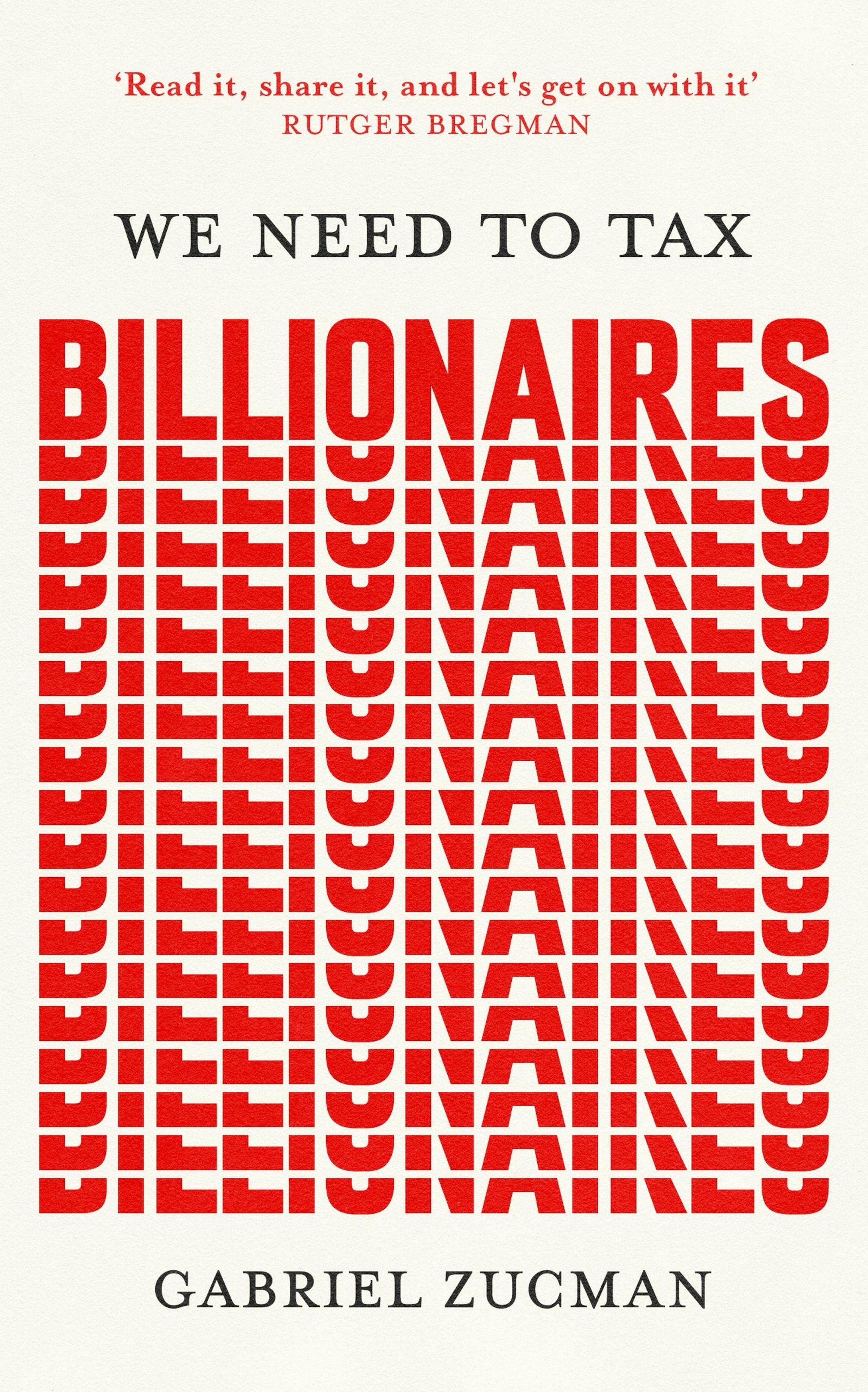 „Read it, share it“ – Rutger Bregman. „We Need To Tax Billionaires“. „Gabriel Zucman“. Roter Text in Blockschrift., Buch