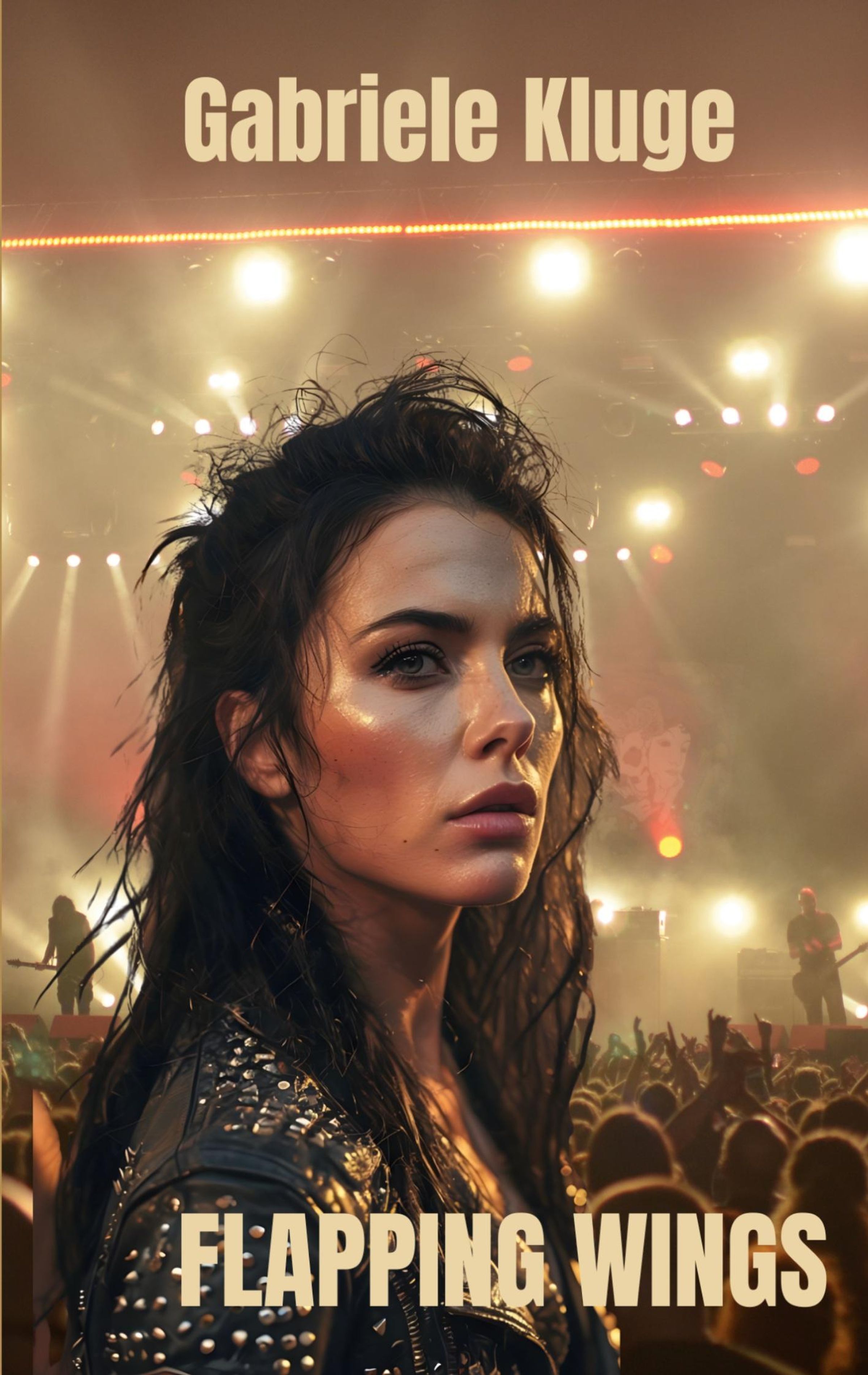 "Gabriele Kluge" und "FLAPPING WINGS" stehen über einem Porträt einer Frau vor einer Konzertbühne mit Lichtern., Buch