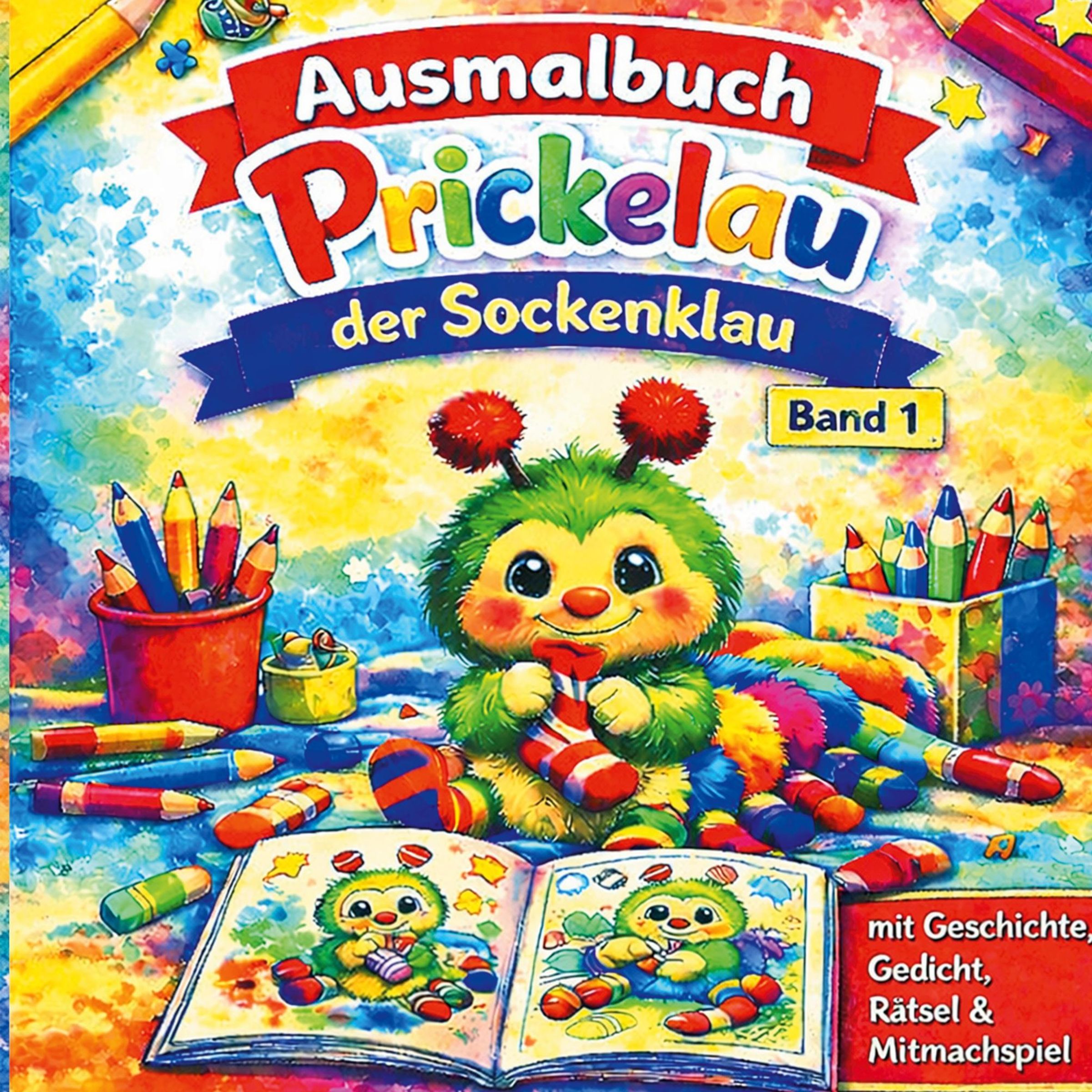 Buntes Ausmalbuch-Cover von "Prickelau der Sockenklau", Band 1. Mit grüner, flauschiger Raupe und vielen Buntstiften., Buch