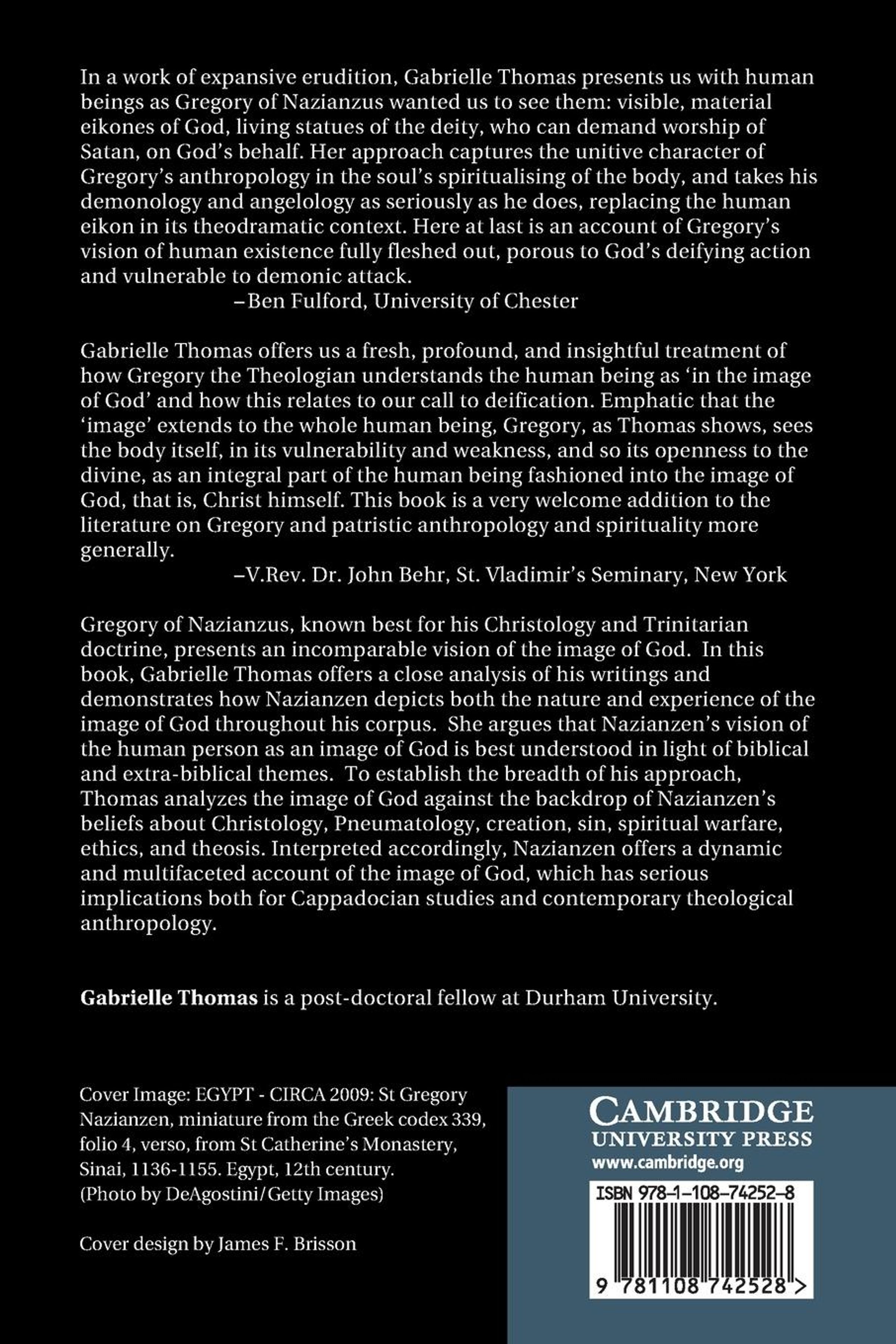 Gregory of Nazianzus, known best for his Christology and Trinitarian doctrine, presents an incomparable vision of the image of God. In this book, Gabrielle Thomas offers a close analysis of his writings and demonstrates how Nazianzen depicts both the nature and experience of the image of God throughout his corpus. She argues that Nazianzen's vision of the human person as an image of God is best understood in light of biblical and extra-biblical themes. To establish the breadth of his approach, Thomas analyzes the image of God against the backdrop of Nazianzen's beliefs about Christology, Pneumatology, creation, sin, spiritual warfare, ethics, and theosis. Interpreted accordingly, Nazianzen offers a dynamic and multifaceted account of the image of God, which has serious implications both for Cappadocian studies and contemporary theological anthropology.