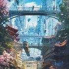 "2027 • Gal Barkan, FUTURE CITIES." Illustration: Futuristische Stadt mit Brücken, Flugobjekten, Kirschblüten, asiatischer Architektur., Kalender
