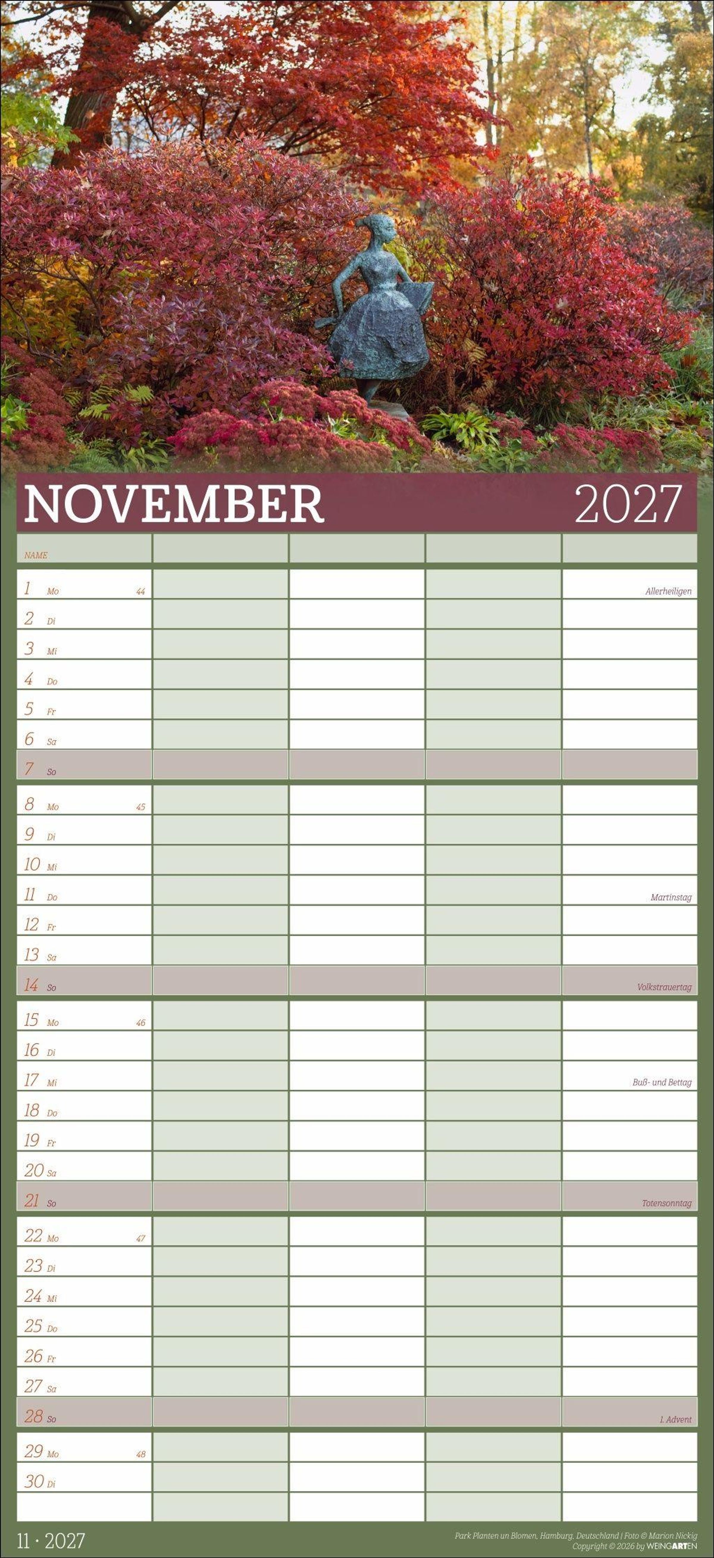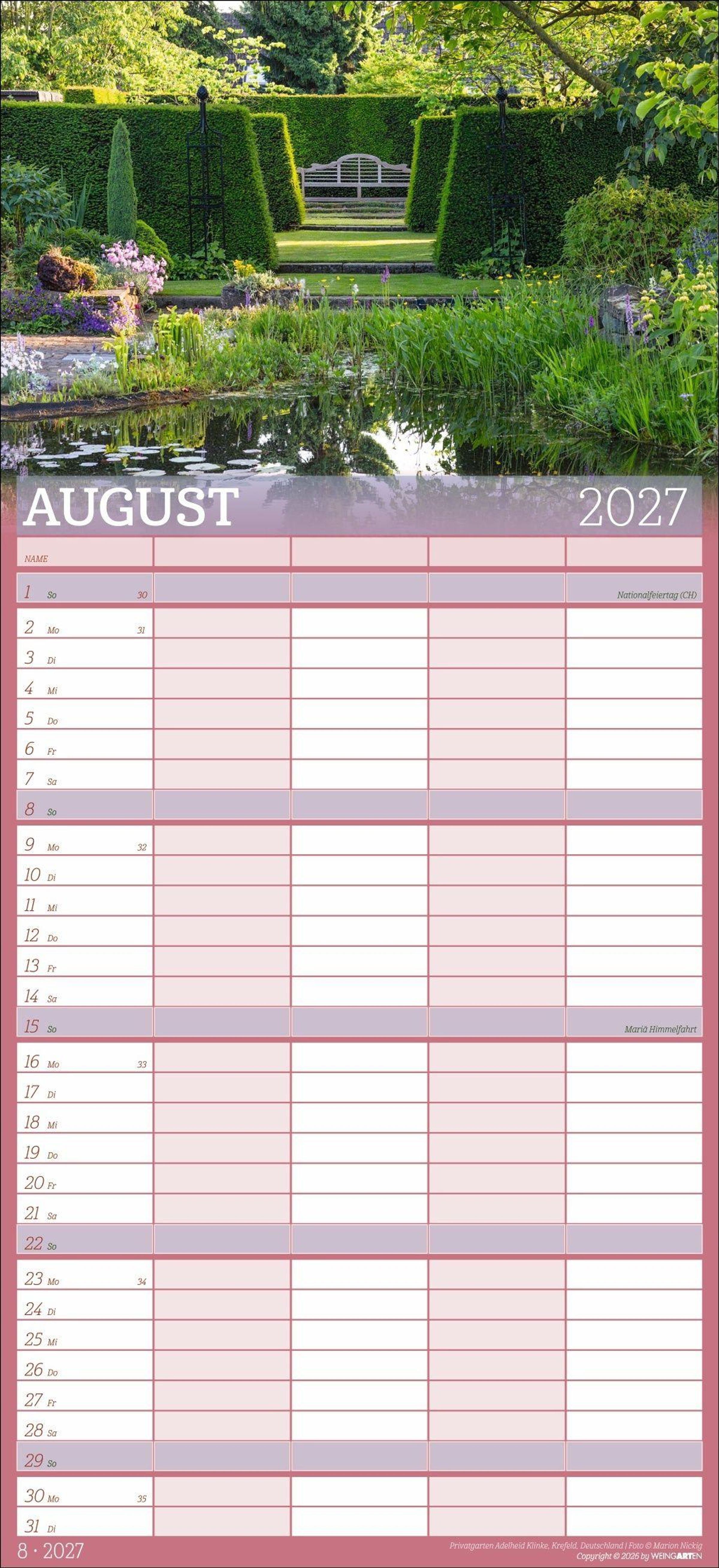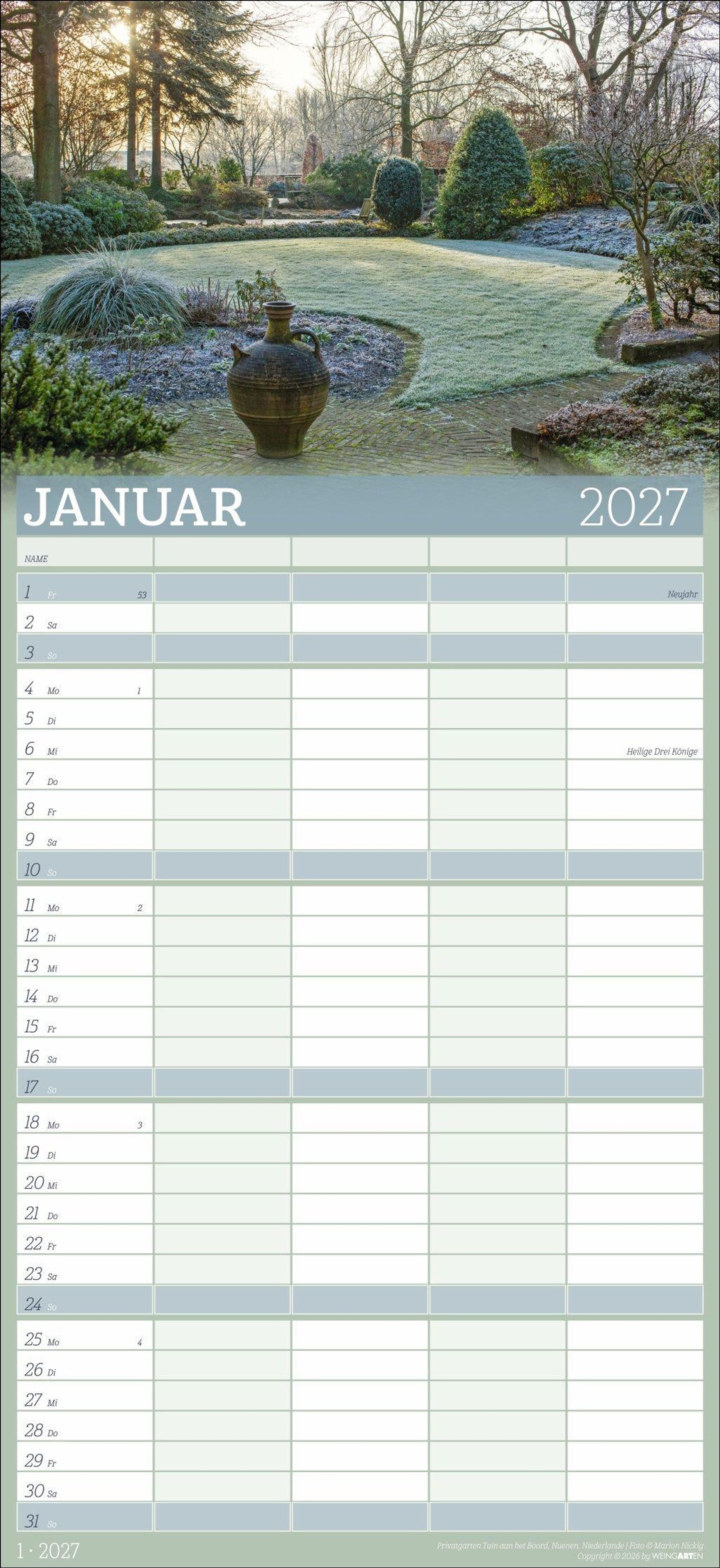 - Großer Foto-Terminkalender mit 5 Spalten für Familien. Schöner Familien-Wandkalender 2027 mit idyllischen Garten-Fotografien. 22 x 48 cm