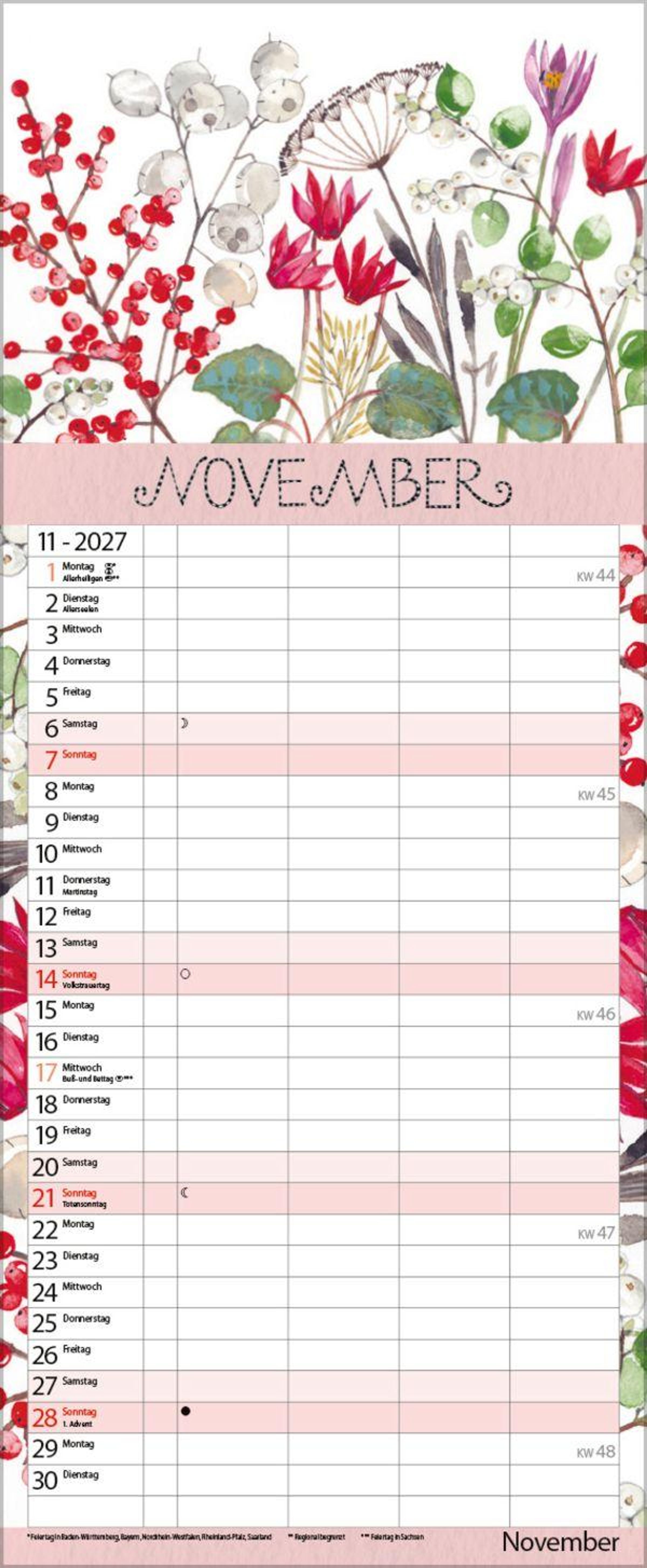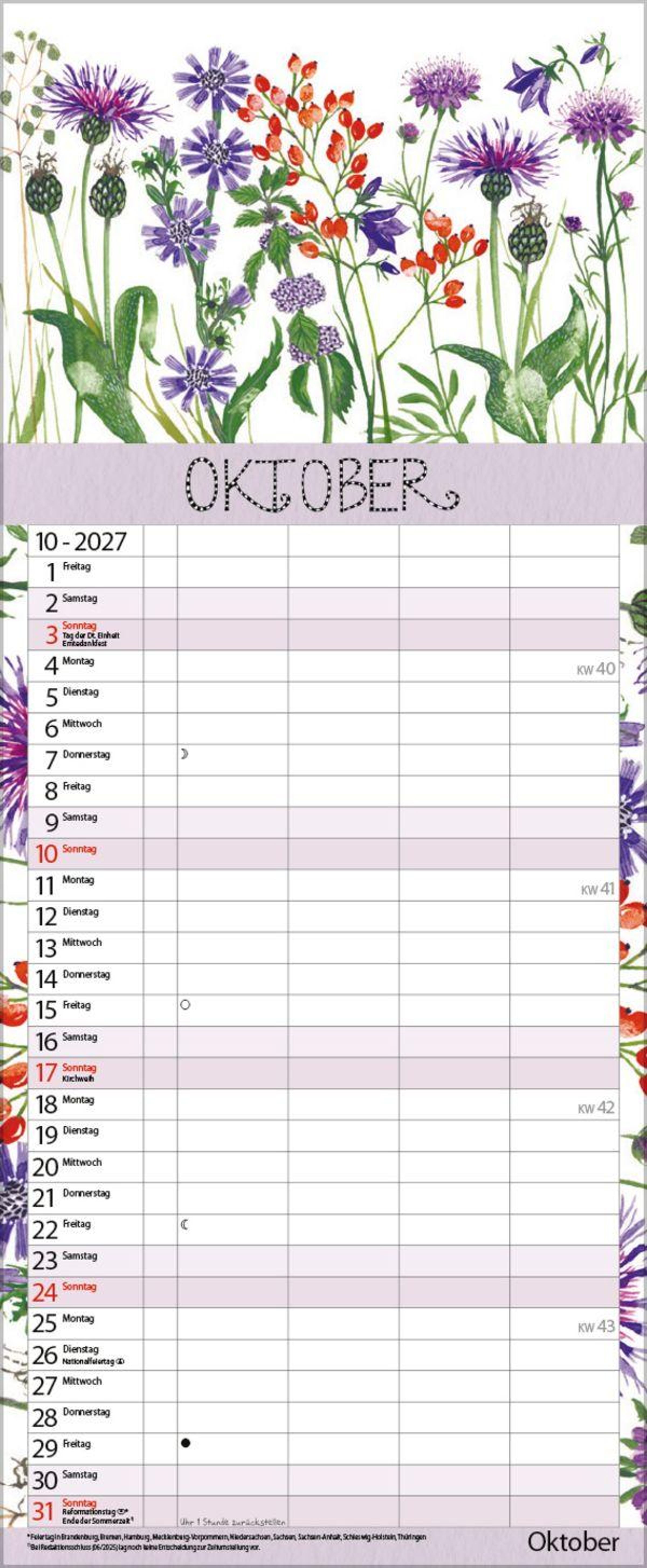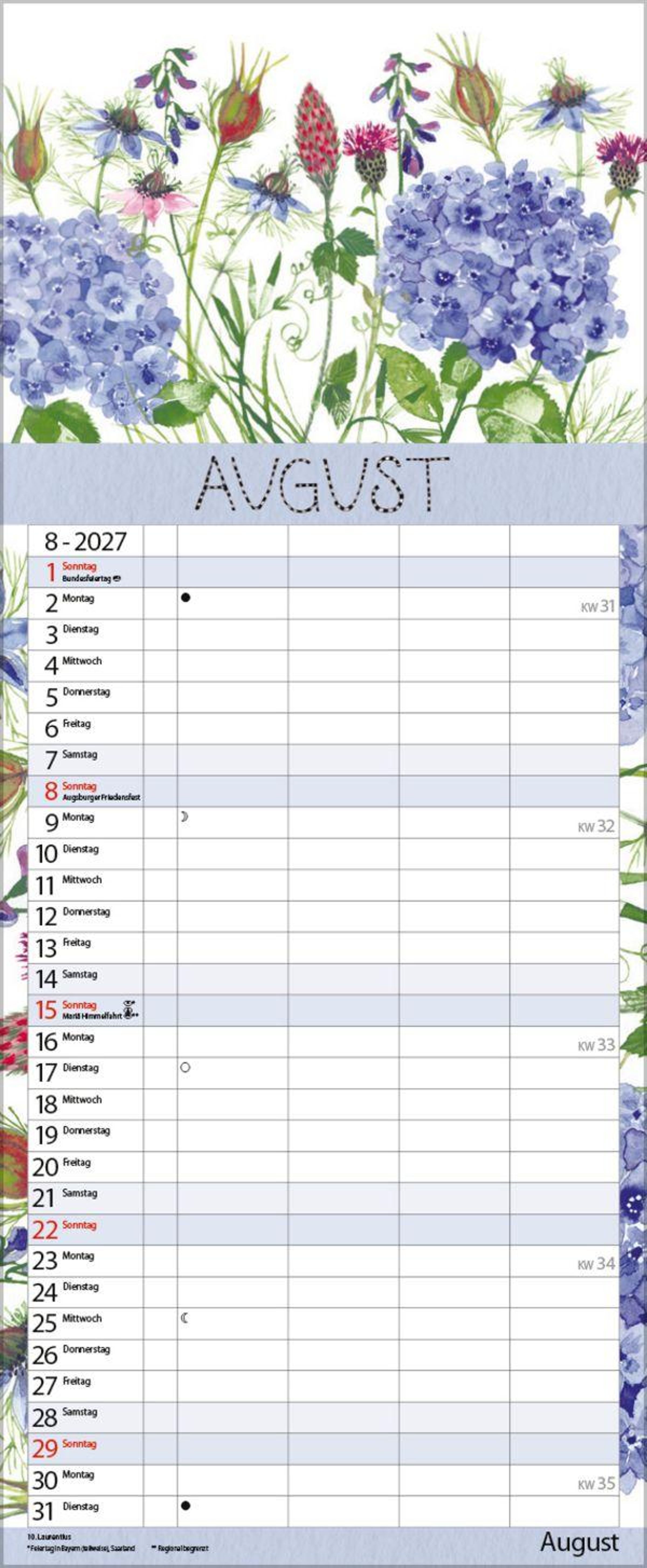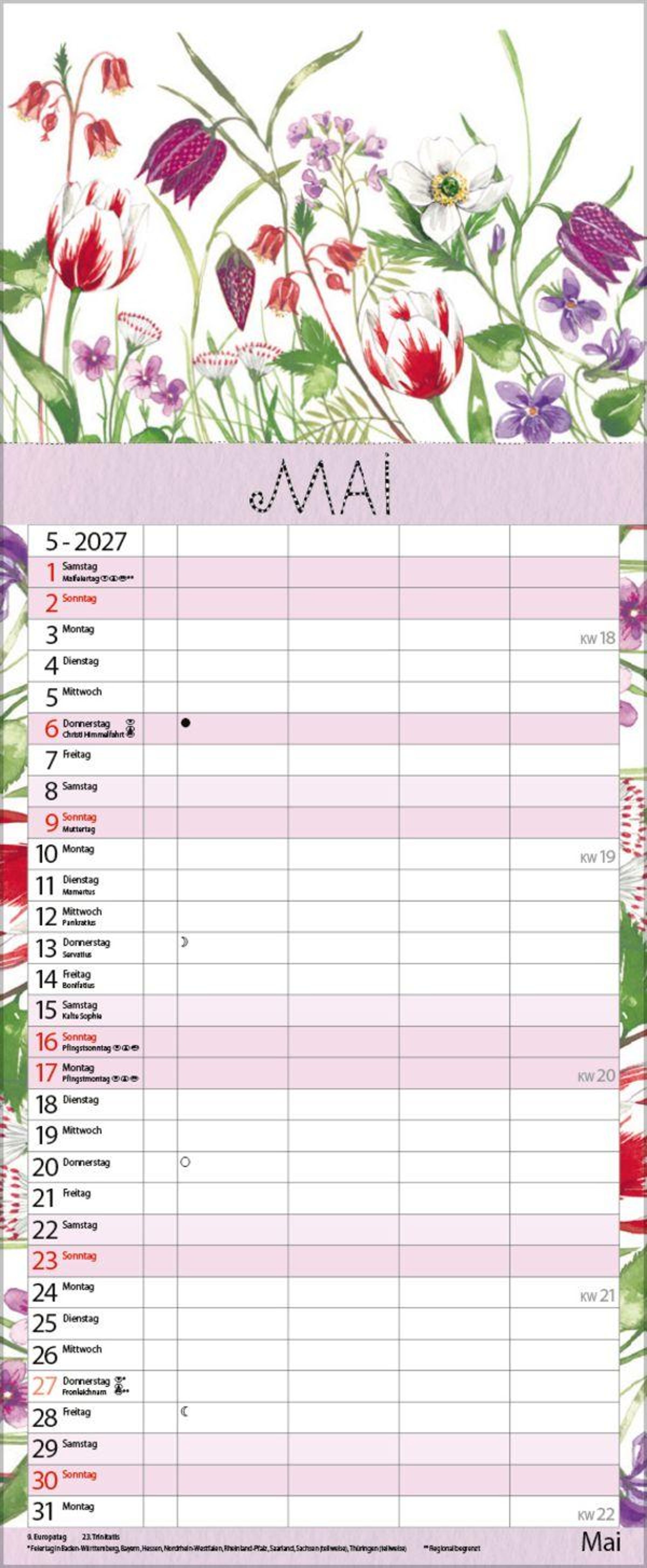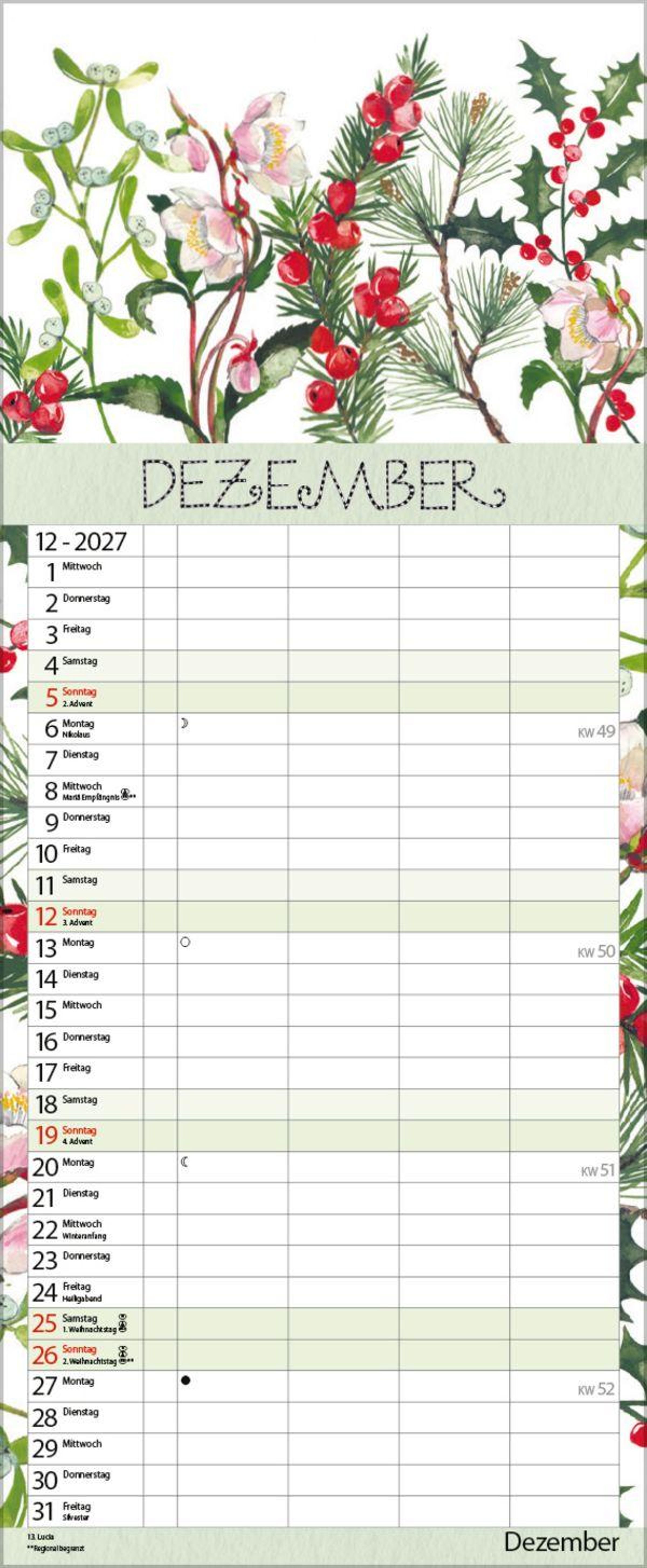 Weitere Informationen wie Mondphasen , Ferientermine und Feiertage (auch regionale) sowie deutlich lesbare Kalenderwochen runden den Kalender ab und sorgen für einen vollständigen Überblick Ihres Jahres.