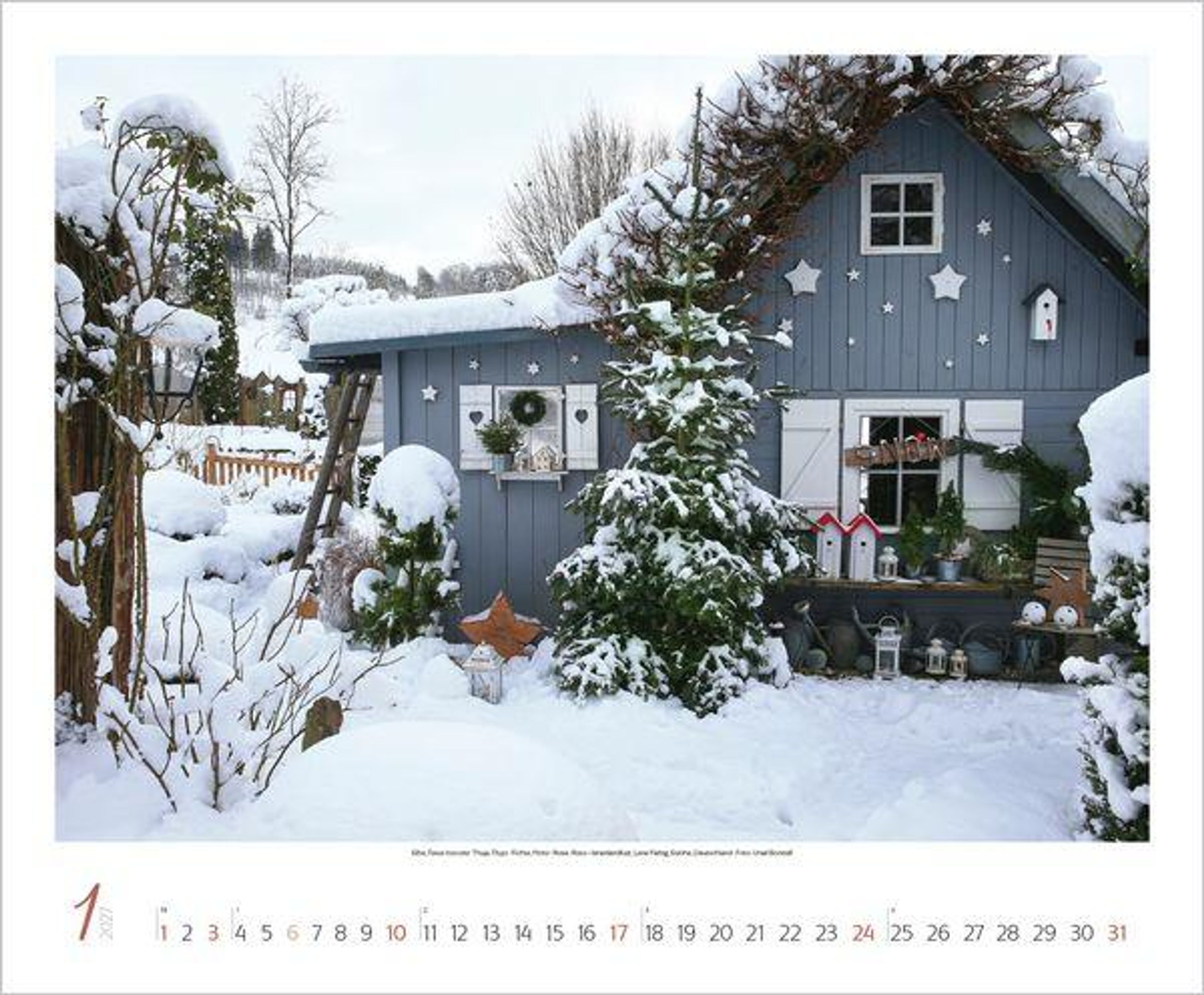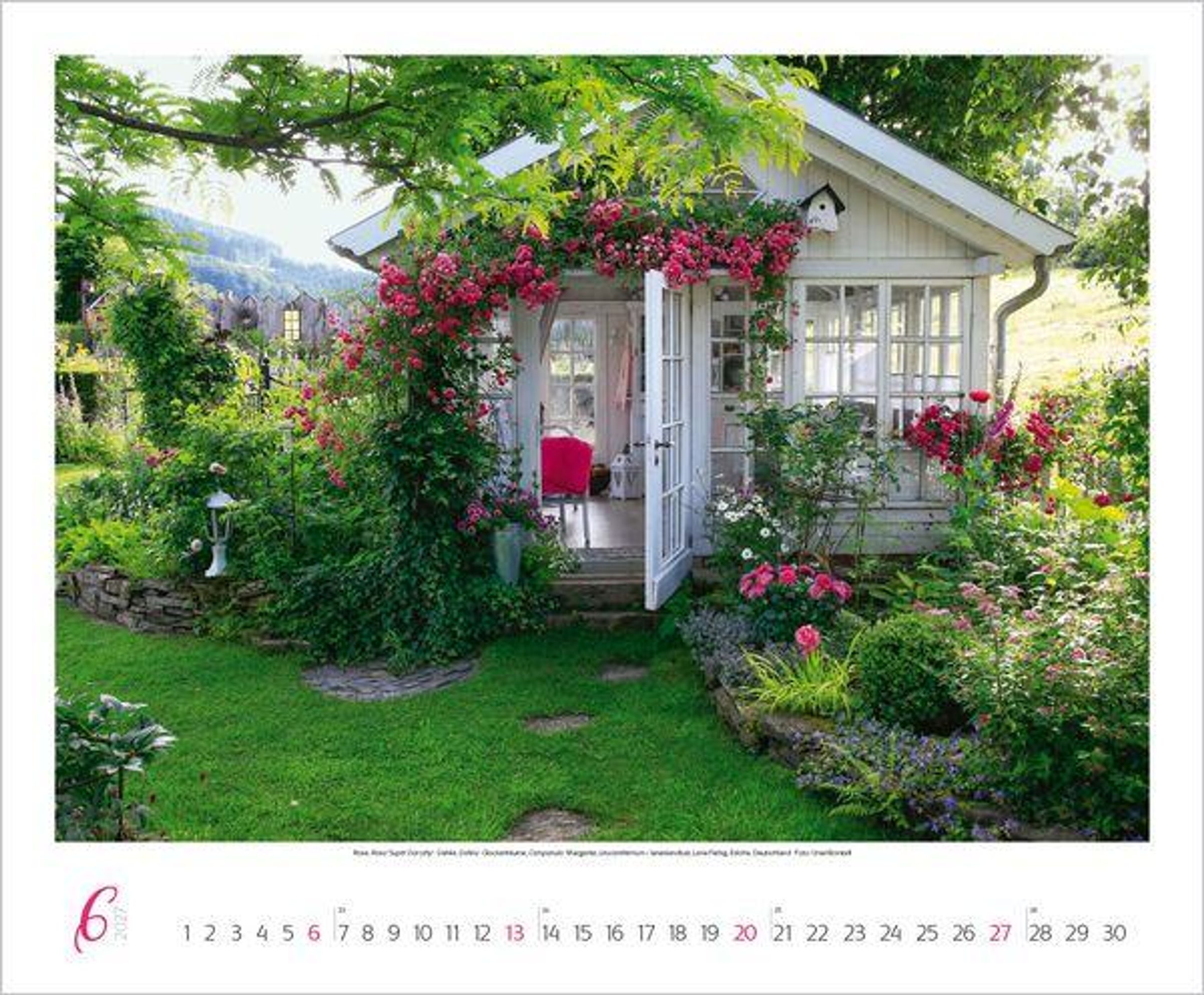 Ursel Borstell, Gartenträume, Gardens, Jardins, Giardini, 2027. Kleines, weißes Gartenhaus mit rosa Blumen., Kalender