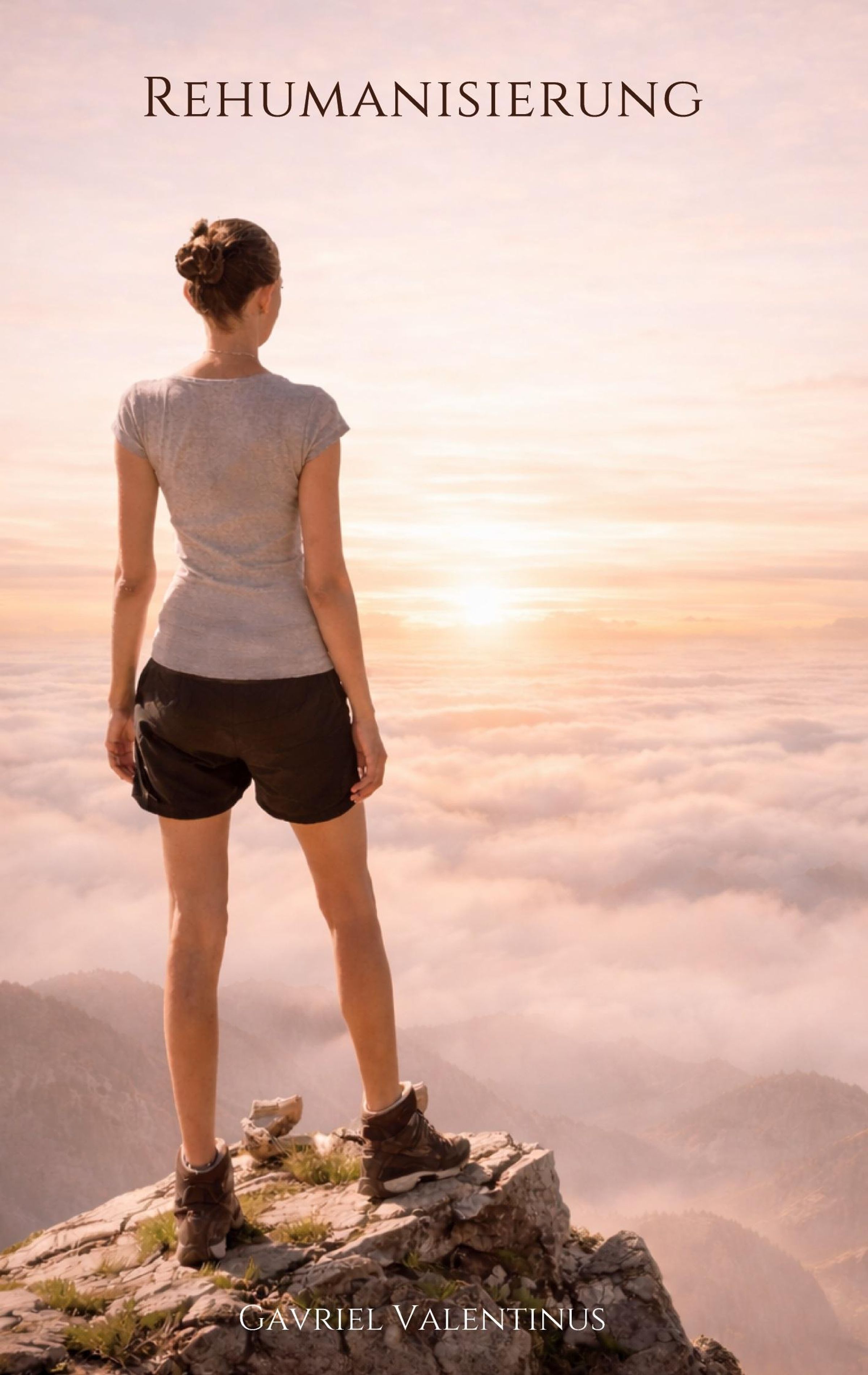 "REHuMANISIERUNG" oben. Eine Frau steht auf einem Berggipfel über den Wolken bei Sonnenaufgang., Buch