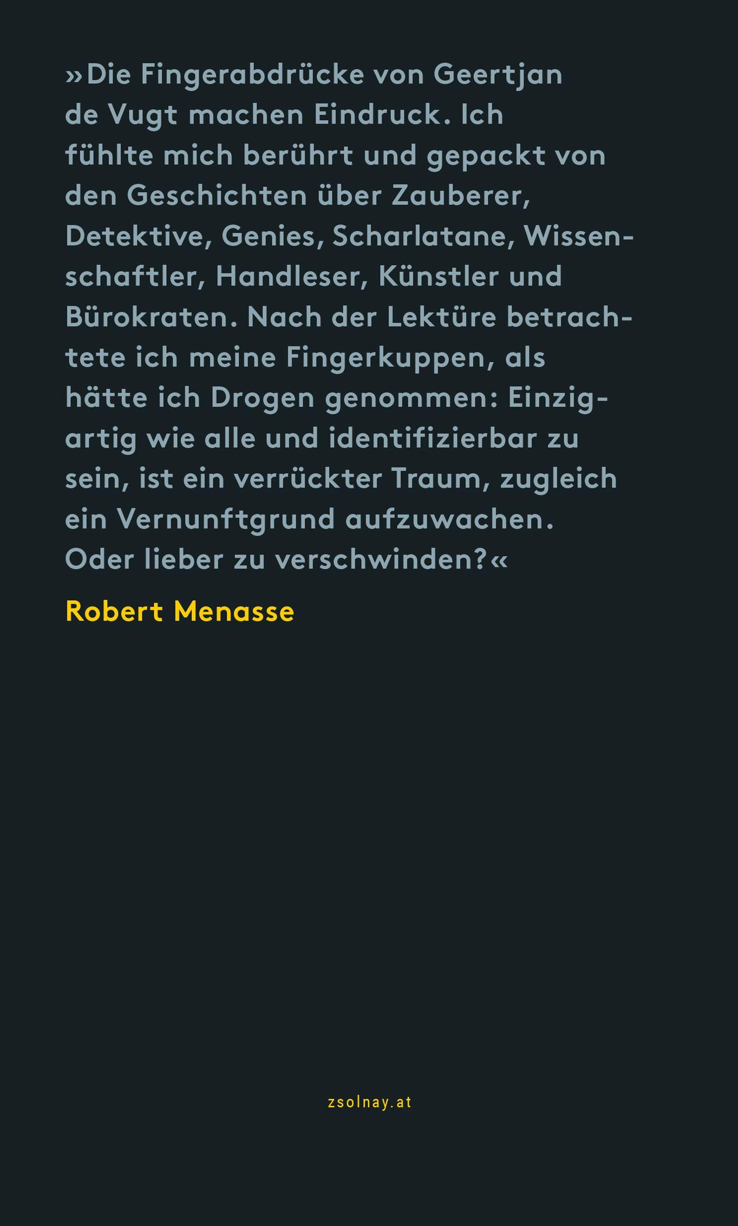Der Fingerabdruck ist der Inbegriff persönlicher Identität. Seine Geschichte ist eine von Magiern, Detektiven, Wissenschaftlerinnen, Genies, Scharlatanen und Handleserinnen. In seinem fabelhaften Buch umkreist Geertjan de Vugt die sozialen, philosophischen, kunsthistorischen und existenziellen Themen rund um den Fingerabdruck und bewegt sich dabei zwischen Fakten und Erzählungen. Er erzählt von dem böhmischen Mediziner, der sich als Erster eingehend mit dem Fingerabdruck beschäftigt hat, und davon, wie er für Verträge und in der Kriminologie interessant wurde. Aber auch von jener Ärztin, die aus Virginia Woolfs Fingern gelesen haben wollte: "Ich glaube, Virginia Woolf ist gestört." Eine rasante Reise durch die Geschichte mit verblüffenden Funden: ein reichhaltiges, gelehrtes und spielerisches Buch über unsere Besessenheit von Einzigartigkeit und Unsichtbarkeit.