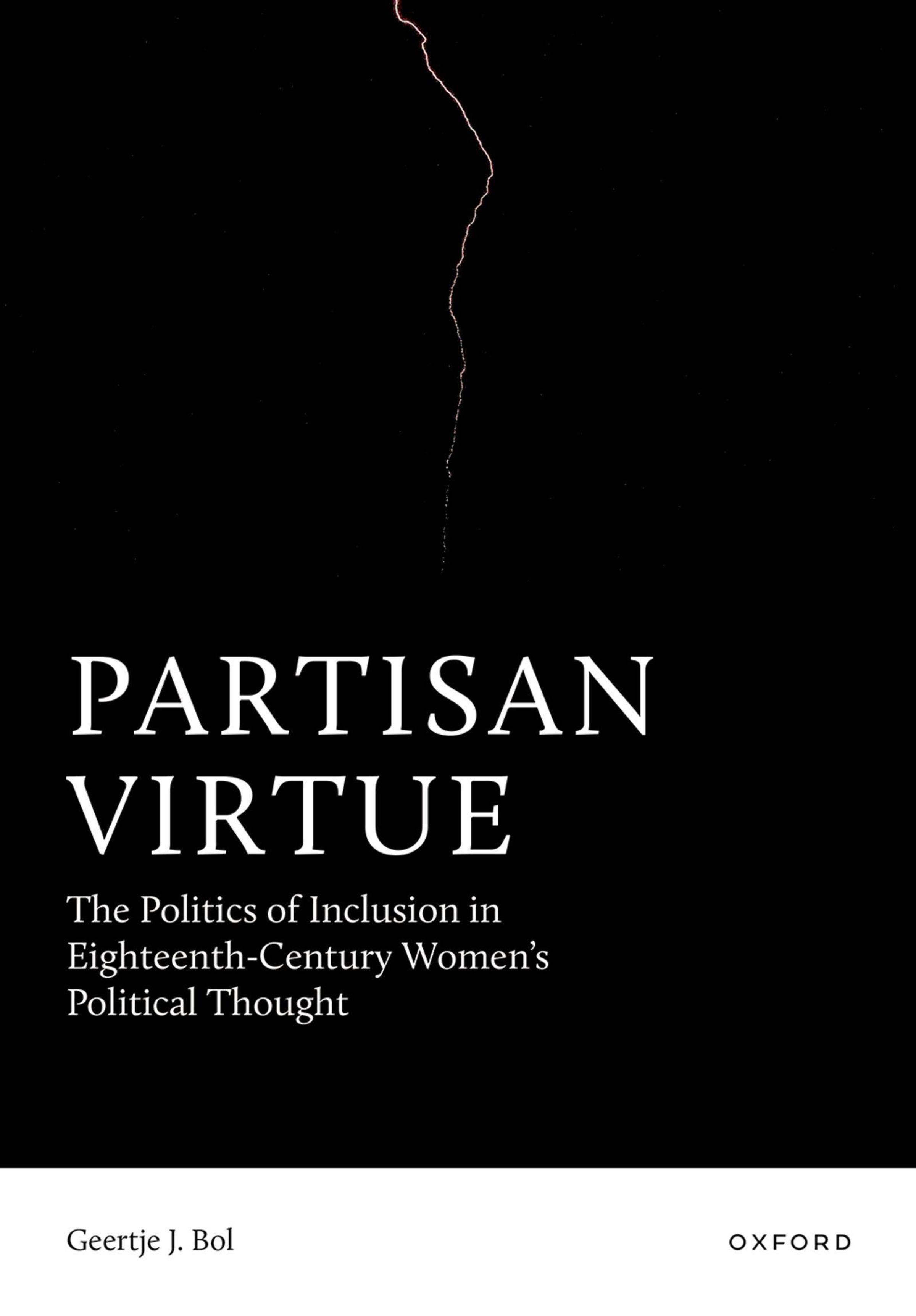 "PARTISAN VIRTUE" in großen Buchstaben, weißer Text auf schwarzem Hintergrund, dünner Blitz oben mittig., Buch