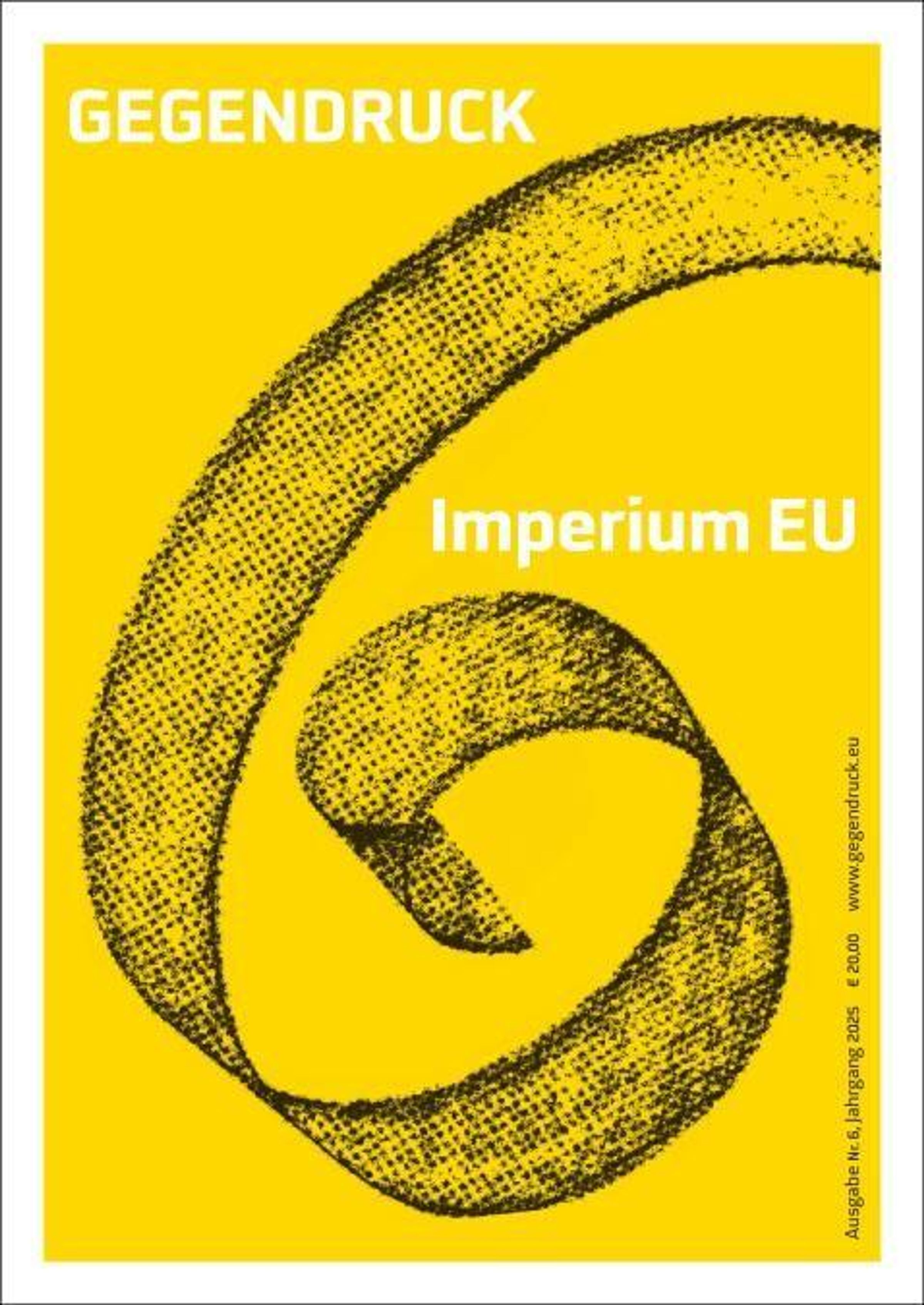Der Text "GEGENDRUCK" und "Imperium EU" steht auf gelbem Hintergrund mit einer großen, spiralförmigen Illustration., Buch