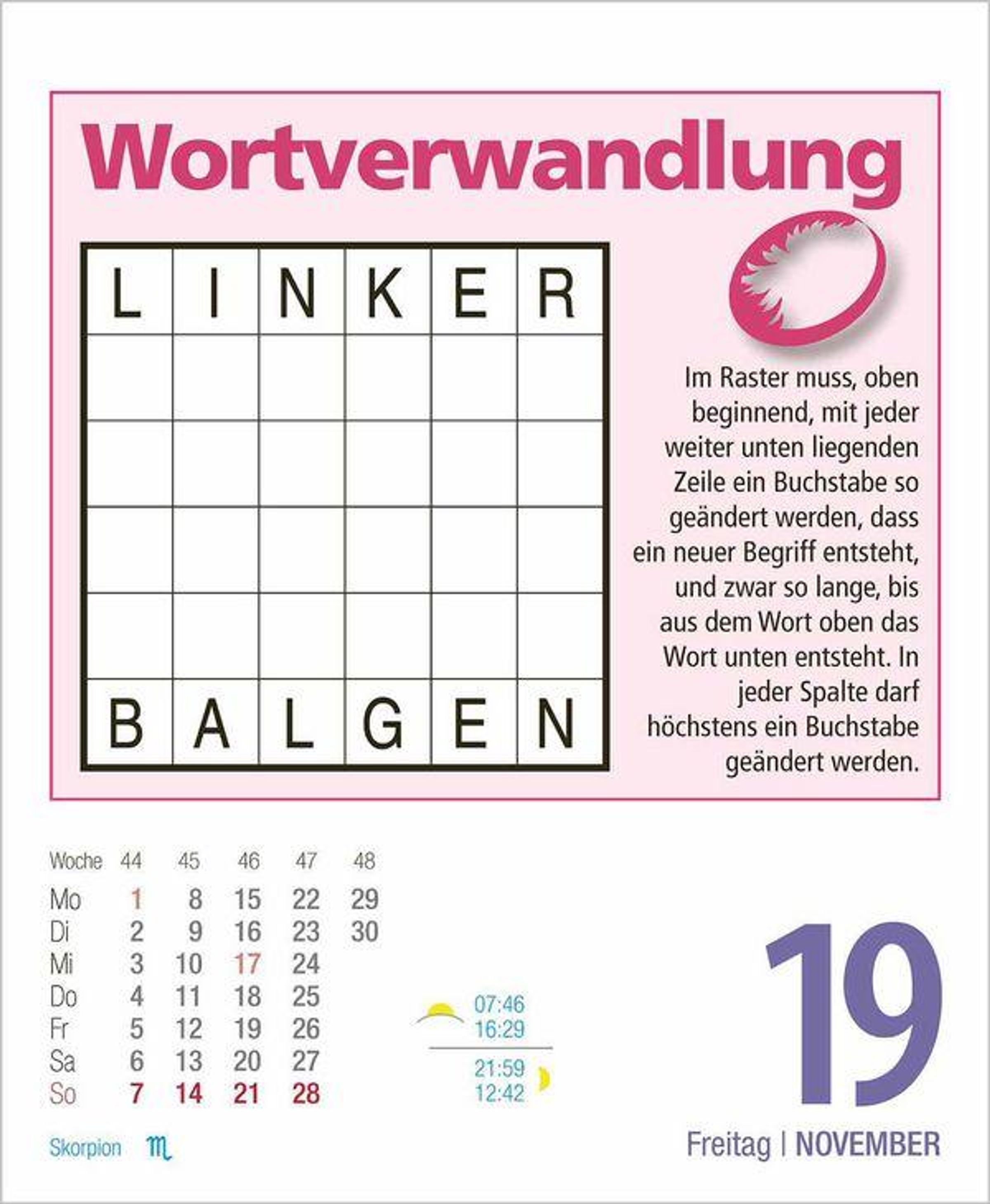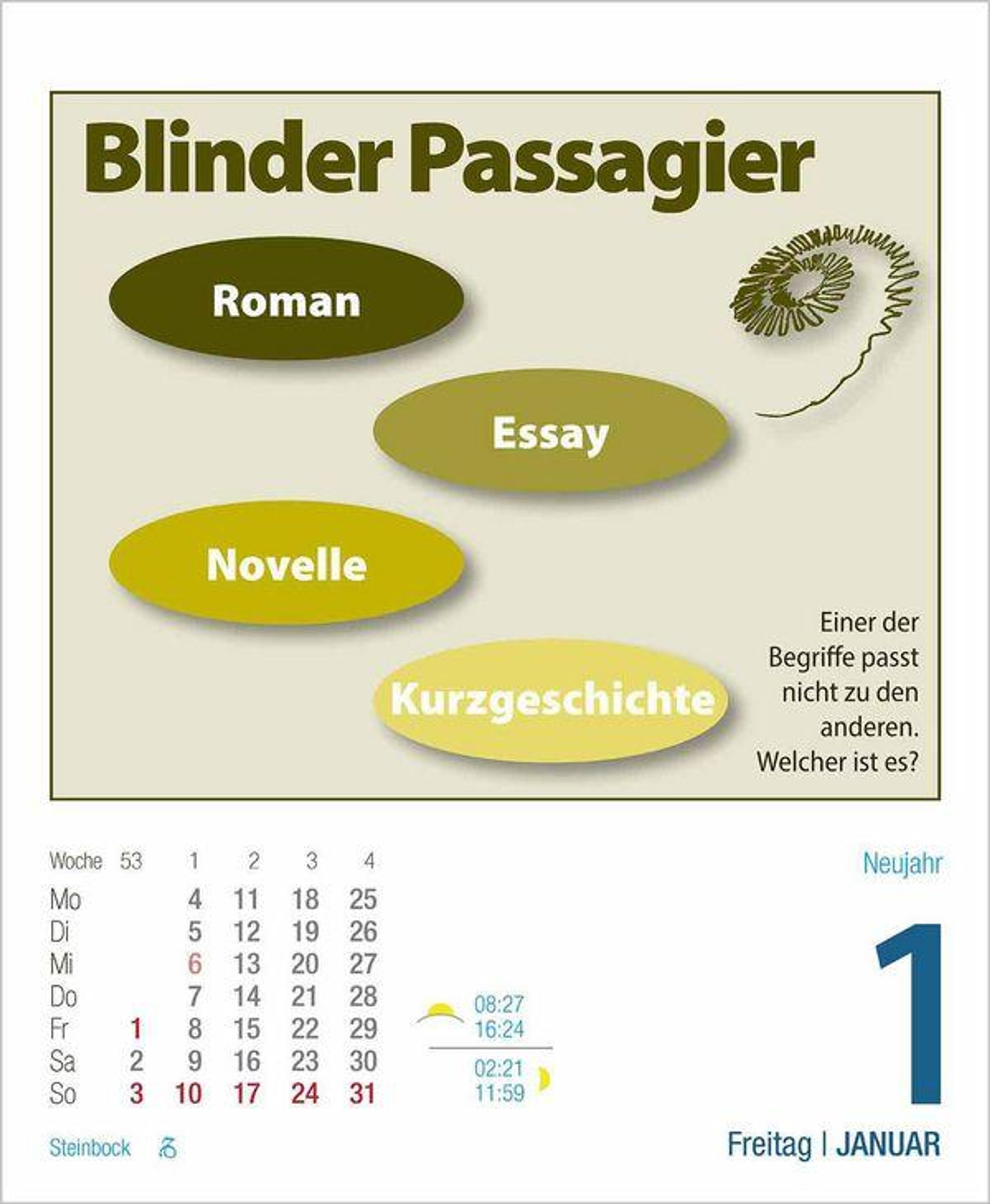 Trainieren Sie Ihre grauen Zellen spielerisch und freuen Sie sich auf neue spannende Denkaufgaben und knifflige Rätsel für das ganze Jahr.