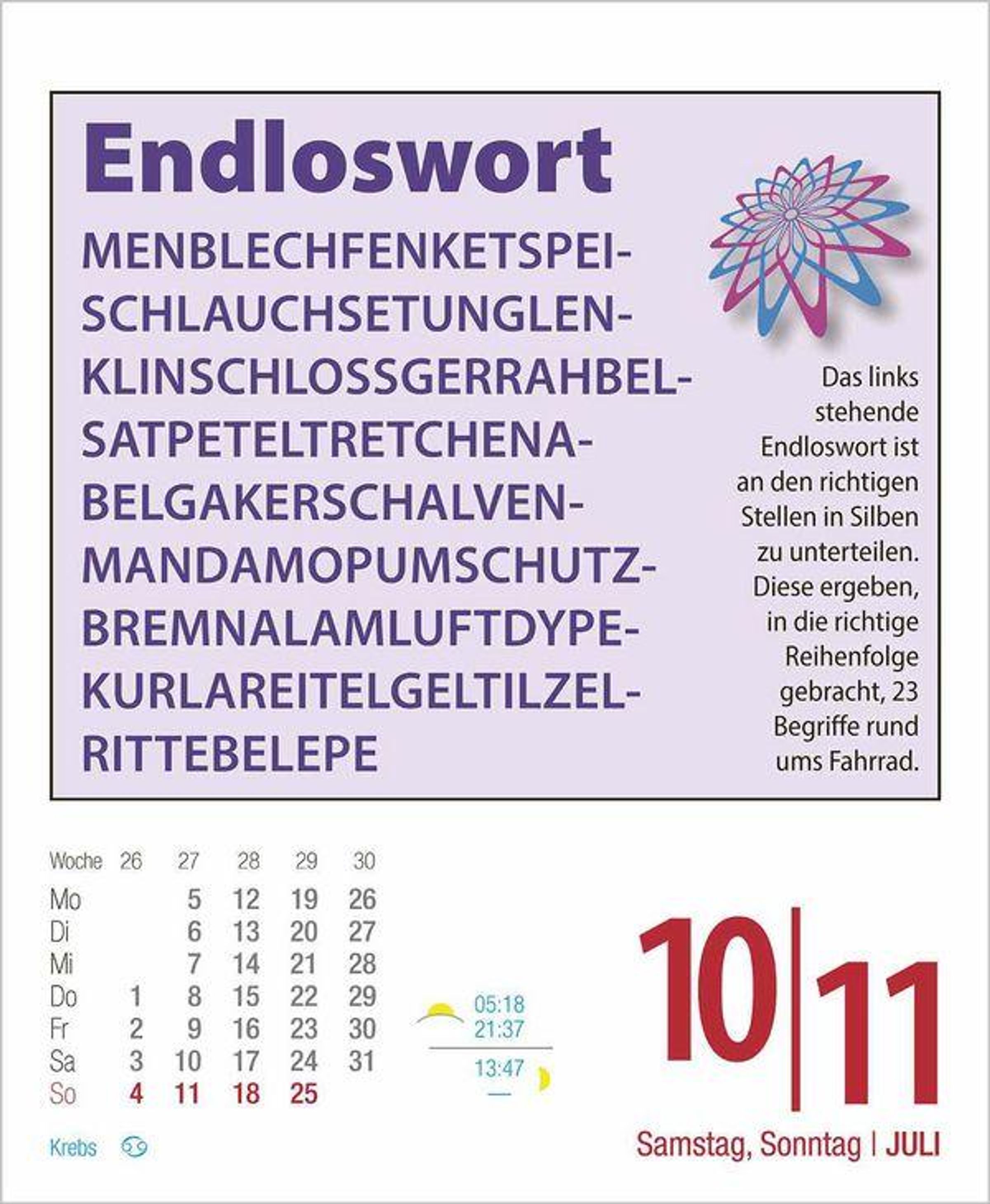 Kalender zum Aufstellen oder Aufhängen. Je Wochentag ein Kalenderblatt, Samstag / Sonntag auf einem Blatt.