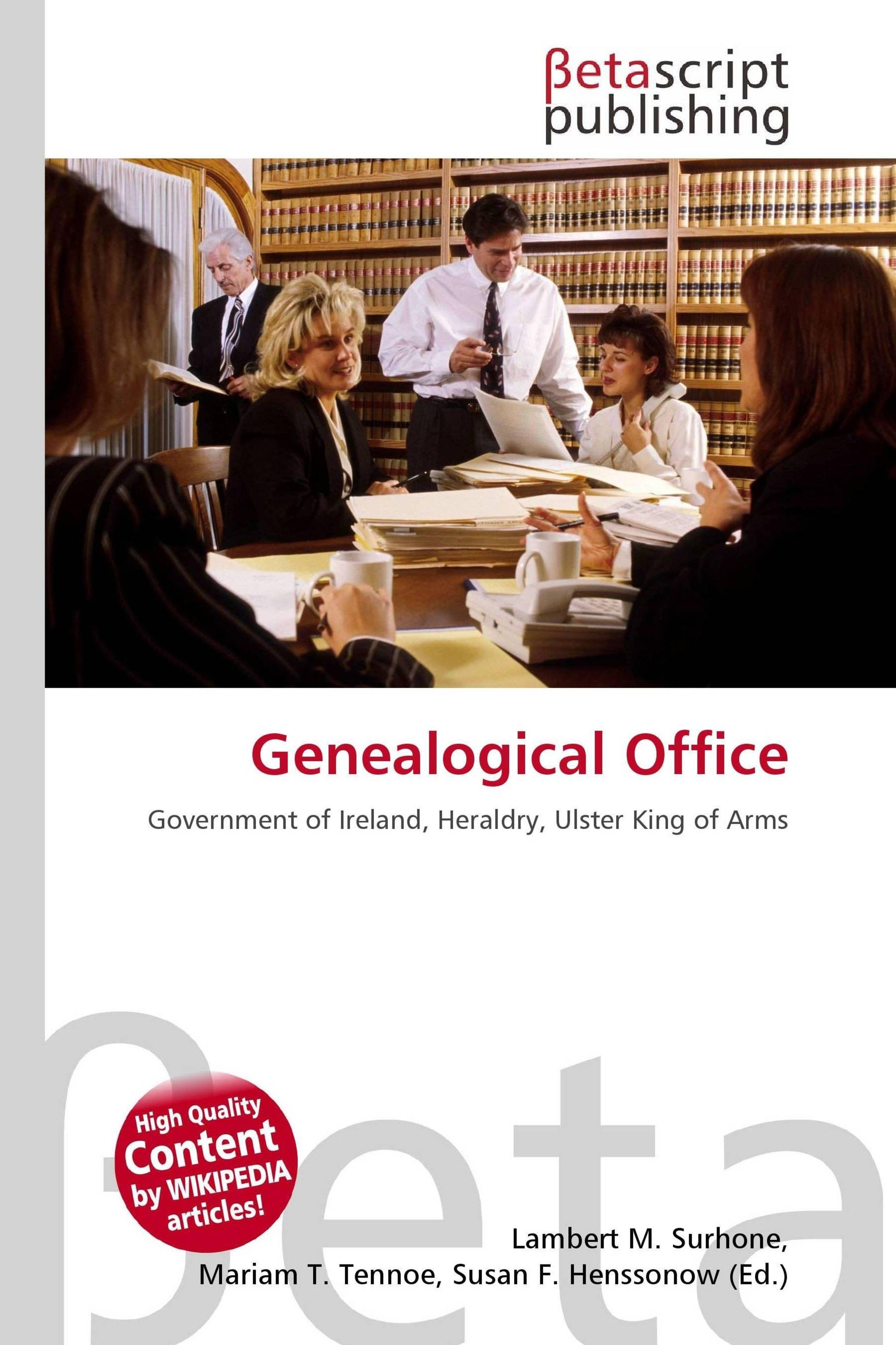 Please note that the content of this book primarily consists of articles available from Wikipedia or other free sources online. The Genealogical Office is an office of the Government of Ireland containing genealogical records. It includes the Office of the Chief Herald of Ireland (Irish Príomh Aralt na hÉireann), the authority in the Republic of Ireland for heraldry. The Chief Herald authorises the granting of arms to Irish bodies and Irish people, including descendants of emigrants. His office was constituted on 1 April 1943 as successor to the Ulster King of Arms, established in the England-based kingdom of Ireland in 1552. The Ulster King of Arms' duties in Northern Ireland were taken over by the Norroy and Ulster King of Arms.