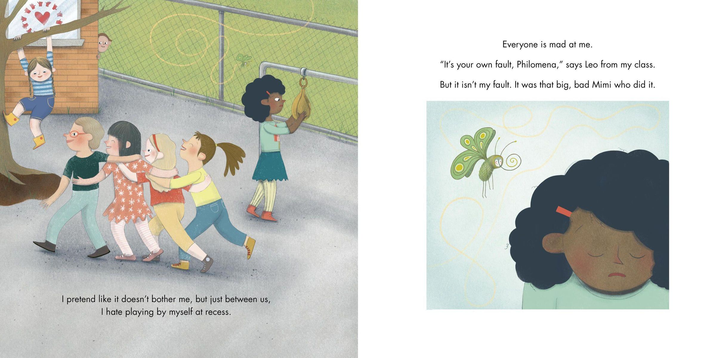 No one wants to play with Philomena, and she knows why: it's the big, bad Mimi. Whenever someone starts talking, the Mimi shows up, and it becomes impossible for Philomena to not talk about herself. "ME, too! Watch ME! Listen to ME!" It's becoming a problem - for everyone. Philomena is desperate to for the big, bad Mimi to go away so the other children will play with her again. So she's thrilled when her teacher tells her there's a powerful creature that can chase away the big, bad Mimi for good. When Philomena finally encounters this creature, she discovers why listening to what others have to say is a skill worth practicing.