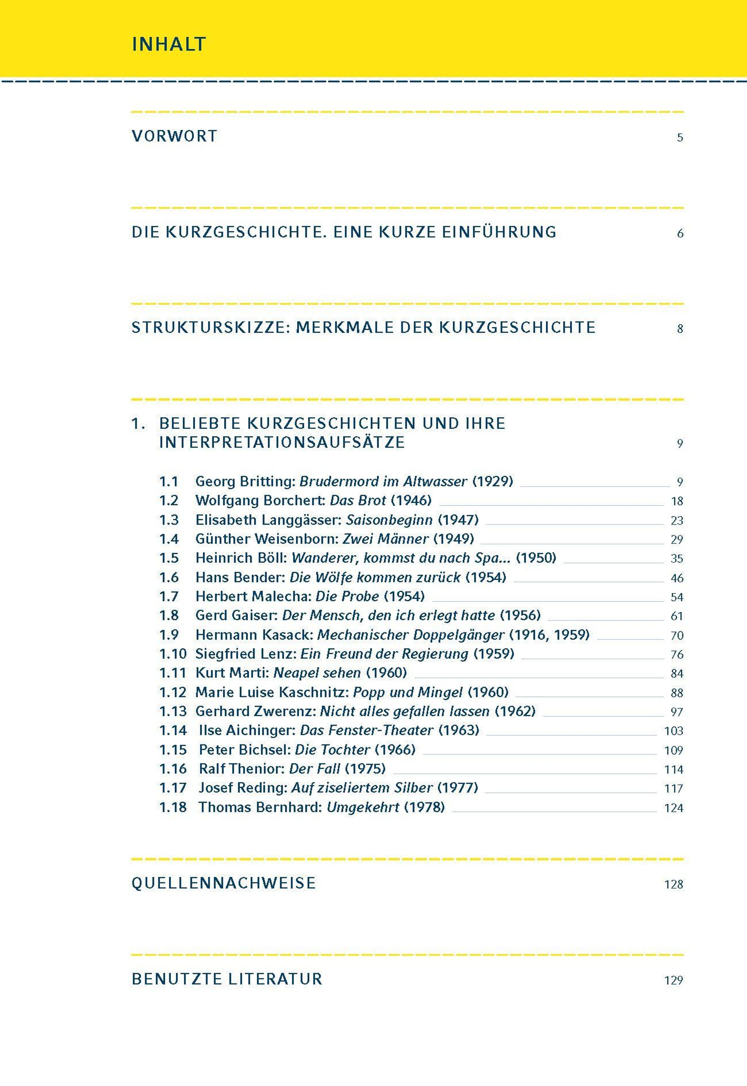 Mit dem Band Beliebte Kurzgeschichten interpretiert, der eine Sammlung der bekanntesten Kurzgeschichten enthält, sind Schüler: innen auf die kommende Prüfung zu diesem Thema gut vorbereitet. Ebenso eignet sich der Band für Lehrkräfte, die für ihre Unterrichtsvorbereitung geeignete Kurzgeschichten und deren Interpretationen suchen. Die abgedruckten Texte und die ausgearbeiteten Musterinterpretationen ermöglichen einen schnellen Überblick und eine intensive Vorbereitung auf die Interpretation von Kurzgeschichten. Bei jeder Interpretation werden der Inhalt, der Aufbau, die Aussage und Sprache sowie die Form analysiert. Themen aus dem Inhalt: