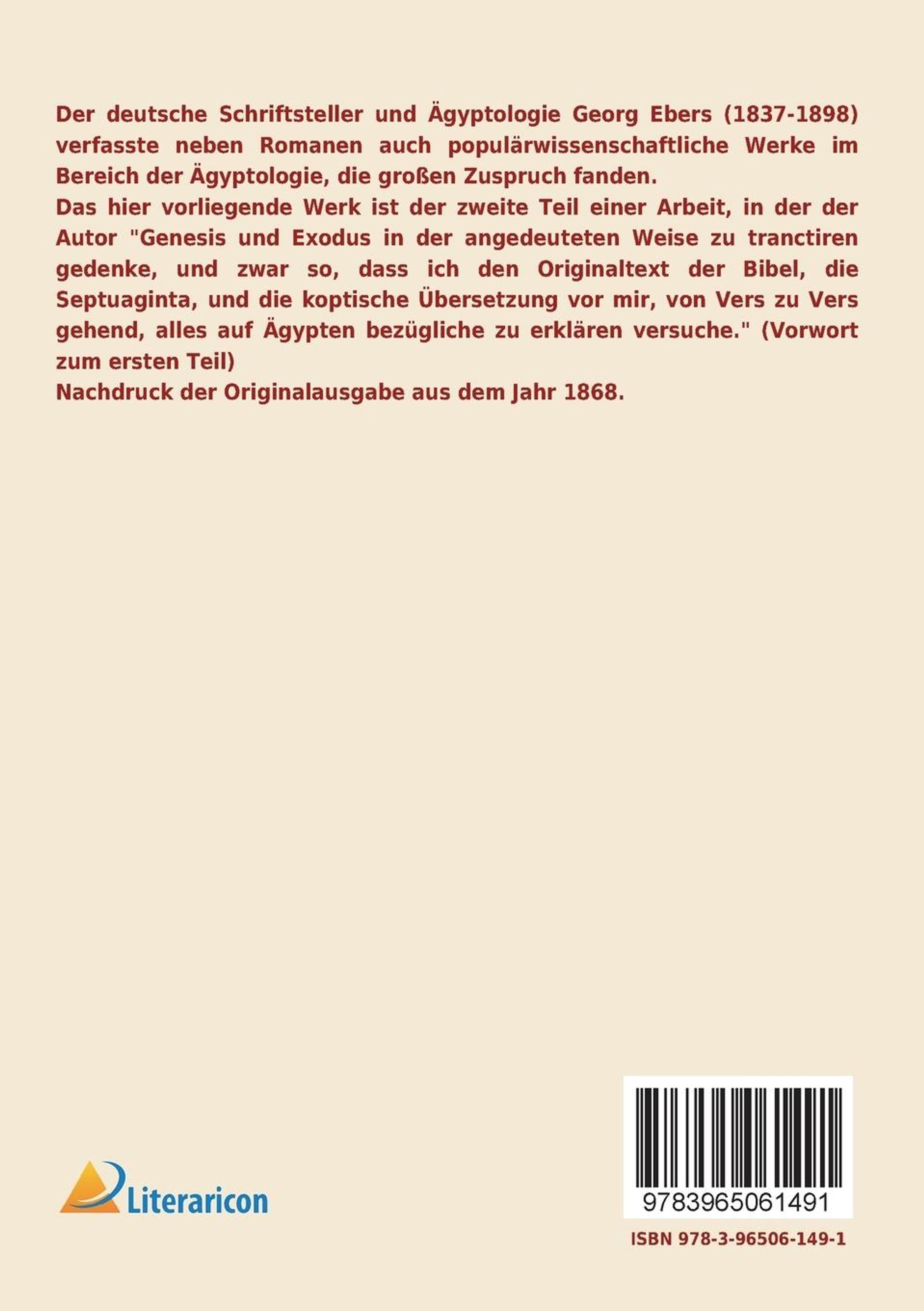 Der deutsche Schriftsteller und Ägyptologie Georg Ebers (1837-1898) verfasste neben Romanen auch populärwissenschaftliche Werke im Bereich der Ägyptologie, die großen Zuspruch fanden. Das hier vorliegende Werk ist der zweite Teil einer Arbeit, in der der Autor "Genesis und Exodus in der angedeuteten Weise zu tranctiren gedenke, und zwar so, dass ich den Originaltext der Bibel, die Septuaginta, und die koptische Übersetzung vor mir, von Vers zu Vers gehend, alles auf Ägypten bezügliche zu erklären versuche." (Vorwort zum ersten Teil) Nachdruck der Originalausgabe aus dem Jahr 1868.