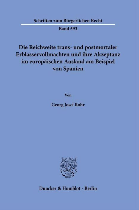 'The Scope of Trans- and Post-Mortem Testamentary Powers of Attorney and their Acceptance in other European Countries Using the Example of Spain': The central subject of the study is the possible scope of trans- and post-mortem testamentary powers of attorney under German law. A comprehensive catalogue of criteria is developed to determine the extent to which testator powers of attorney can legitimately exist alongside testamentary dispositions. It also examines the extent to which trans- and post-mortem powers of attorney that are permissible under German law are recognised in other European countries, taking Spain as an example.