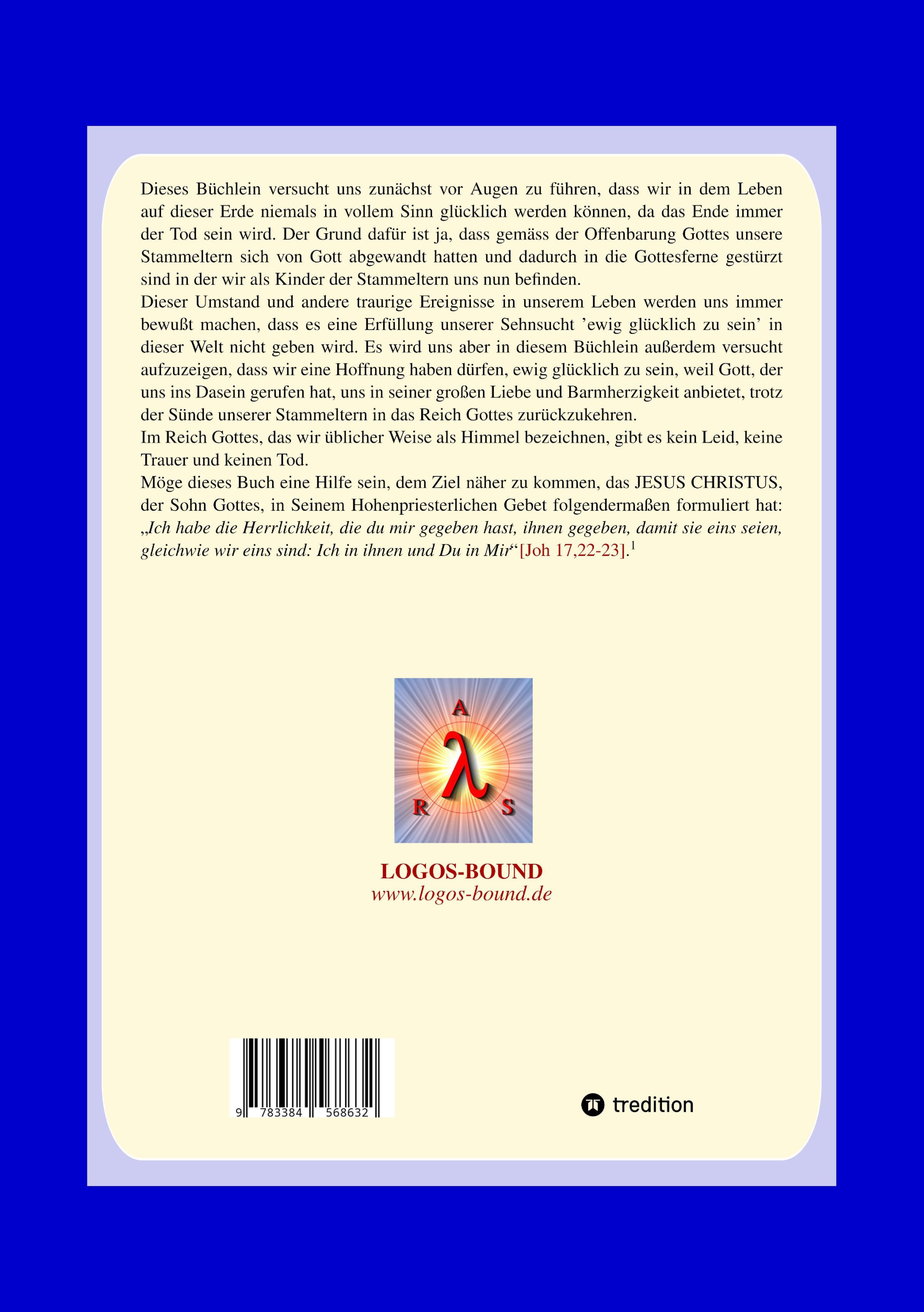 Dieses Büchlein versucht uns zunächst vor Augen zu führen, dass wir in dem Leben auf dieser Erde niemals in vollem Sinn glücklich werden können, da das Ende immer der Tod sein wird. Der Grund dafür ist ja, dass gemäss der Offenbarung Gottes unsere Stammeltern sich von Gott abgewandt hatten und dadurch in die Gottesferne gestürzt sind in der wir als Kinder der Stammeltern uns nun befinden. Dieser Umstand und andere traurige Ereignisse in unserem Leben werden uns immer bewußt machen, dass es eine Erfüllung unserer Sehnsucht 'ewig glücklich zu sein' in dieser Welt nicht geben wird. Es wird uns aber in diesem Büchlein außerdem versucht aufzuzeigen, dass wir eine Hoffnung haben dürfen, ewig glücklich zu sein, weil Gott, der uns ins Dasein gerufen hat, uns in seiner großen Liebe und Barmherzigkeit anbietet, trotz der Sünde unserer Stammeltern in das Reich Gotteszurückzukehren. Im Reich Gottes, das wir üblicher Weise als Himmel bezeichnen, gibt es kein Leid, keine Trauer und keinen Tod.