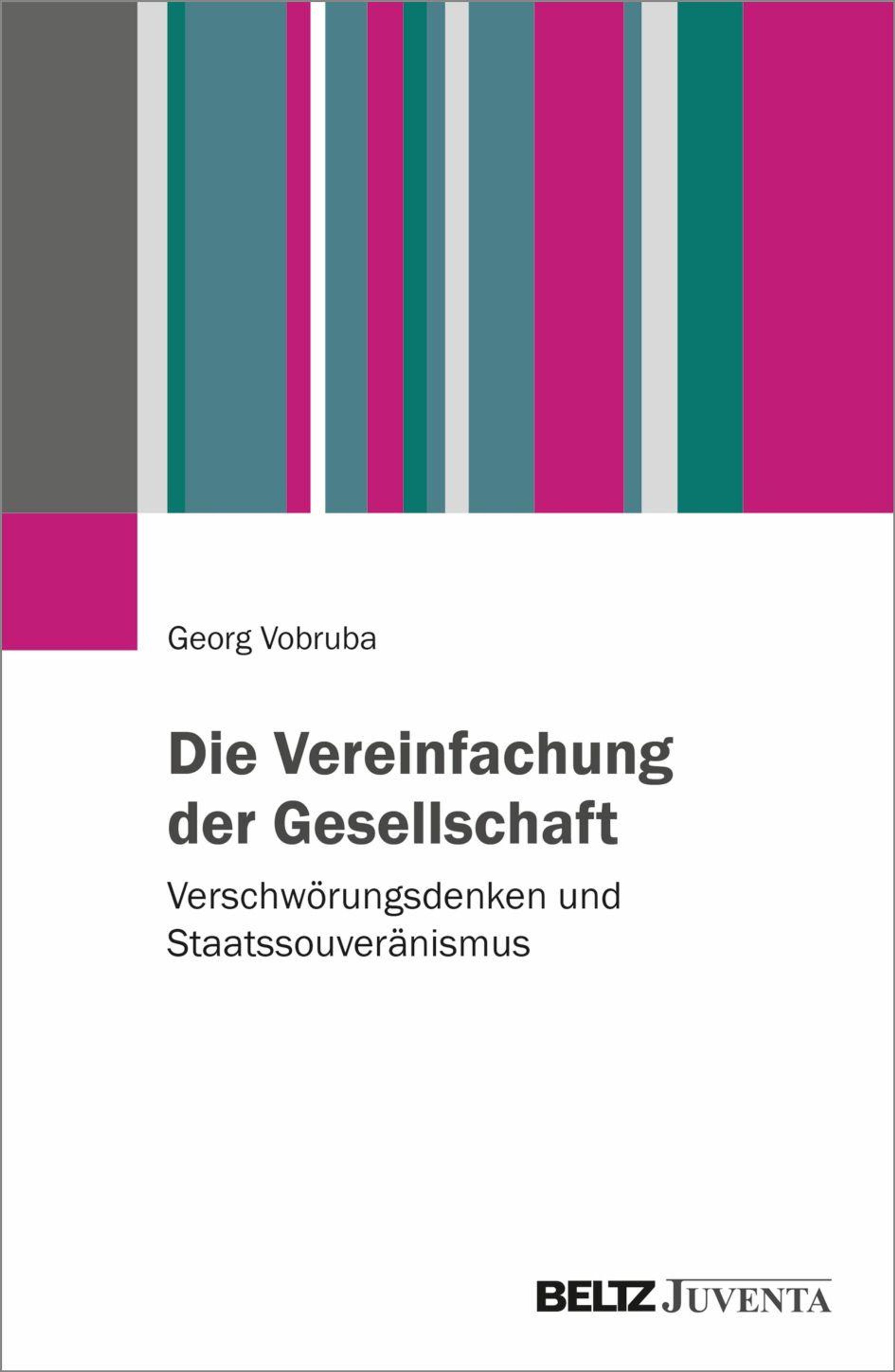"Die Vereinfachung der Gesellschaft" von Georg Vobruba behandelt Verschwörungsdenken. Bunte vertikale Streifen oben., Buch
