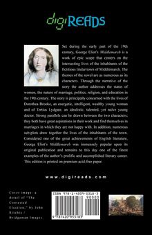 Set during the early part of the 19th century, George Eliot's "Middlemarch" is a work of epic scope that centers on the intersecting lives of the inhabitants of the fictitious titular town of Middlemarch. The themes of the novel are as numerous as its characters. Through the narrative of the story the author addresses the status of women, the nature of marriage, politics, religion, and education in the 19th century. The story is principally concerned with the lives of Dorothea Brooke, an energetic, intelligent, wealthy young woman and of Tertius Lydgate, an idealistic, talented, yet naïve young doctor. Strong parallels can be drawn between the two characters; they both have great aspirations in their work and find themselves in marriages in which they are not happy with. In addition, numerous sub-plots draw together the lives of the inhabitants of the town. Considered one of the great achievements of English literature, George Eliot's "Middlemarch" was immensely popular upon its original publication and remains to this day one of the finest examples of the author's prolific and accomplished literary career. This edition is printed on premium acid-free paper.