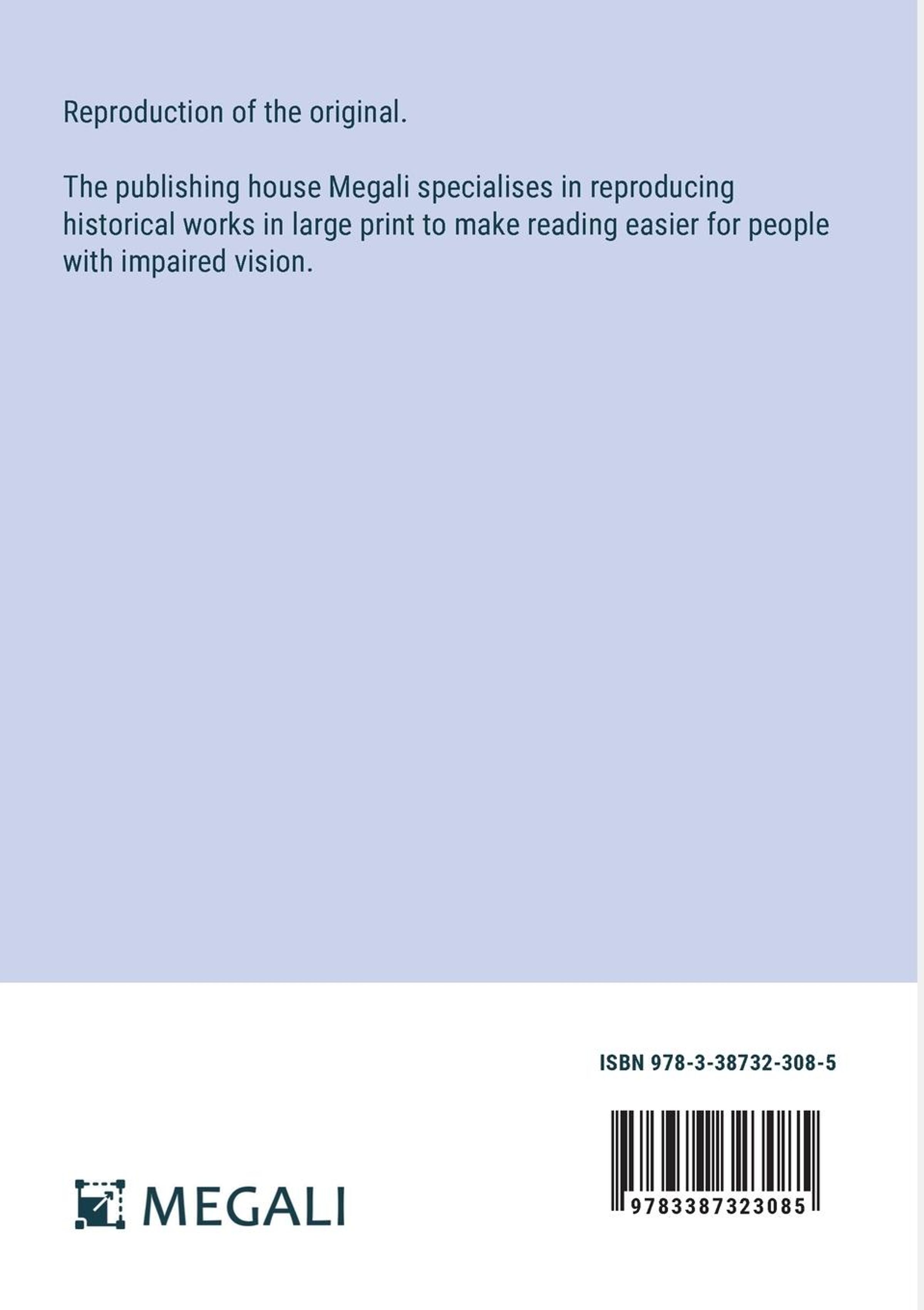Reproduction of the original. The publishing house Megali specialises in reproducing historical works in large print to make reading easier for people with impaired vision.