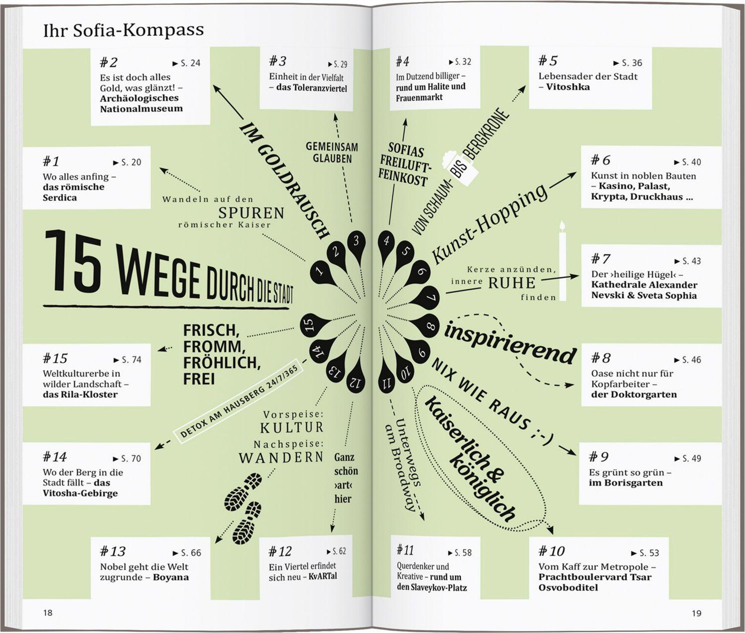 In eigenen Kapiteln erfahren Sie, wo es sich in fremden Betten gut schläft, wo Sie glücklich satt werden, wohin die Sofioten zum Stöbern und Entdecken gehen und wohin es sie zieht, wenn die Nacht beginnt.