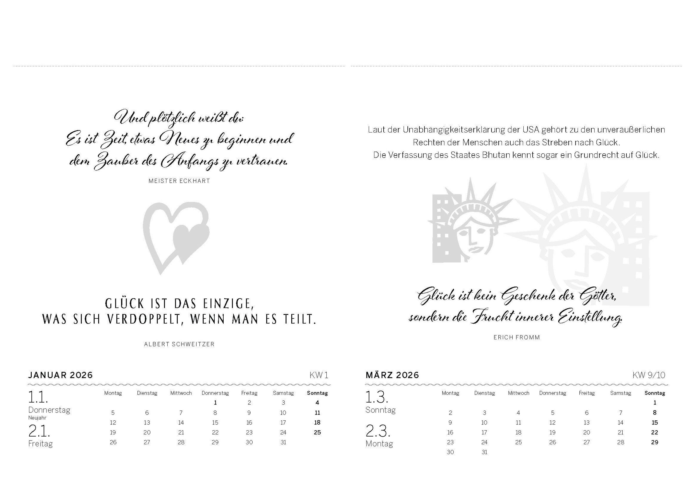 Sinnsprüche, Weisheiten, kleine Erzählungen, Witze und handfeste Tipps: Dieser Kalender ist genau der richtige für alle Glückssucher! Denn Lebensfreude im Alltag ist der Schlüssel für ein beschwingtes und positives Lebensgefühl.