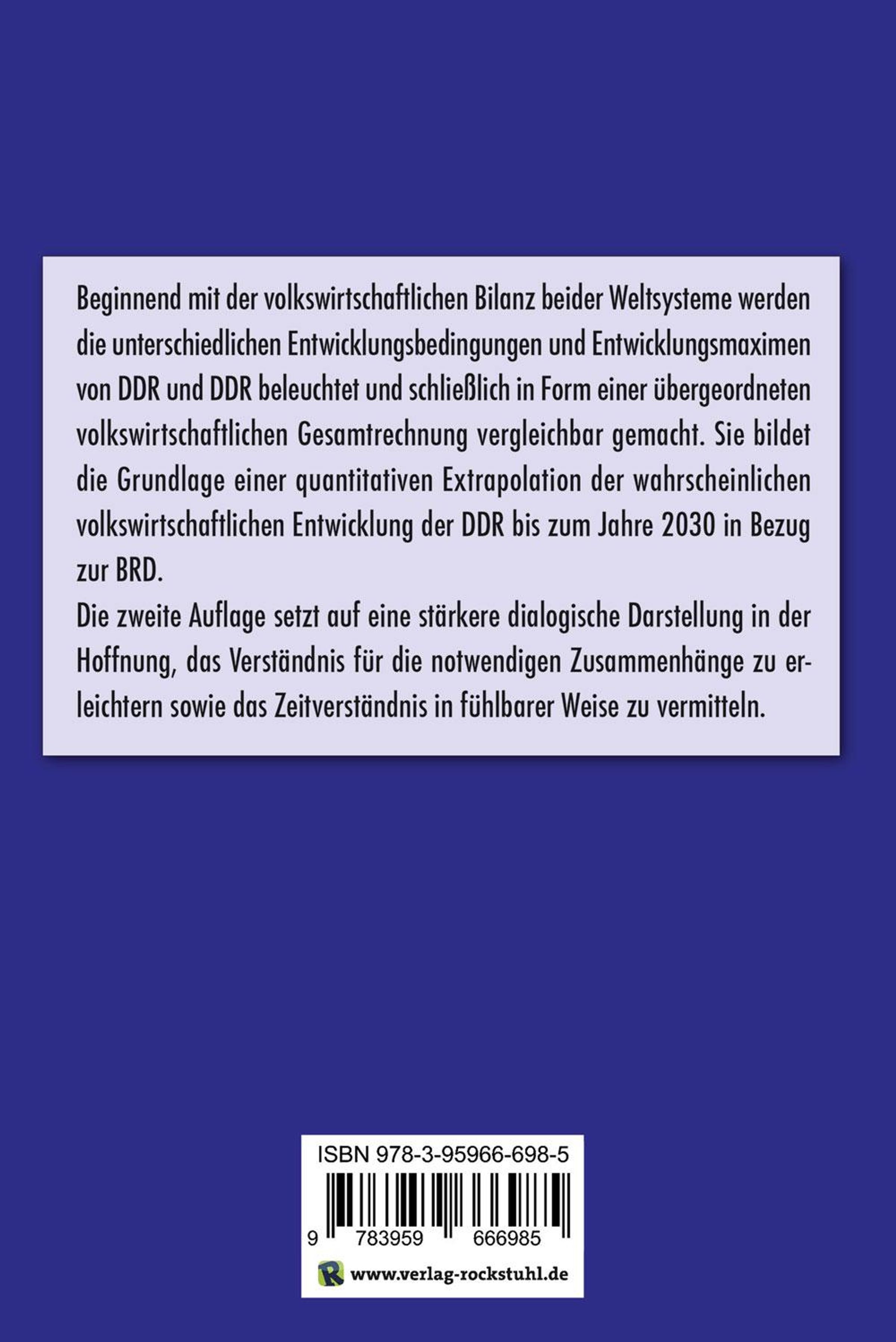 ÜBER DAS BUCH: Beginnend mit der volkswirtschaftlichen Bilanz beider Weltsysteme werden die unterschiedlichen Entwicklungsbedingungen und Entwicklungsmaximen von DDR und DDR beleuchtet und schließlich in Form einer übergeordneten volkswirtschaftlichen Gesamtrechnung vergleichbar gemacht. Sie bildet die Grundlage einer quantitativen Extrapolation der wahrscheinlichen volkswirtschaftlichen Entwicklung der DDR bis zum Jahre 2030 in Bezug zur BRD. Die zweite Auflage setzt auf eine stärkere dialogische Darstellung in der Hoffnung, das Verständnis für die notwendigen Zusammenhänge zu erleichtern sowie das Zeitverständnis in fühlbarer Weise zu vermitteln.