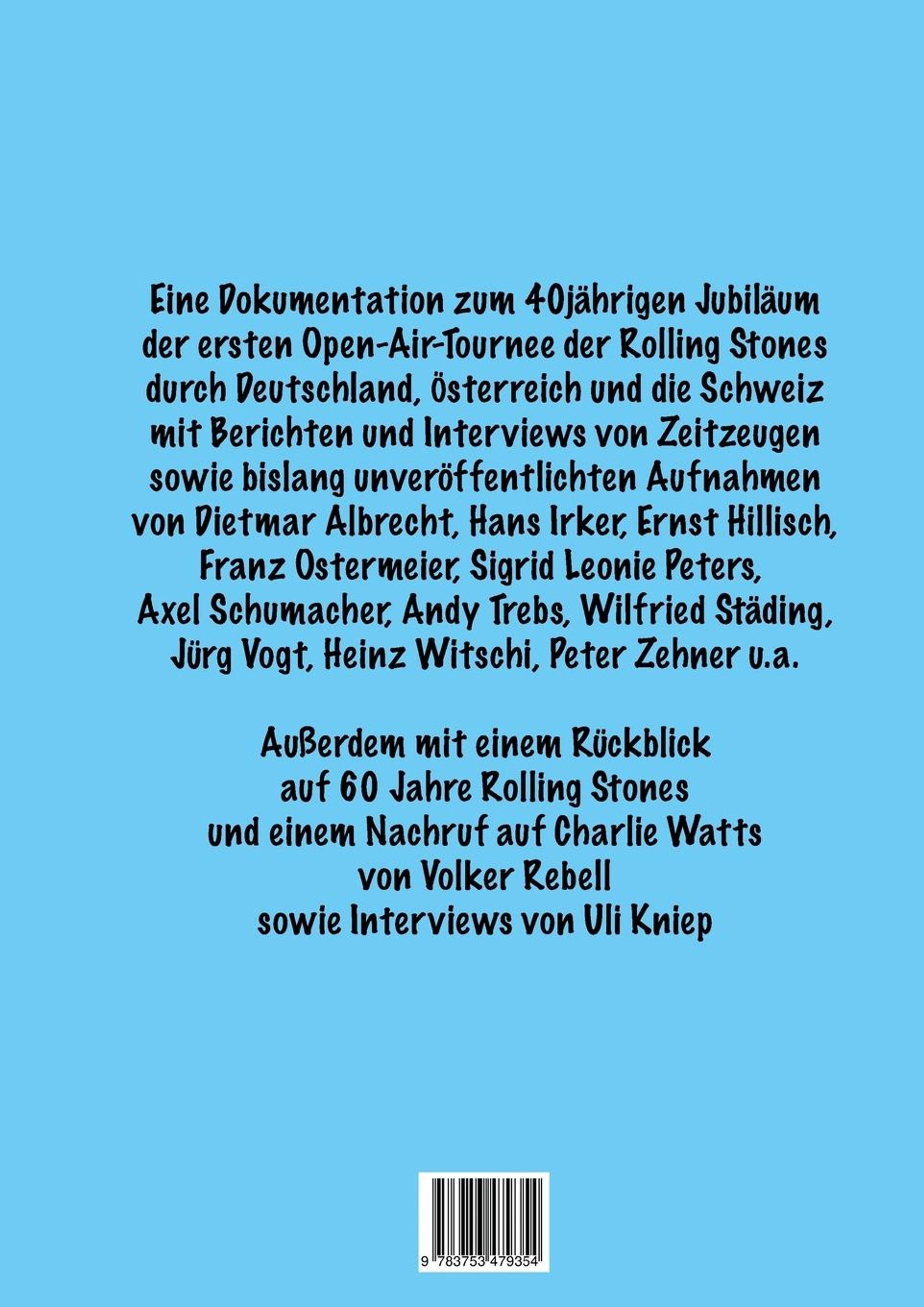 Eine Dokumentation zum 40jährigen Jubiläum der ersten Open-Air-Tournee der Rolling Stones durch Deutschland, Österreich und die Schweiz mit Berichten und Interviews sowie bislang unveröffentlichten Aufnahmen. Außerdem mit einem Rückblick auf 60 Jahre Rolling Stones und einem Nachruf auf Charlie Watts.
