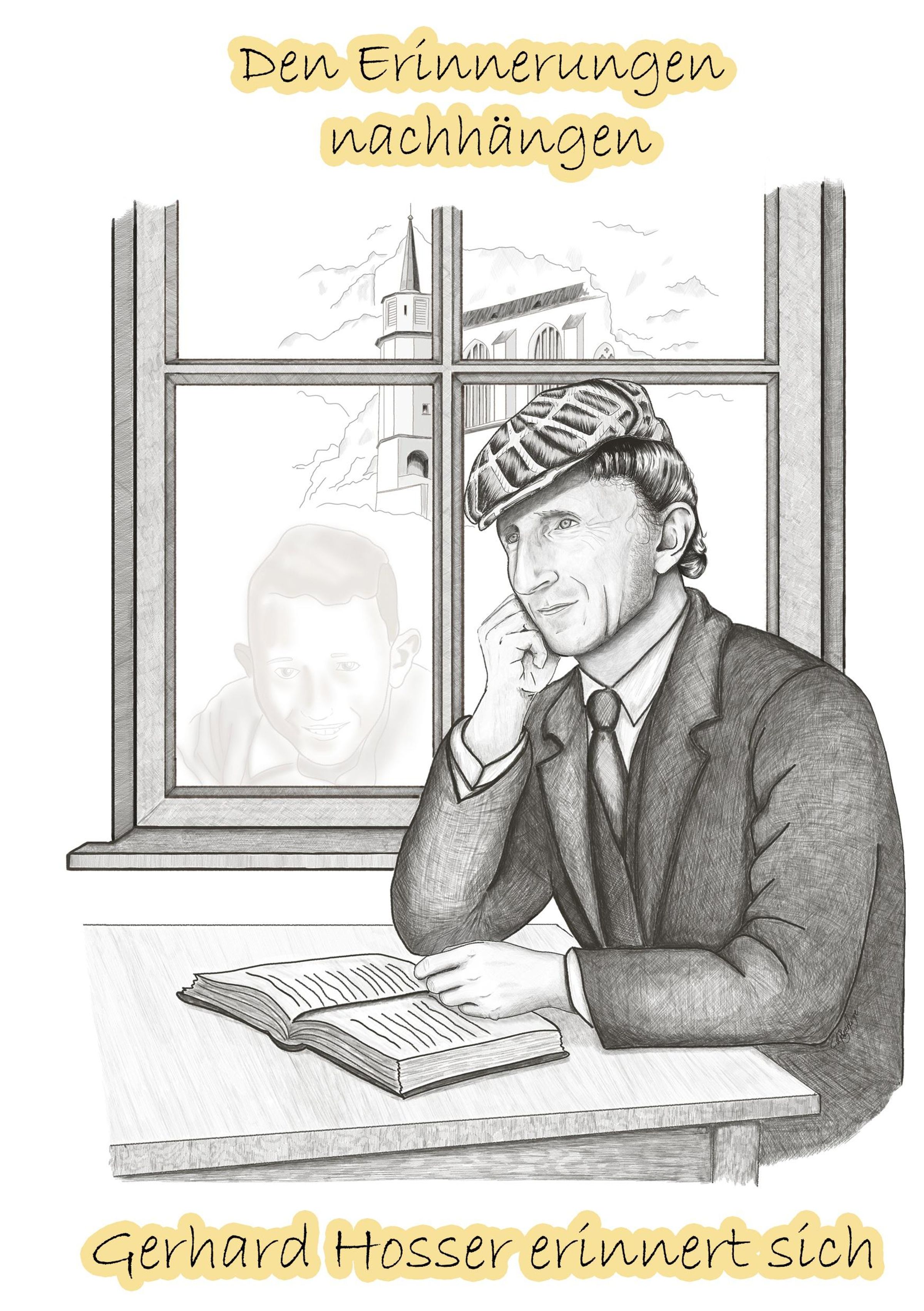 "Den Erinnerungen nachhängen. Gerhard Hosser erinnert sich." Illustration eines Mannes am Tisch mit einem Buch, vorm Fenster., Buch