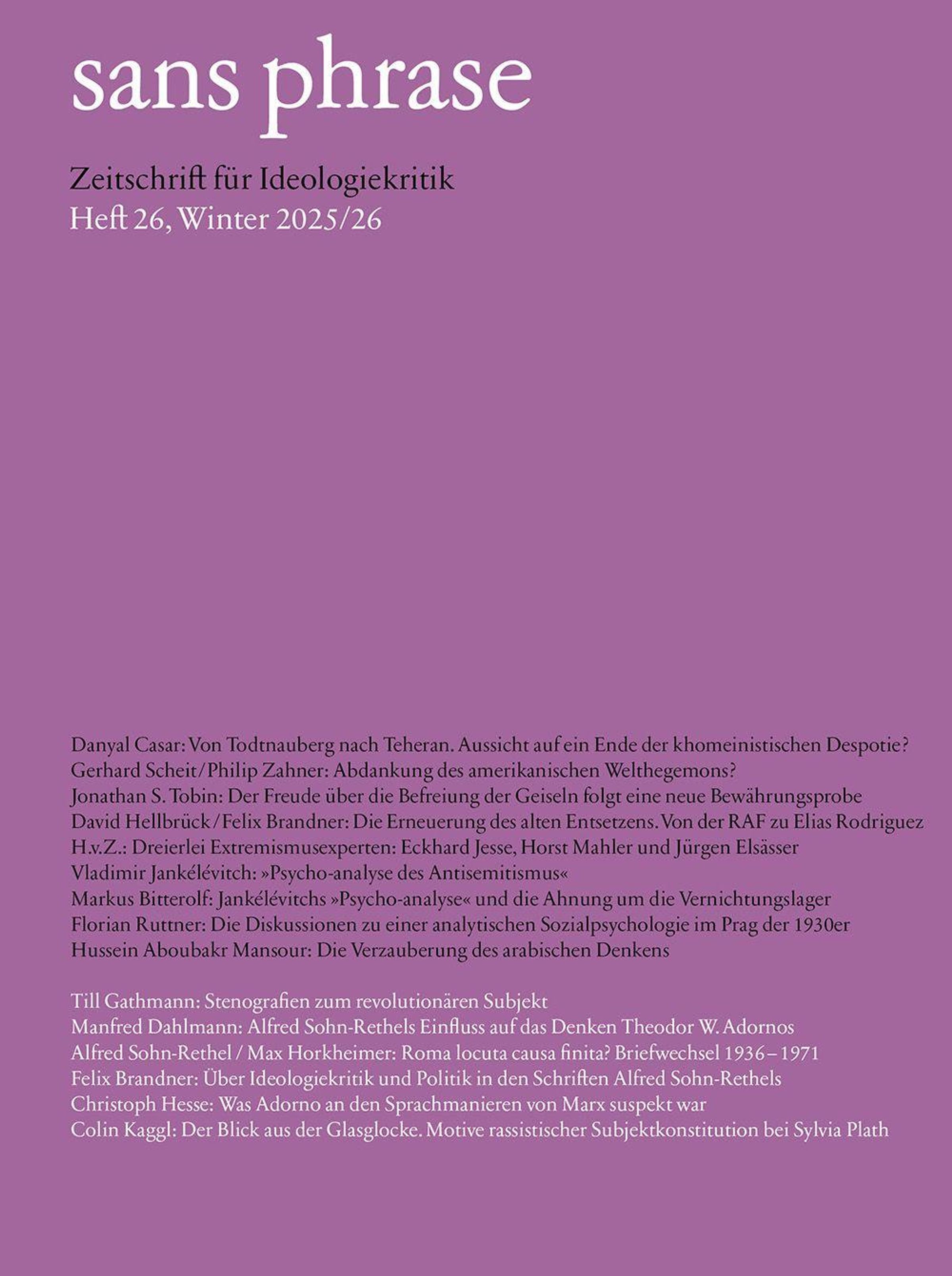 Die enttäuschte Hoffnung auf ein Ende des iranischen Regimes nach der Operation 'Rising Lion' weckt einmal mehr die Erinnerung an das islamische Erwachen im Iran, das sich aus der Krise der Moderne und der europäischen Gegenaufklärung speiste - Im Bann von Donald Trump: Was bedeuten die innen- und außenpolitischen Ambitionen von MAGA für die Hegemonie der USA und die Sicherheit Israels? - Jonathan S. Tobin: Nach der großen Freude über die Freilassung der Geiseln folgt die Bewährungsprobe für Trumps Friedensplan - Von Daniela Klette bis Elias Rodriguez: Während Deutschland noch ein letztes Mal das Schreckgespenst der RAF beschwört, schreiten die amerikanischen Erben des bewaffneten Kampfes bereits wieder zur Tat gegen die Juden - Eckhard Jesse, Horst Mahler und Jürgen Elsässer: drei Extremismusexperten präsentieren ihre Einfallslosigkeit - Um eine Form von intellektueller Gegenwehr aus dem Geist der Résistance handelt es sich bei Vladimir Jankélévitchs Psycho-analyse des Antisemitismus - Jankélévitchs Herangehensweise ist der dringliche Versuch, den Antisemitismus im Moment des Übergangs von der Ahnung zum Wissen um die Realität der Vernichtungslager zu bestimmen - Die Diskussionen über Revolutionstheorie und Feindaufklärung um Otto Fenichel und die Historická skupina erweisen das Prag der 1930er Jahre als geistiges Zentrum des Freudomarxismus - Weshalb es sich bei der Krise der arabischen Welt weniger um eine Geschichte des Niedergangs oder der Stagnation à la Bernhard Lewis handelt, sondern um das Scheitern der Moderne, die über den marxistischen Revolutionsimport zur Apokalypse des Djihad führt - Theologie und Philosophie, die einmal überholt schienen, erhalten sich am Leben, weil der Augenblick ihrer Verwirklichung versäumt ward: davon zeugen nicht zuletzt die theologischen Implikationen des Begriffs des revolutionären Subjekts - Dass die Kritische Theorie materialistisch ist, macht der Einfluss deutlich, den Alfred Sohn-Rethel auf das Denken Theodor W. Adornos nahm - Roma locuta causa finita?, so lautet die Frage, die sich anlässlich der Briefe zwischen Alfred Sohn-Rethel und Max Horkheimer aus den Jahren 1936-1971 stellt - Über die merkwürdige Diskrepanz zwischen Sohn-Rethels Begeisterung für den Maoismus und der Radikalität seiner Ideologiekritik - Was Adorno an den Sprachmanieren von Marx suspekt war - Der bevormundenden Pseudopädagogik, die Sylvia Plaths Die Glasglocke des Rassismus und Sexismus zeiht, muss entgehen, was dieses Werk an Einsichten in die Subjektkonstitution enthält u. a.