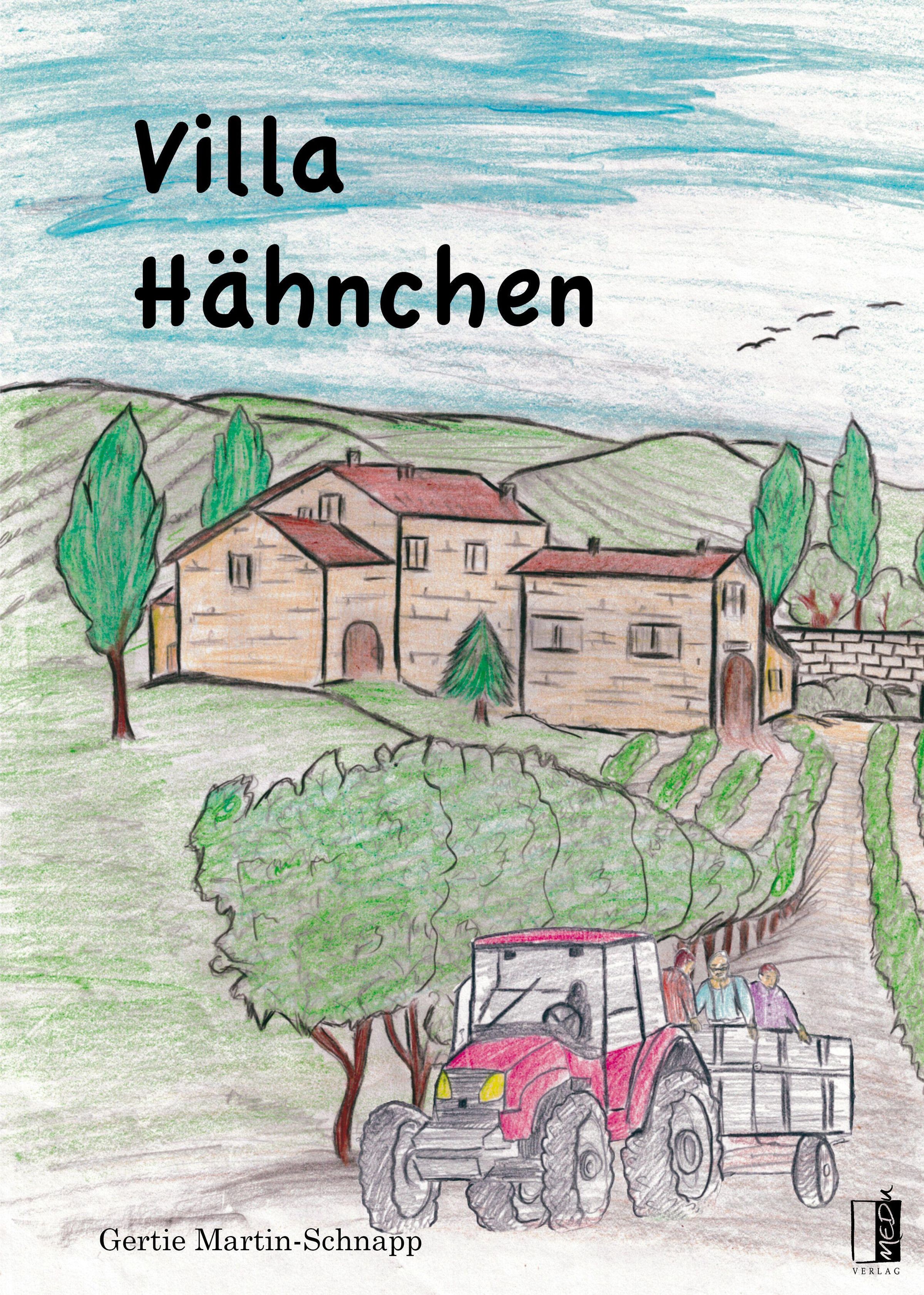 Text: "Villa Hähnchen" und "Gertie Martin-Schnapp". Illustration: Landschaft mit Häusern, Hügeln, Traktor und Bäumen., Buch