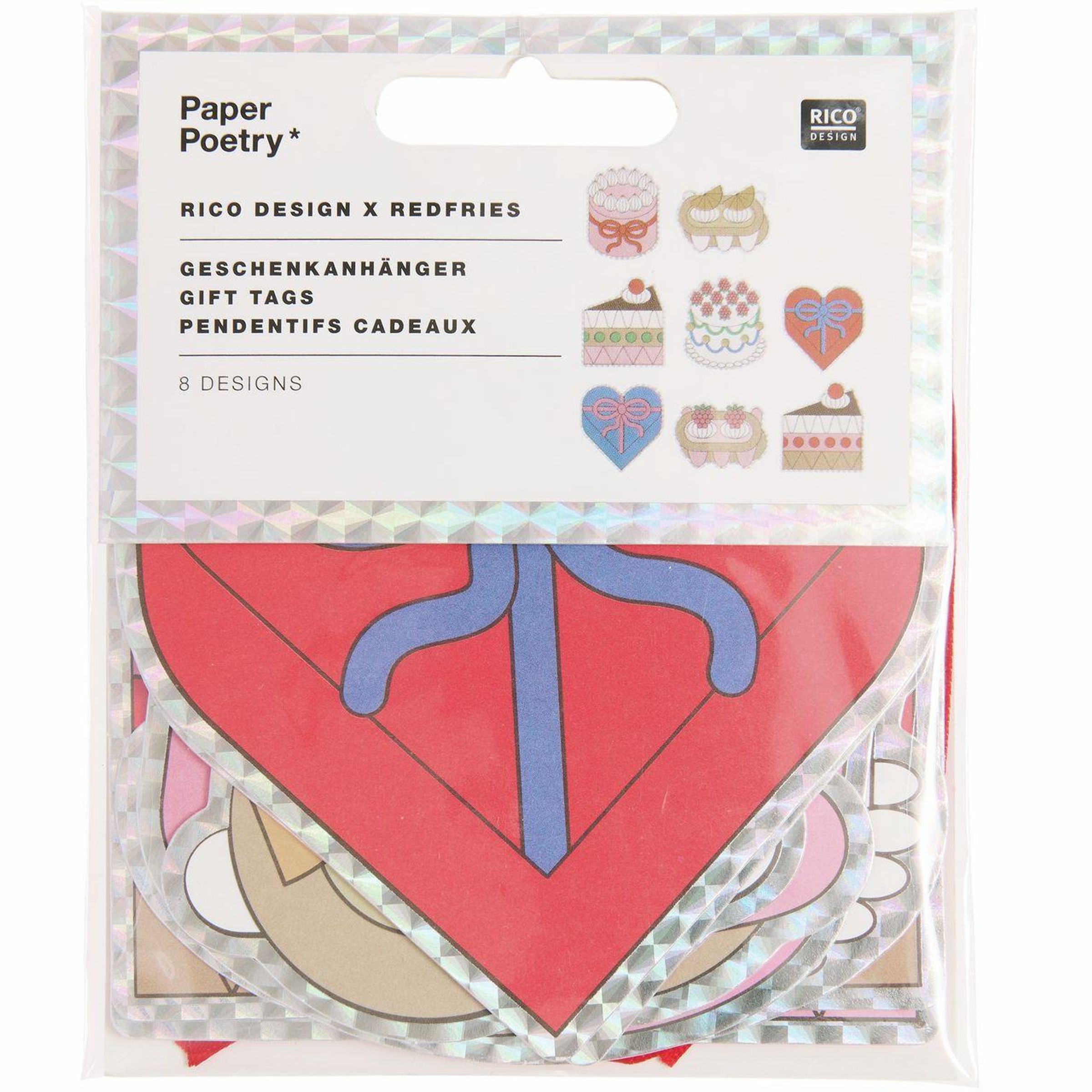 Die Geschenkanhänger in acht unterschiedlichen Designs bringen eine dekorative Ergänzung zu verpackten Präsenten. Jedes Motiv ist mit einem Satinband ausgestattet, das beim Befestigen einen farbigen Akzent setzt. Die einfarbig rosafarben bedruckten Rückseiten schaffen eine Fläche, auf der sich kurze Nachrichten klar und gut lesbar notieren lassen.