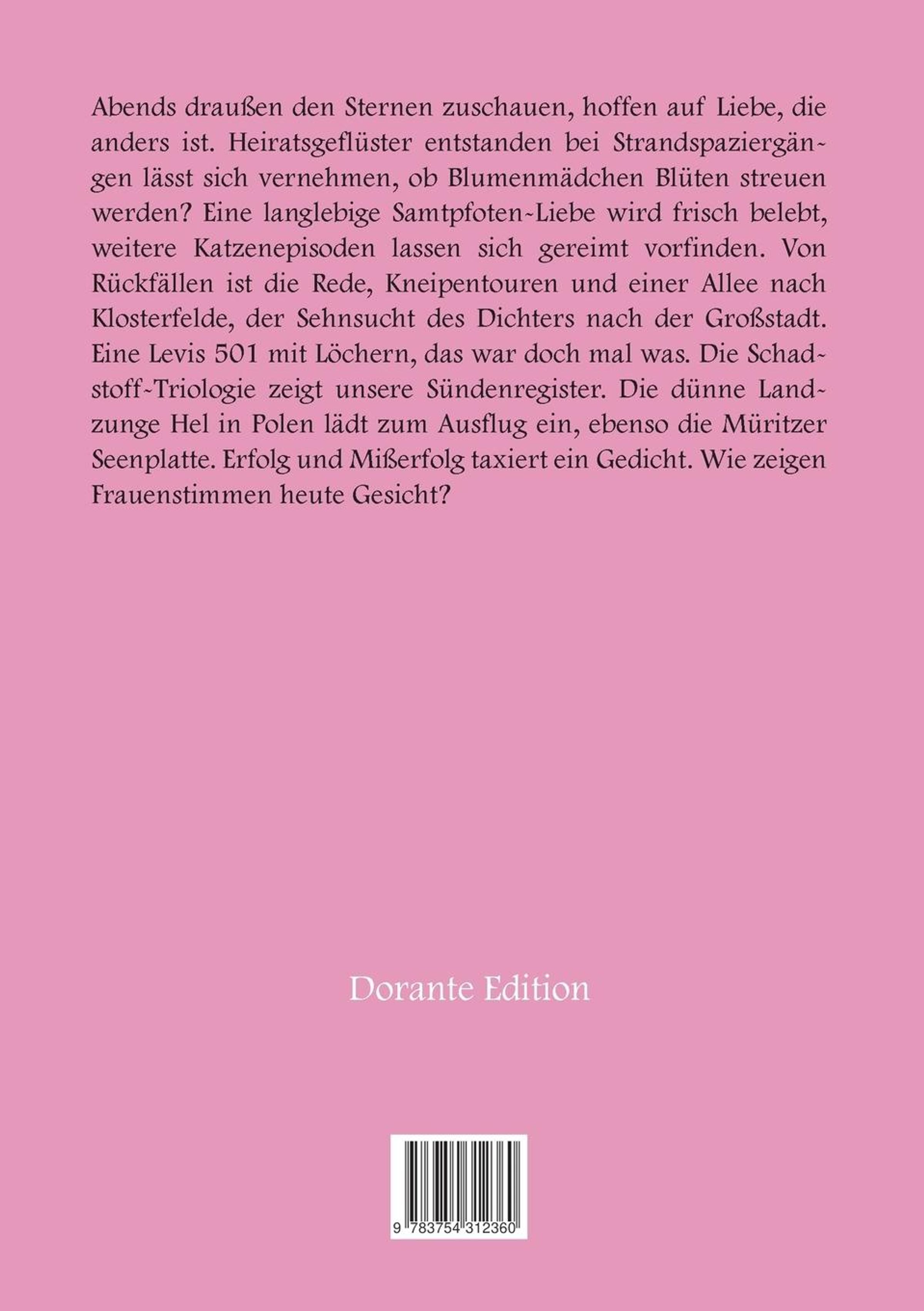 Abends draußen den Sternen zuschauen, hoffen auf Liebe, die anders ist. Heiratsgeflüster entstanden bei Strandspaziergängen lässt sich vernehmen, ob Blumenmädchen Blüten streuen werden? Eine langlebige Samtpfoten-Liebe wird frisch belebt, weitere Katzenepisoden lassen sich gereimt vorfinden. Von Rückfällen ist die Rede, Kneipentouren und einer Allee nach Klosterfelde, der Sehnsucht des Dichters nach der Großstadt. Eine Levis 501 mit Löchern, das war doch mal was. Die Schadstoff-Triologie zeigt unsere Sündenregister. Die dünne Landzunge Hel in Polen lädt zum Ausflug ein, ebenso die Müritzer Seenplatte. Erfolg und Mißerfolg taxiert ein Gedicht. Wie zeigen Frauenstimmen heute Gesicht?