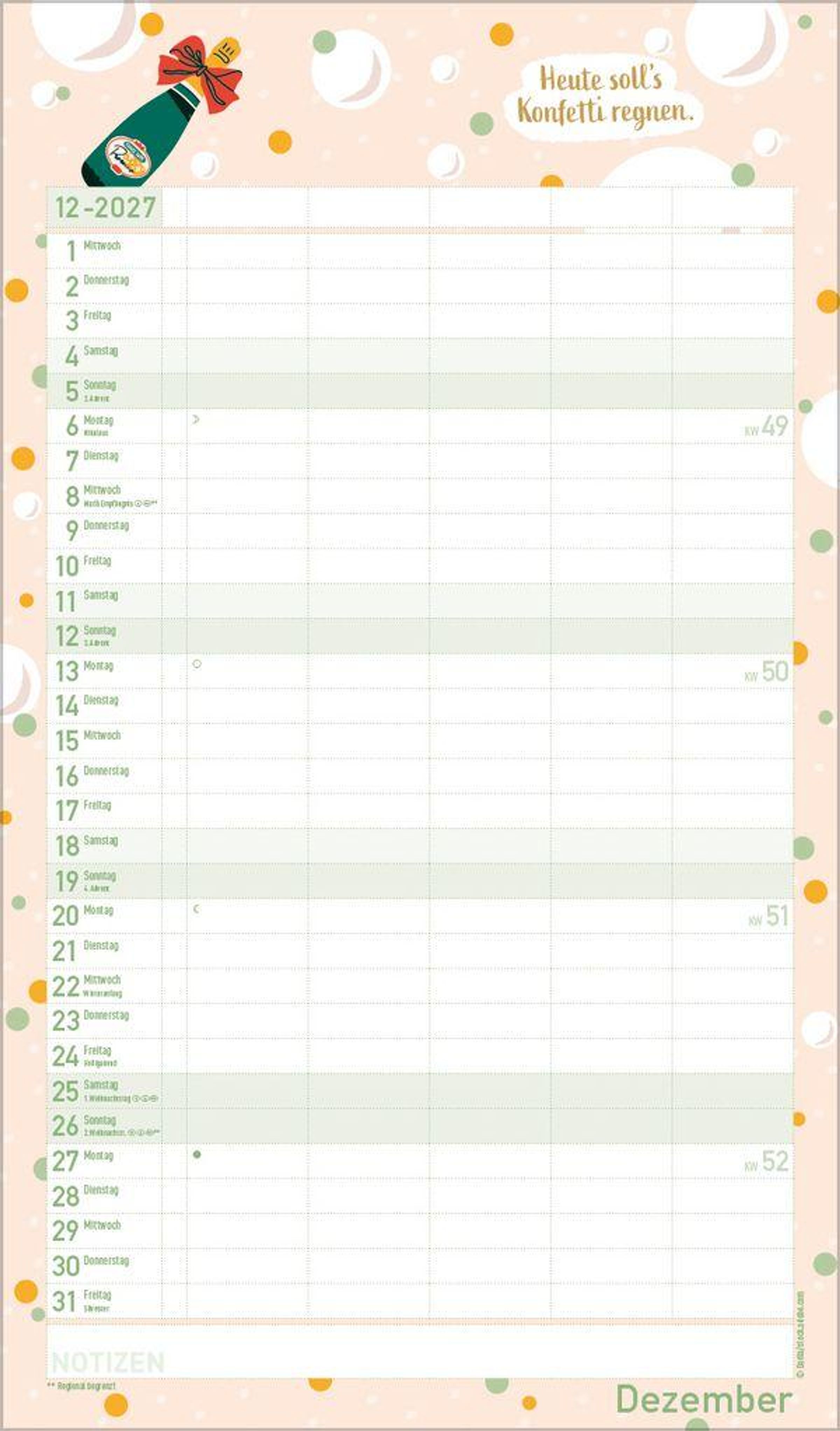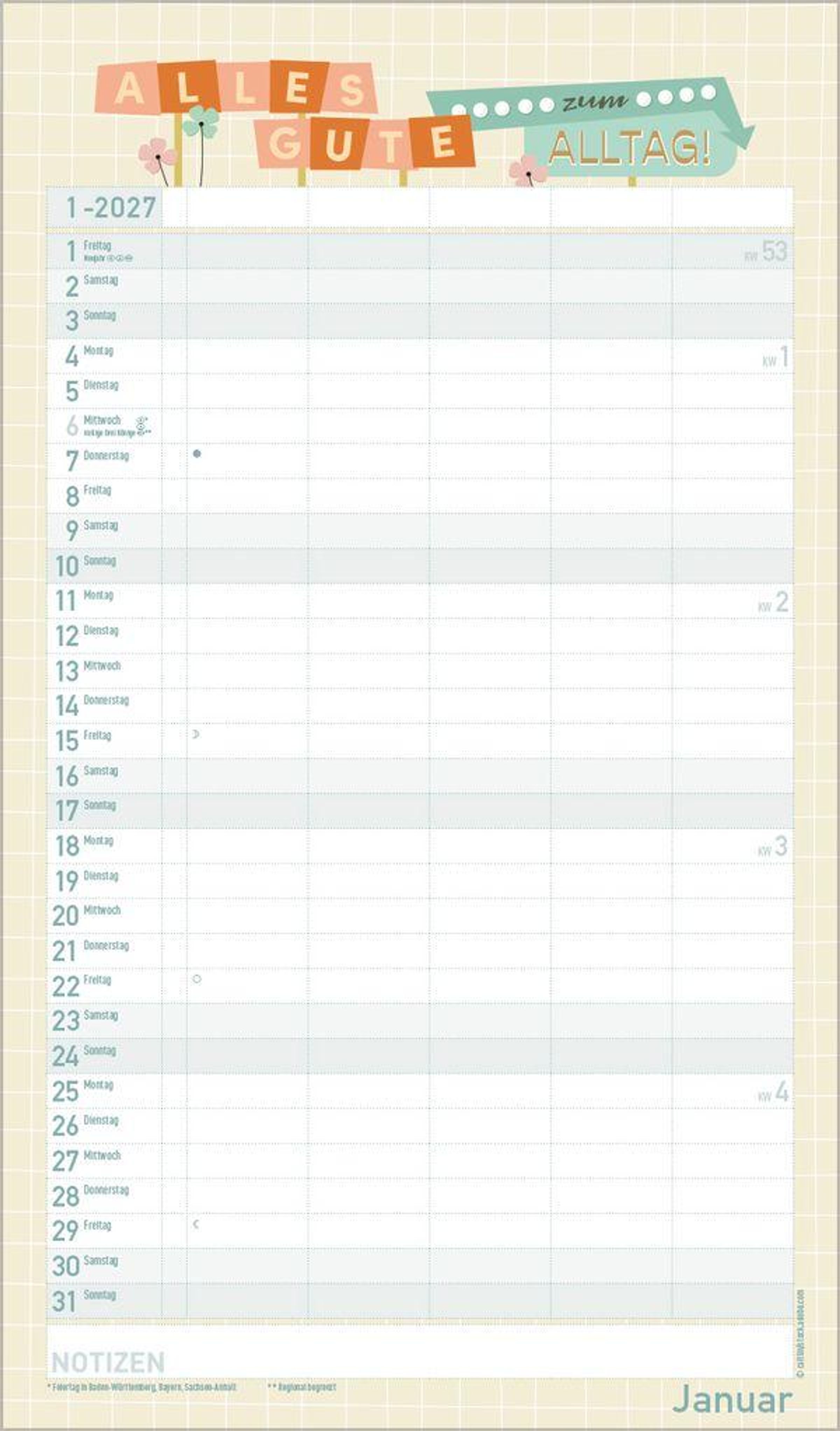 - Familienplaner mit 5 breiten Spalten. Mit Ferienterminen, extra Spalte und Vorschau bis März 2027. Format: 27 x 46 cm