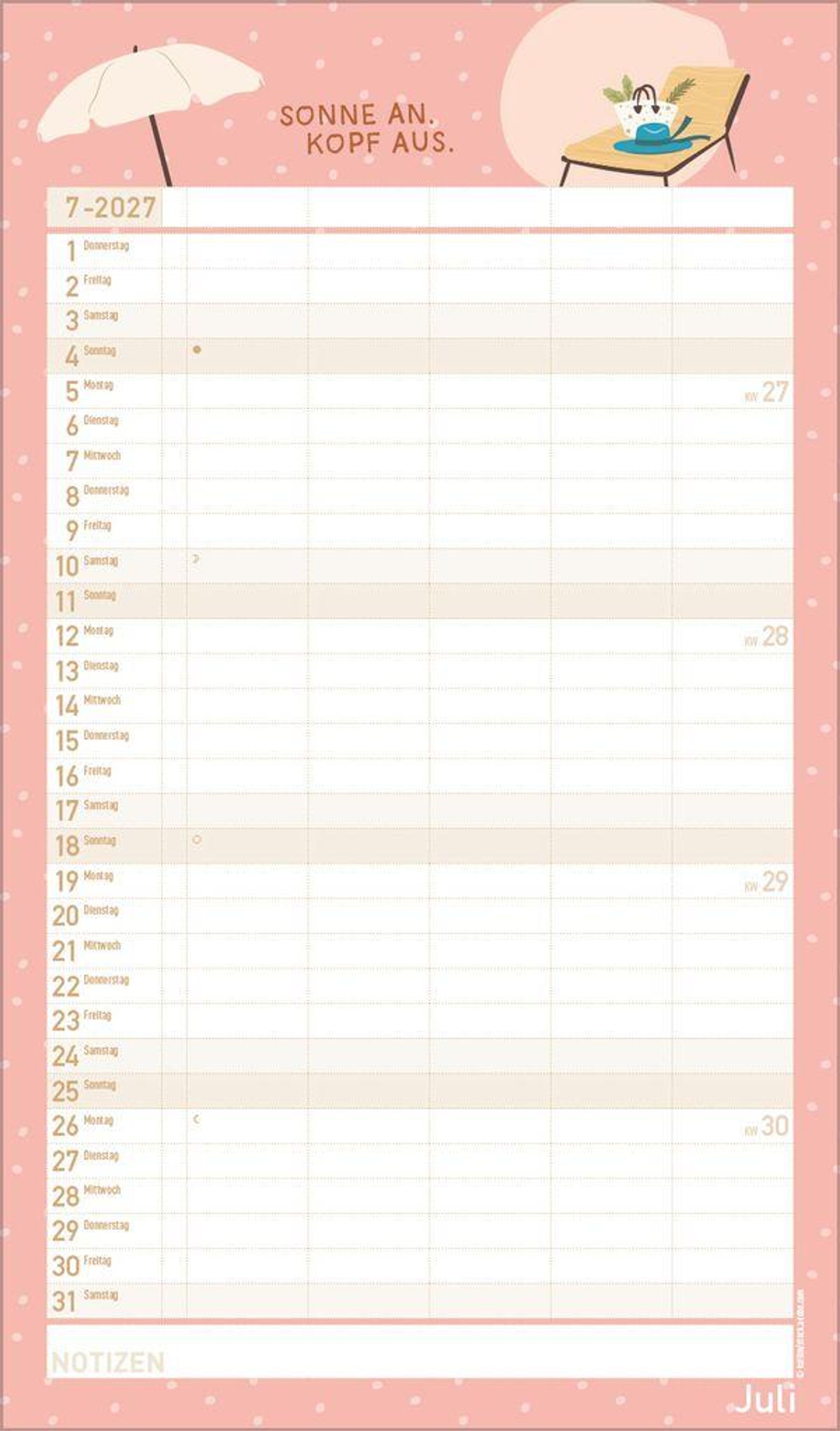 - Farblich hervorgehobene Sonn- und Feiertage sowie Anzeige der Zeitumstellung
